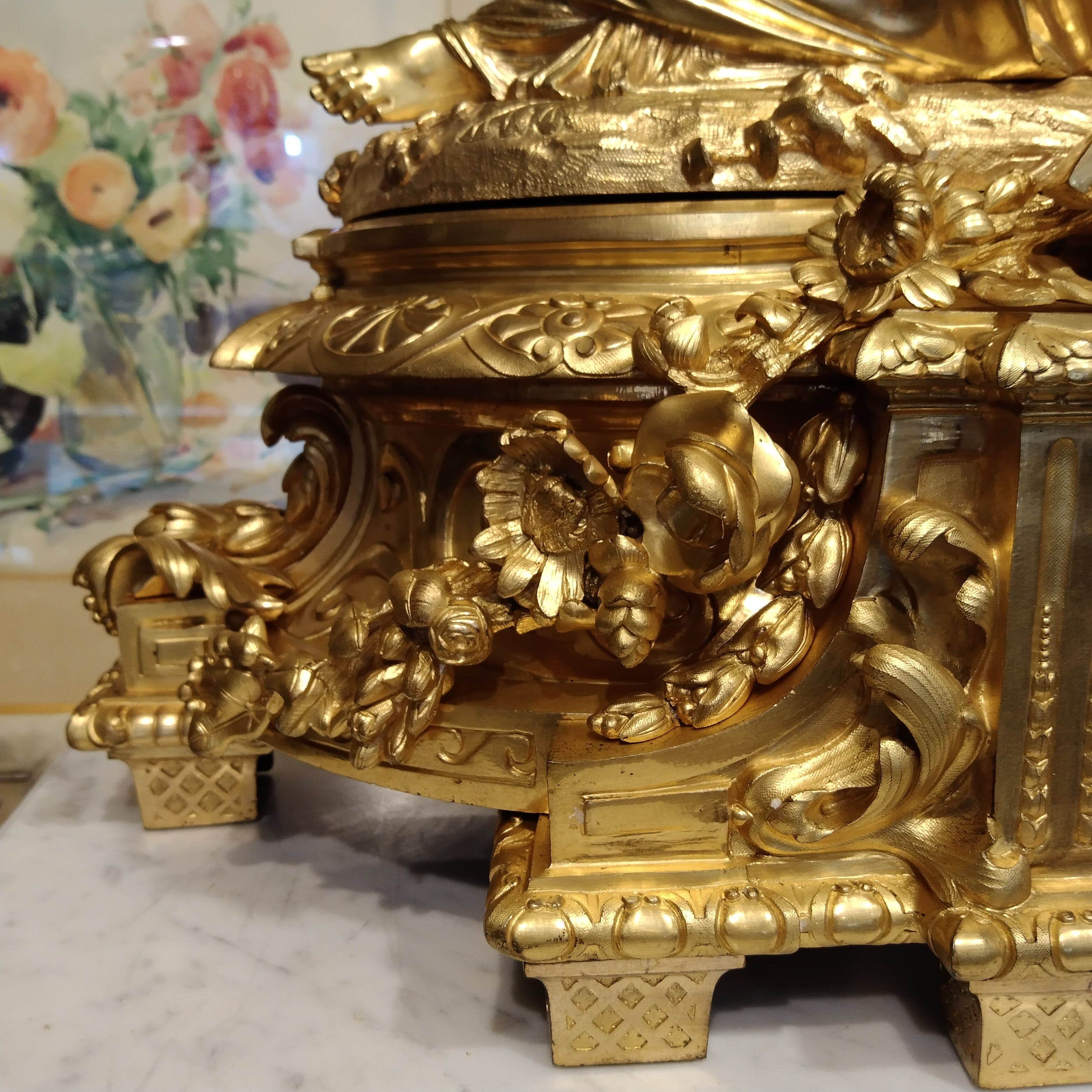 Bellísimo y elegante reloj francés de bronce Ormolú, con delicados decorados con motivos florales , tallados en toda su superficie. La figura representa la popular escena mitológica de Venus desarmando a Cupido.