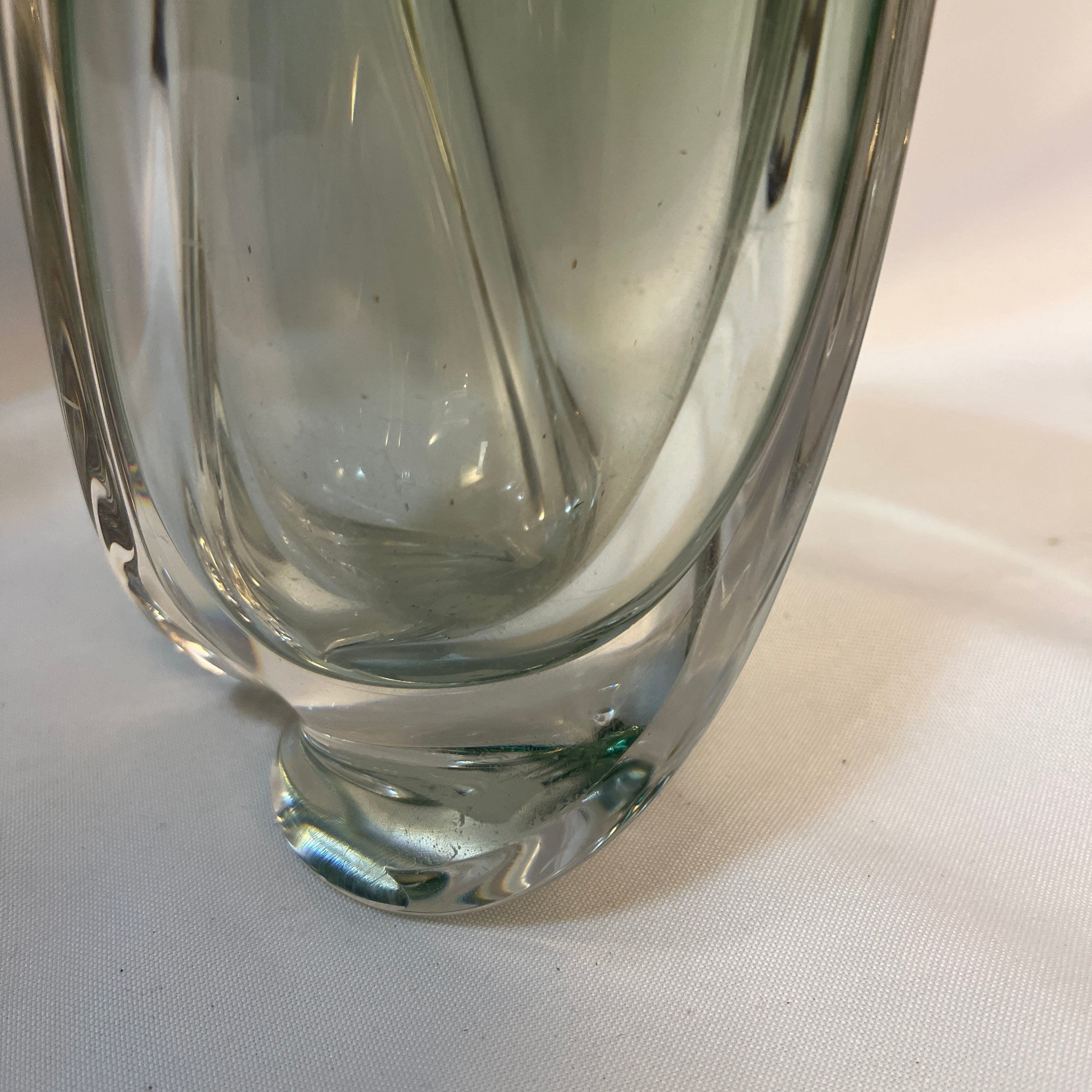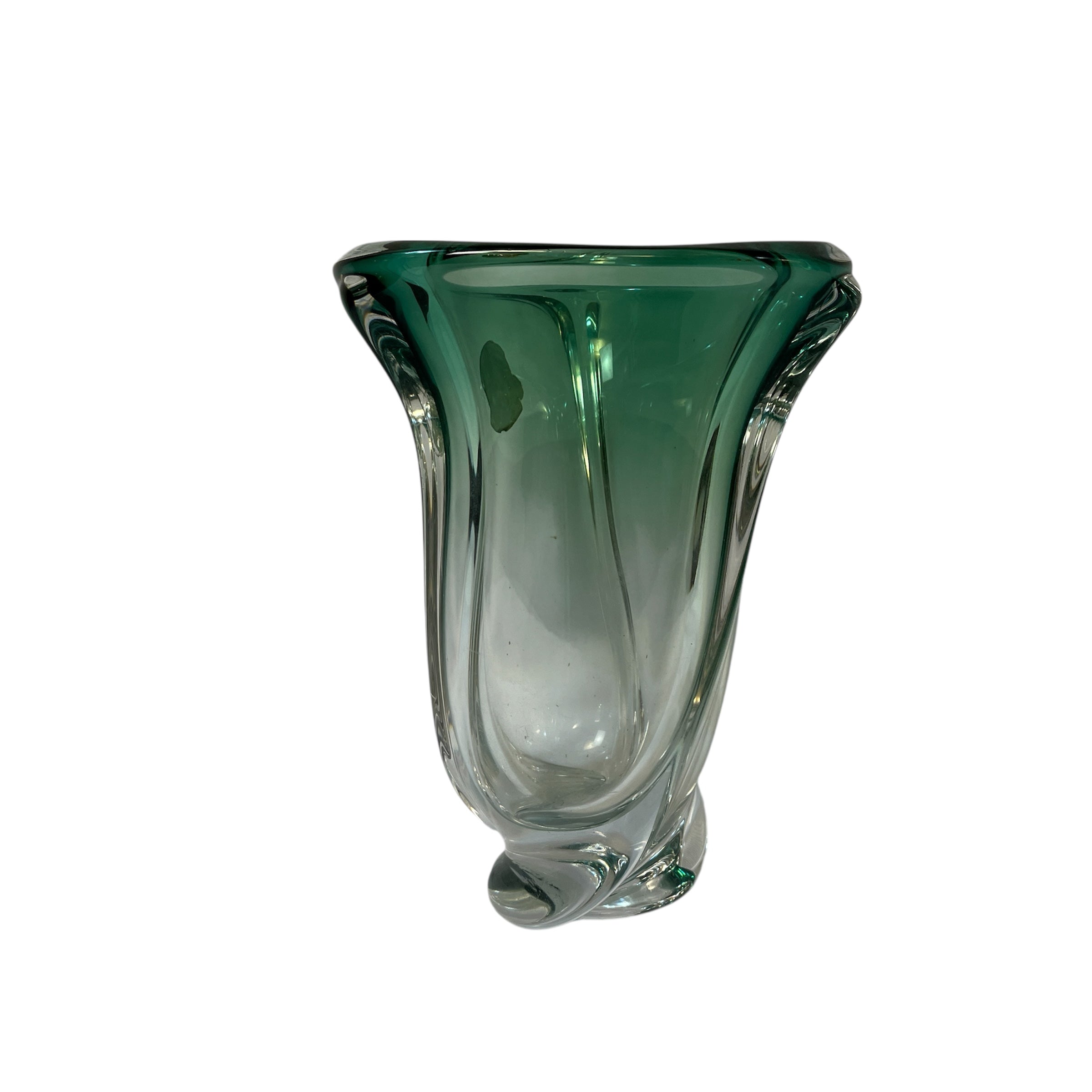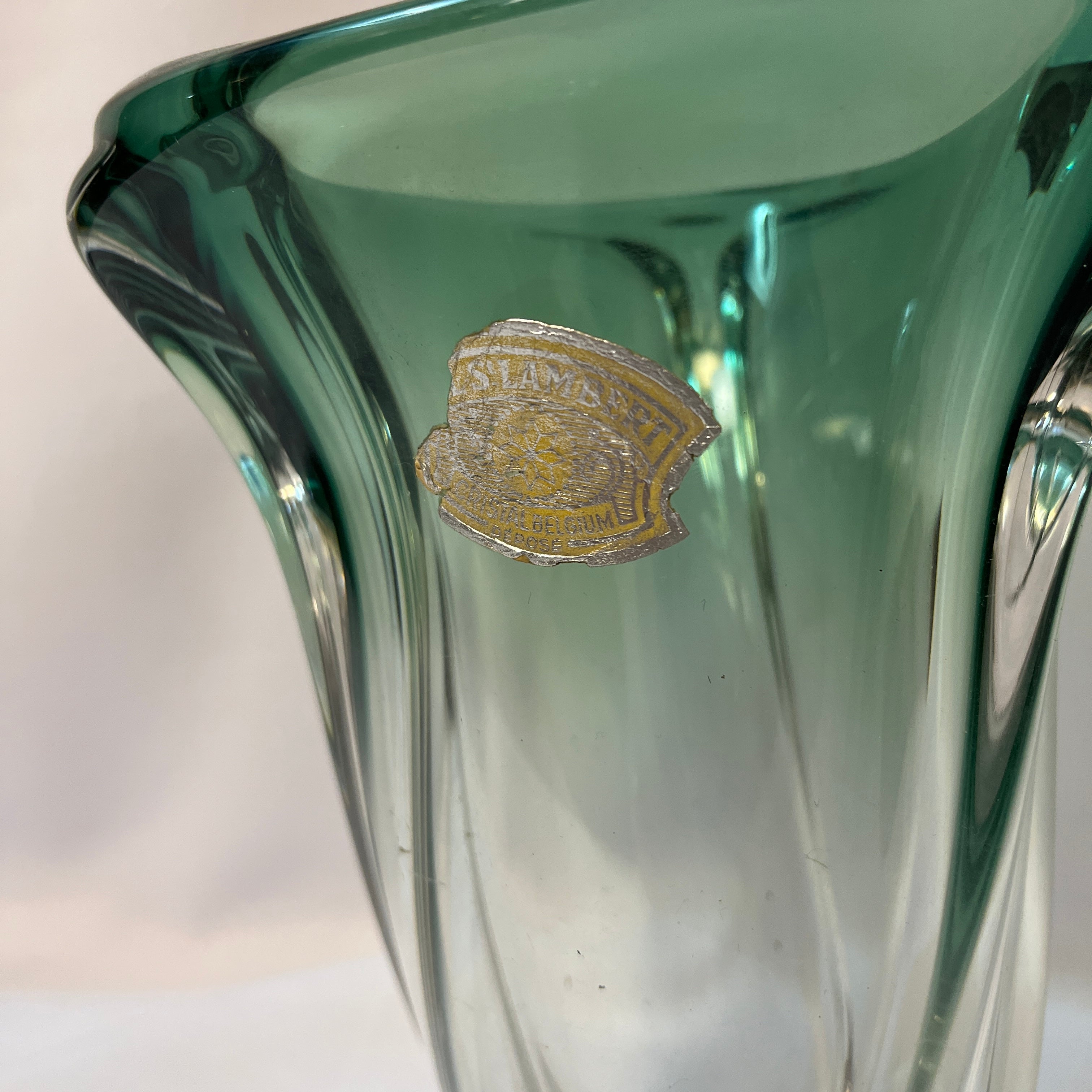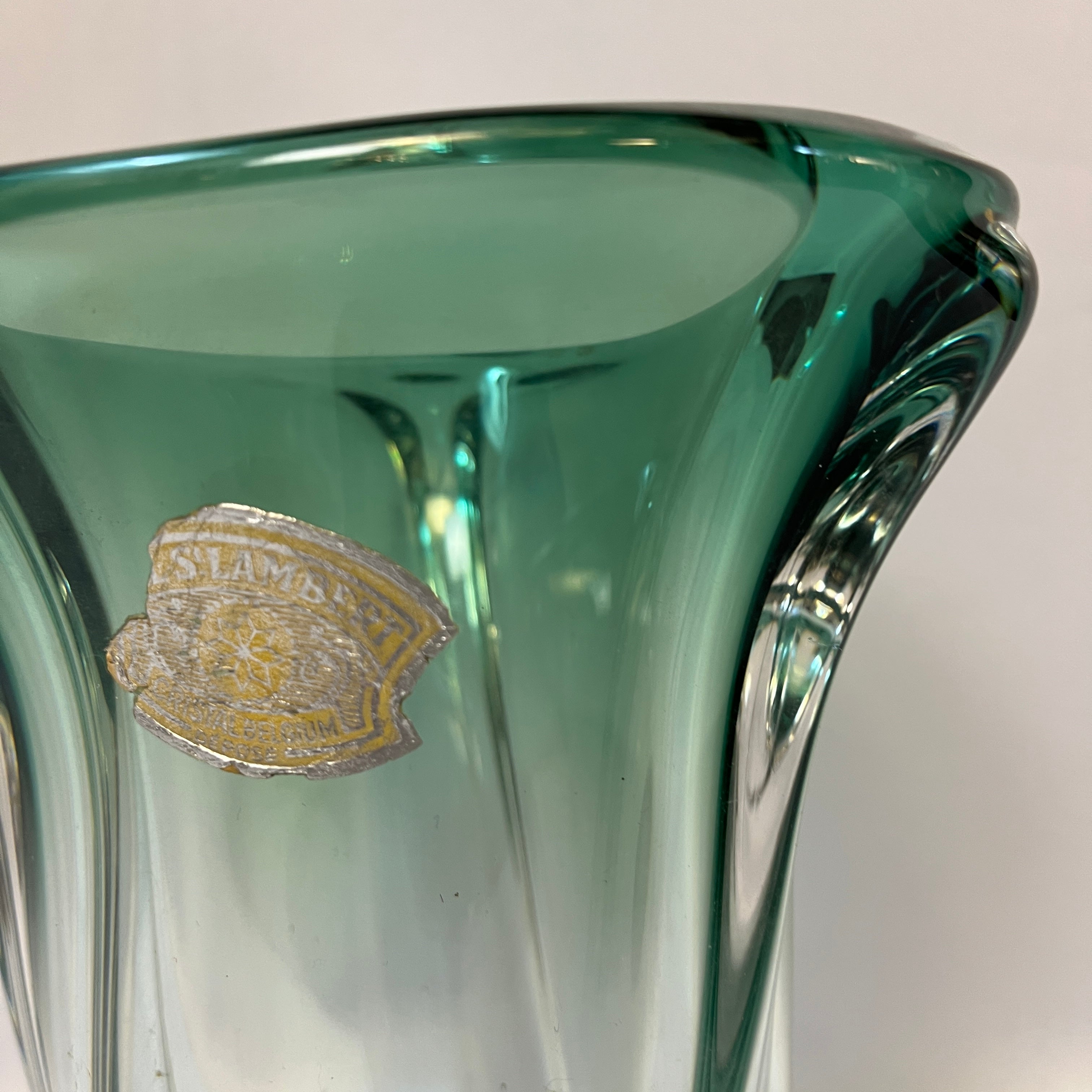 Precioso jarrón de cristal de la prestigiosa marca belga Val Saint Lambert, de un verde decantado y forma de espiral de tres vértices que se juntan en la base de manera perfecta. En una de sus caras se puede apreciar el sello original.