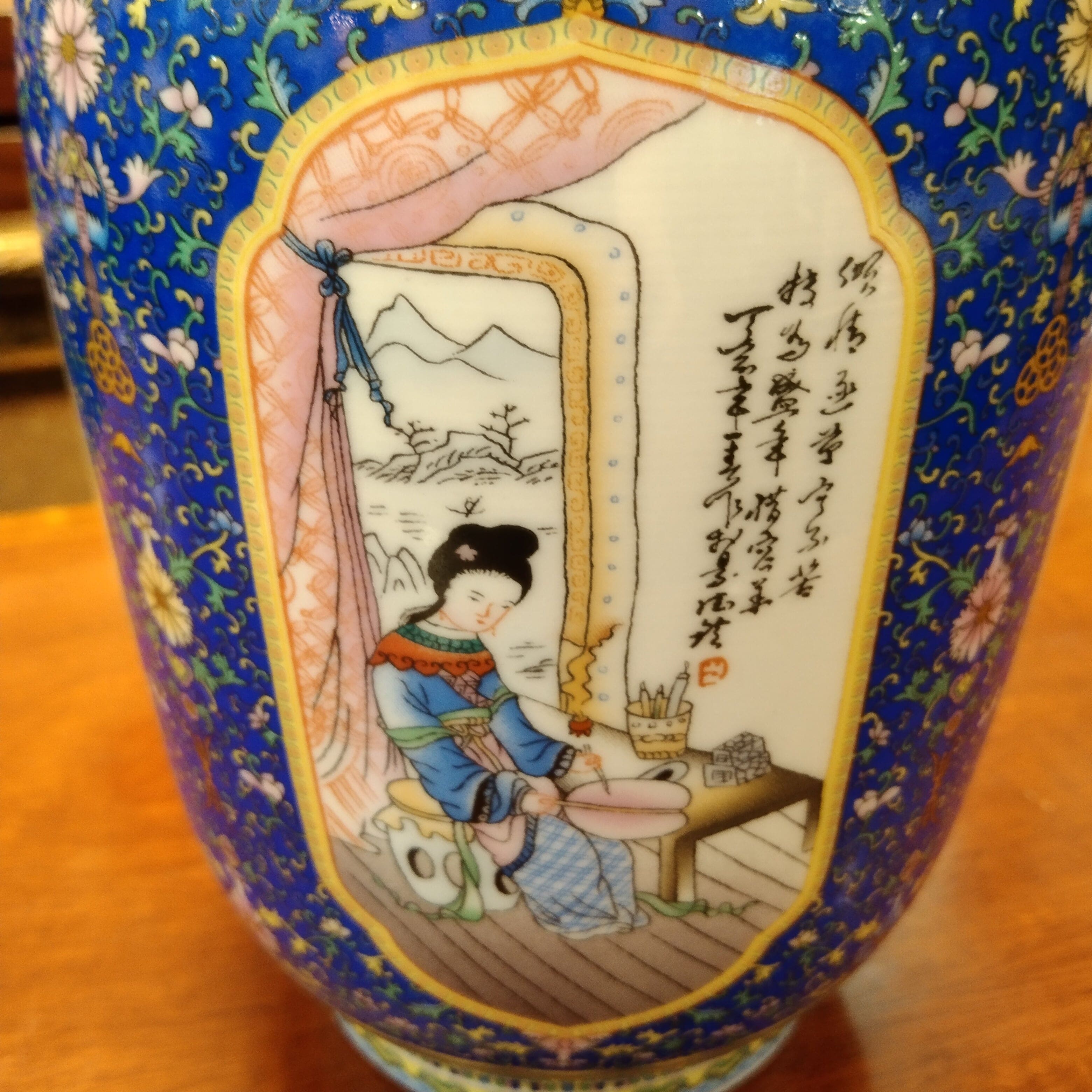 Bellísimo jarrón de porcelana china, esmaltado en azul y con diseños hechos a mano, representando escenas de mujeres realizando distintos oficios, enmarcadas por un detallado patrón floral.