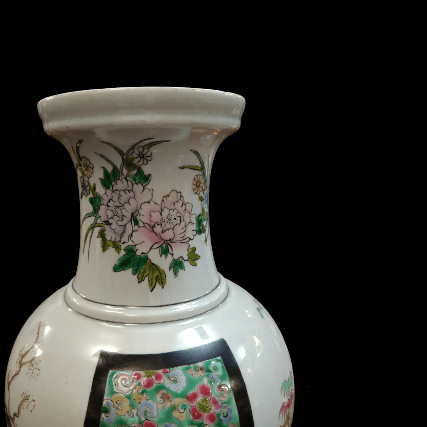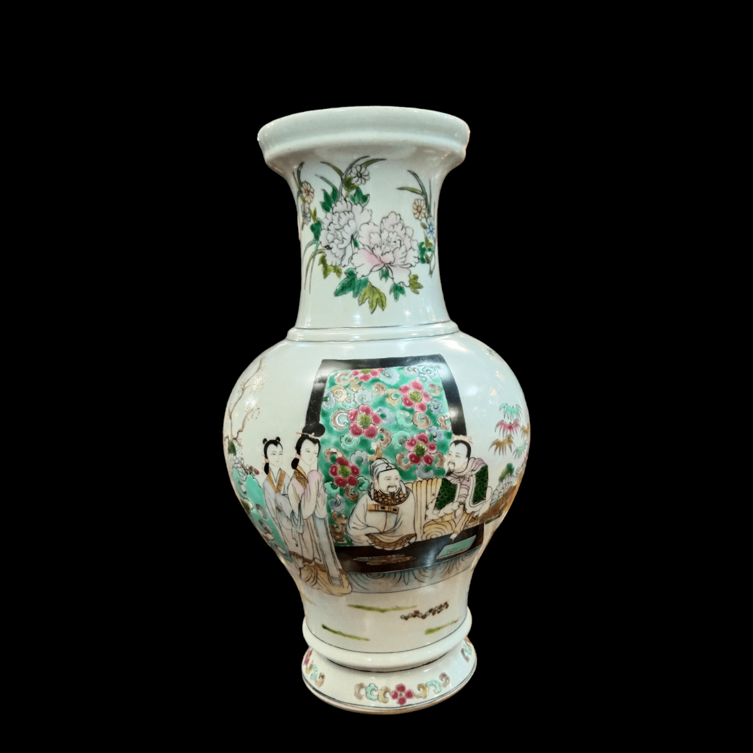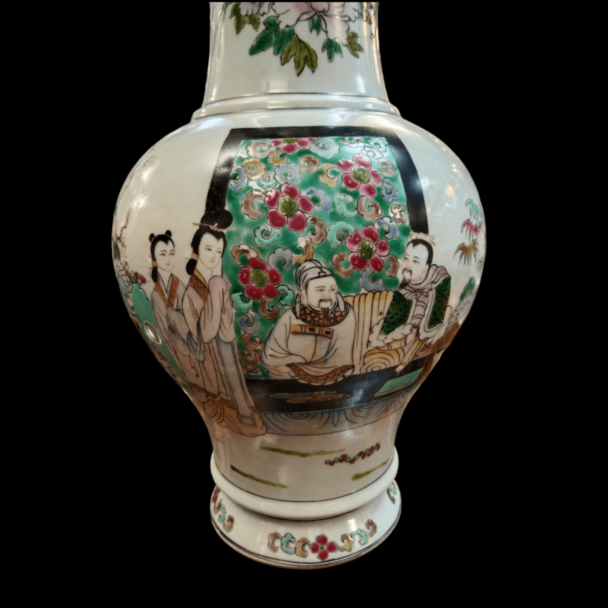 Bello jarrón de porcelana china Qing Kangxi, pintada a mano, representando una escena de la época, en la que la figura central es un señor noble rodeado de sus sirvientes. El jarrón tiene delicados detalles florales en tonos fucsias y verdes.