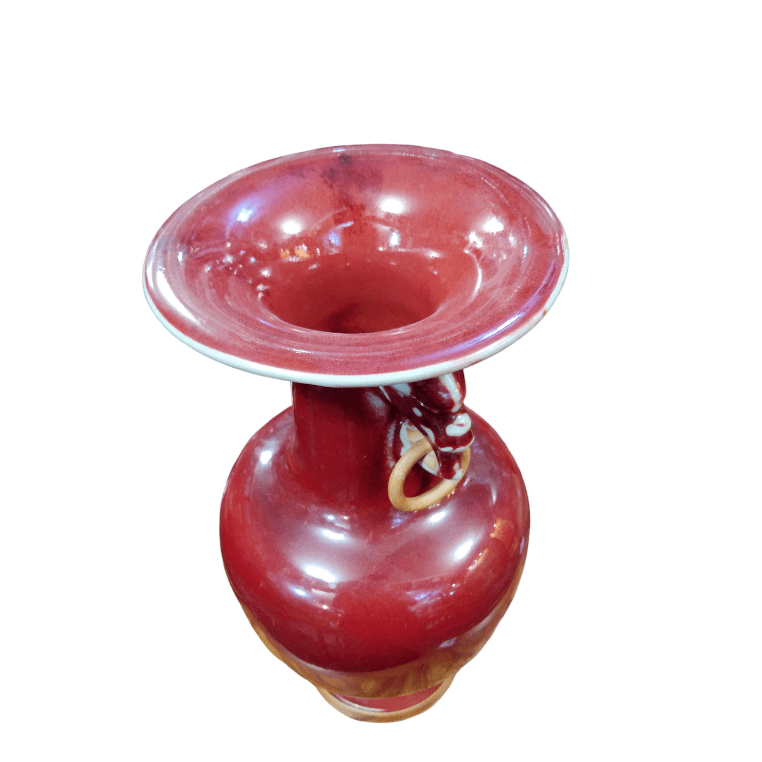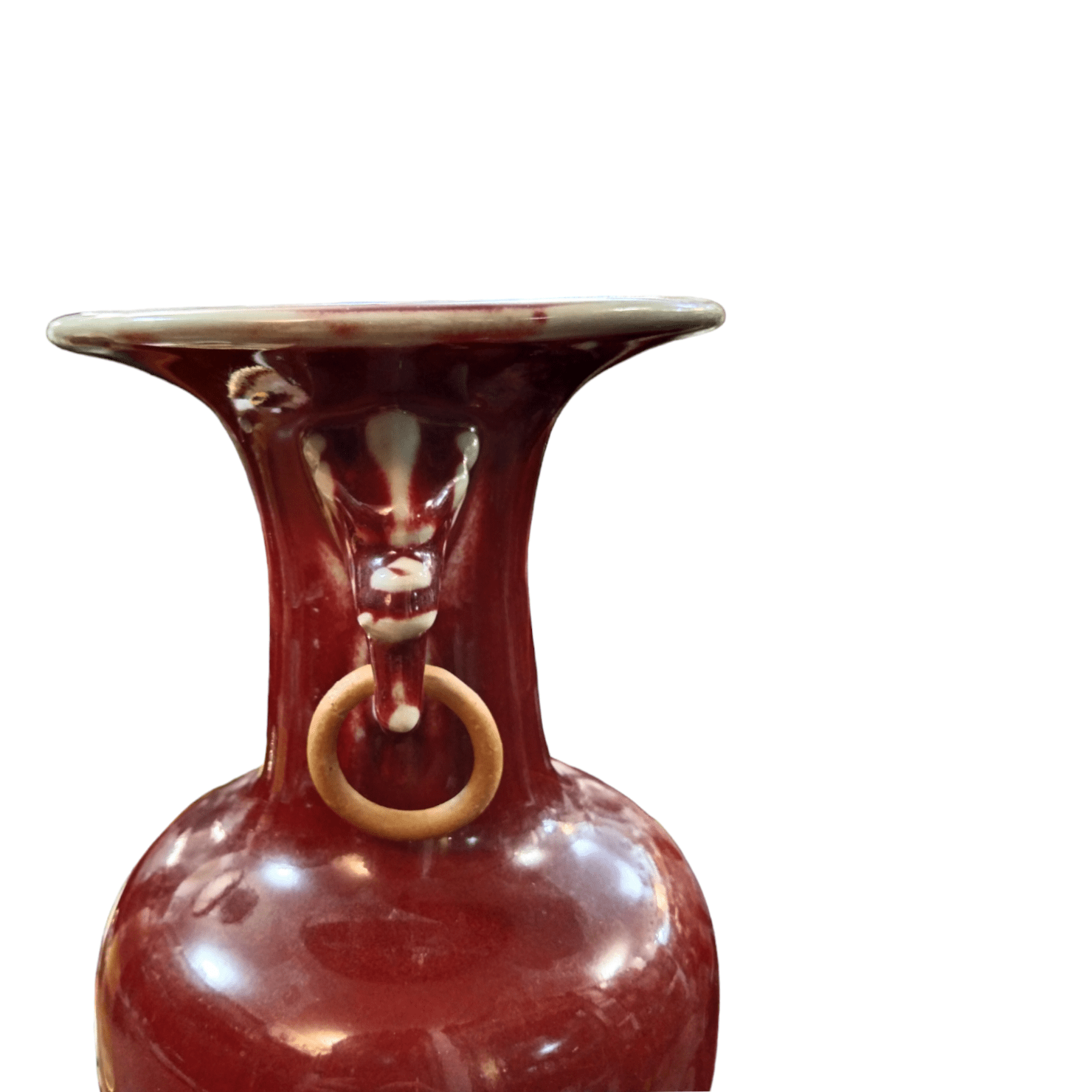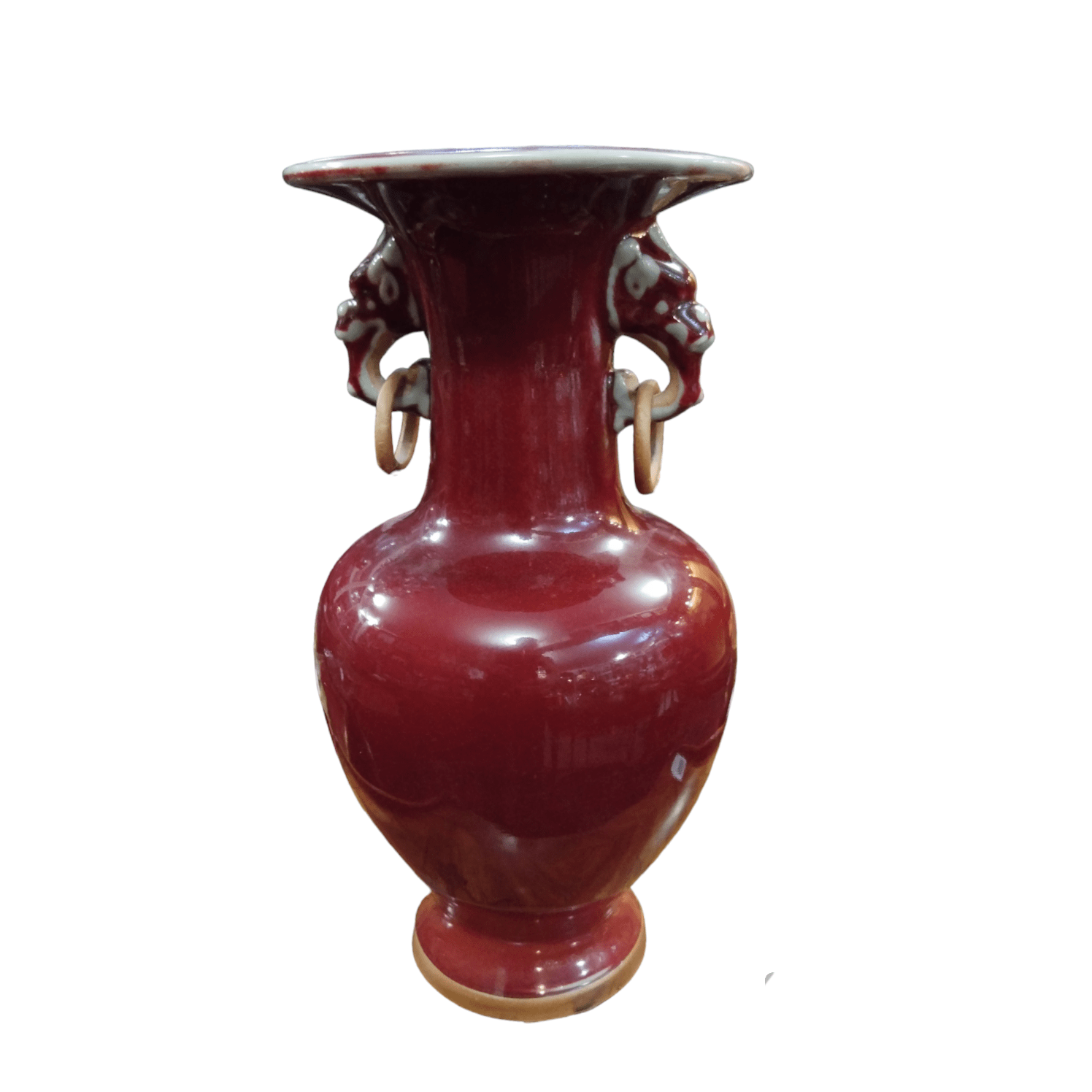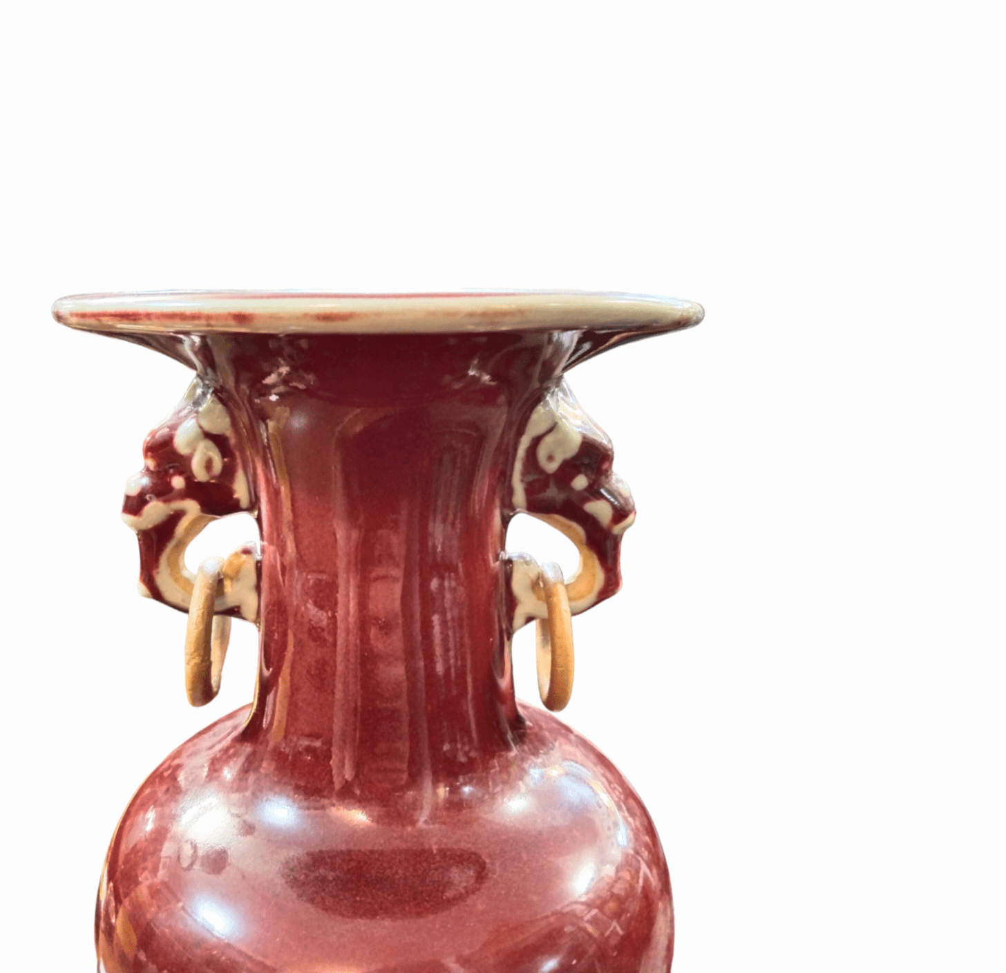 Elegante jarrón de porcelana china boca de trompeta con dos asas en forma de cabezas de dragón con una argolla en su boca. El jarrón tiene un bello color rojo en su superficie, caracteristico de la técnica sang de beouf.