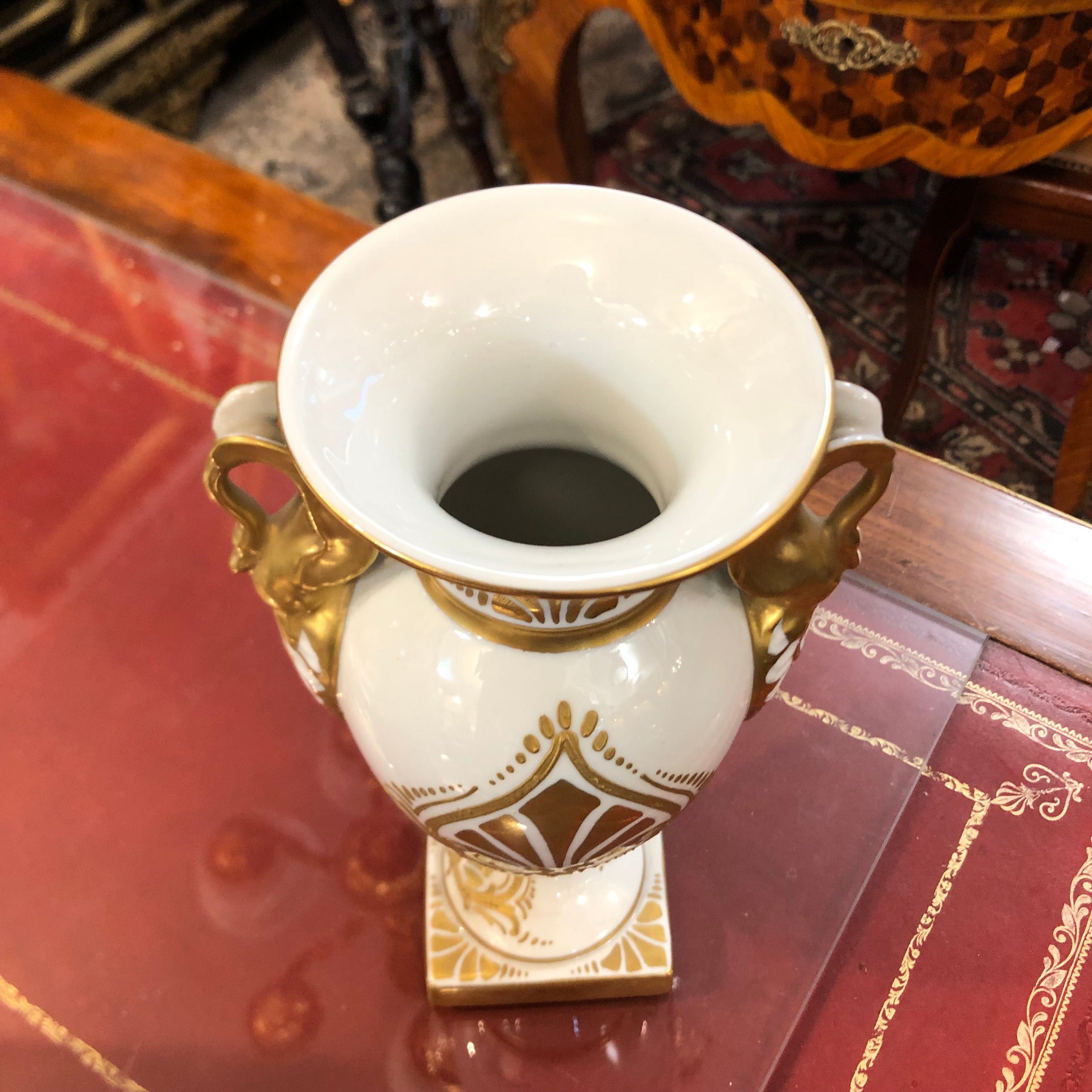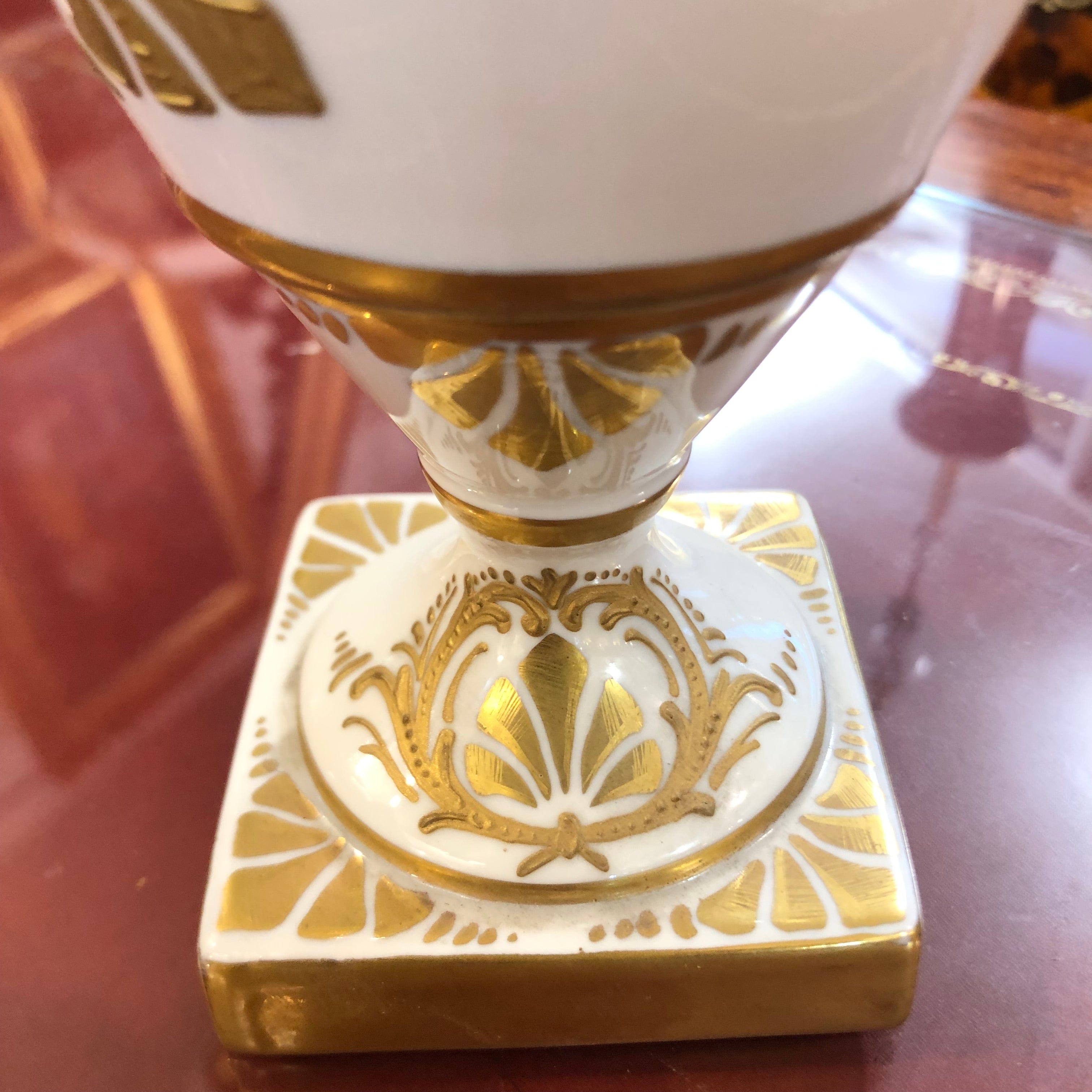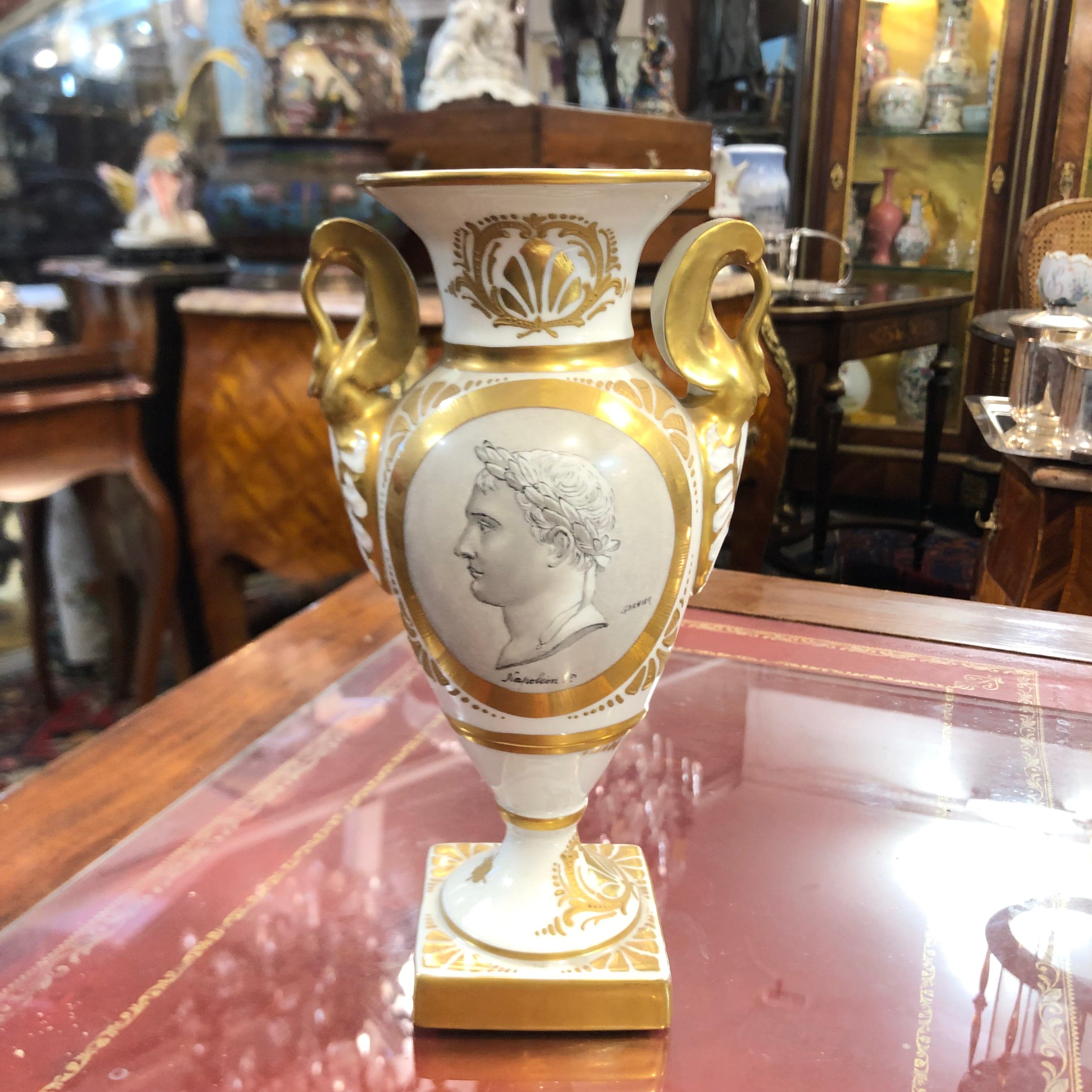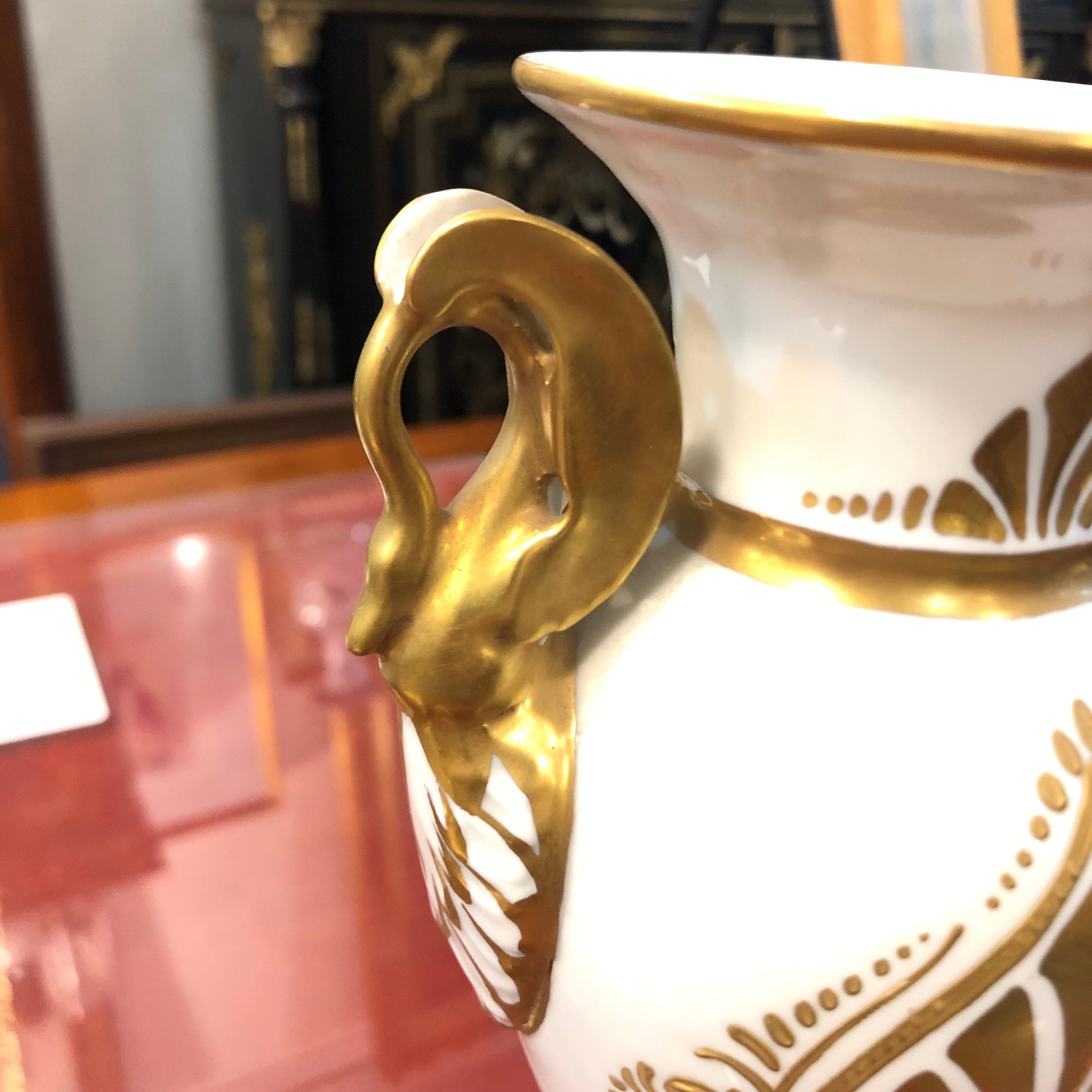 Hermoso jarrón francés de porcelana Napoleon I Garnier, de fondo blanco y detalles en dorado.
