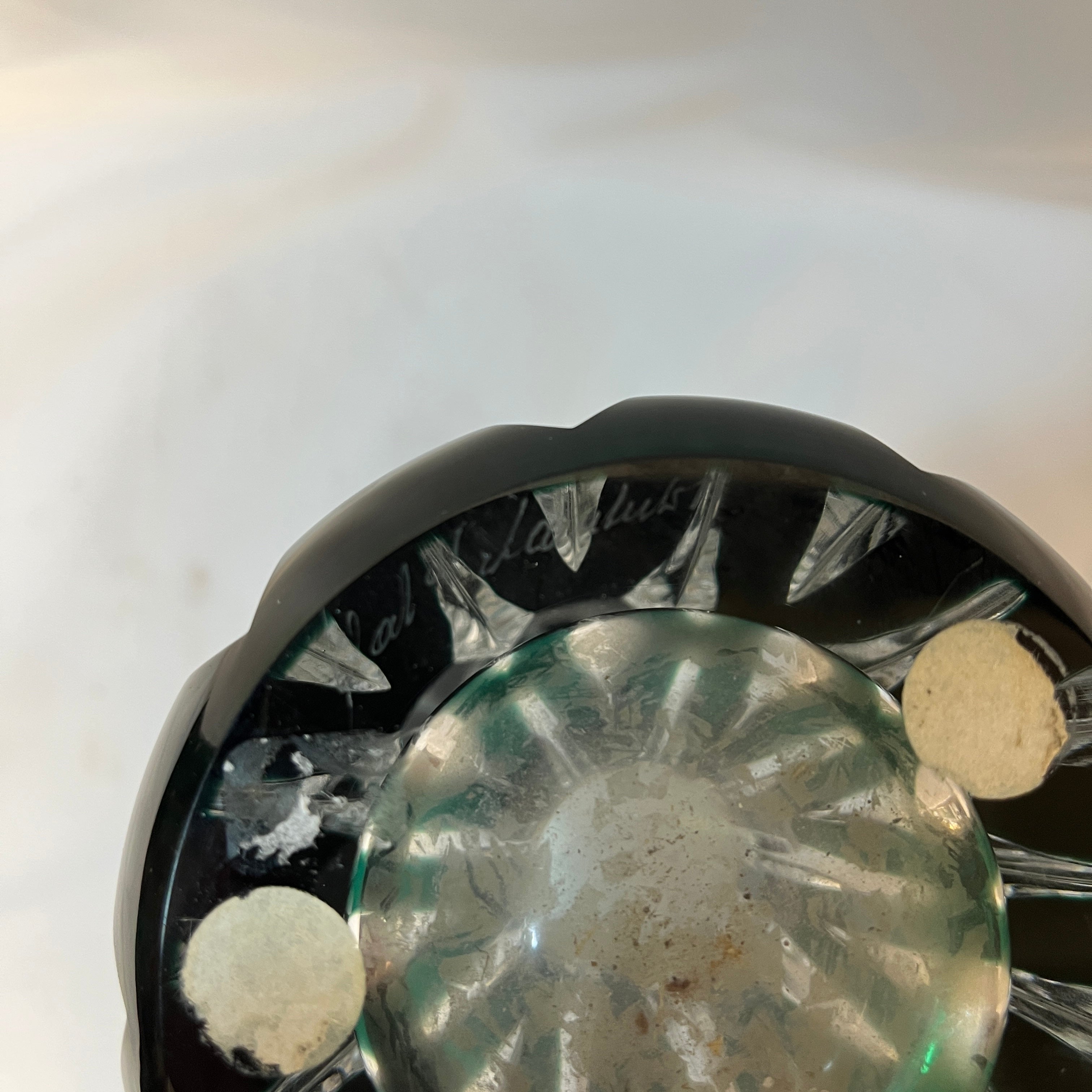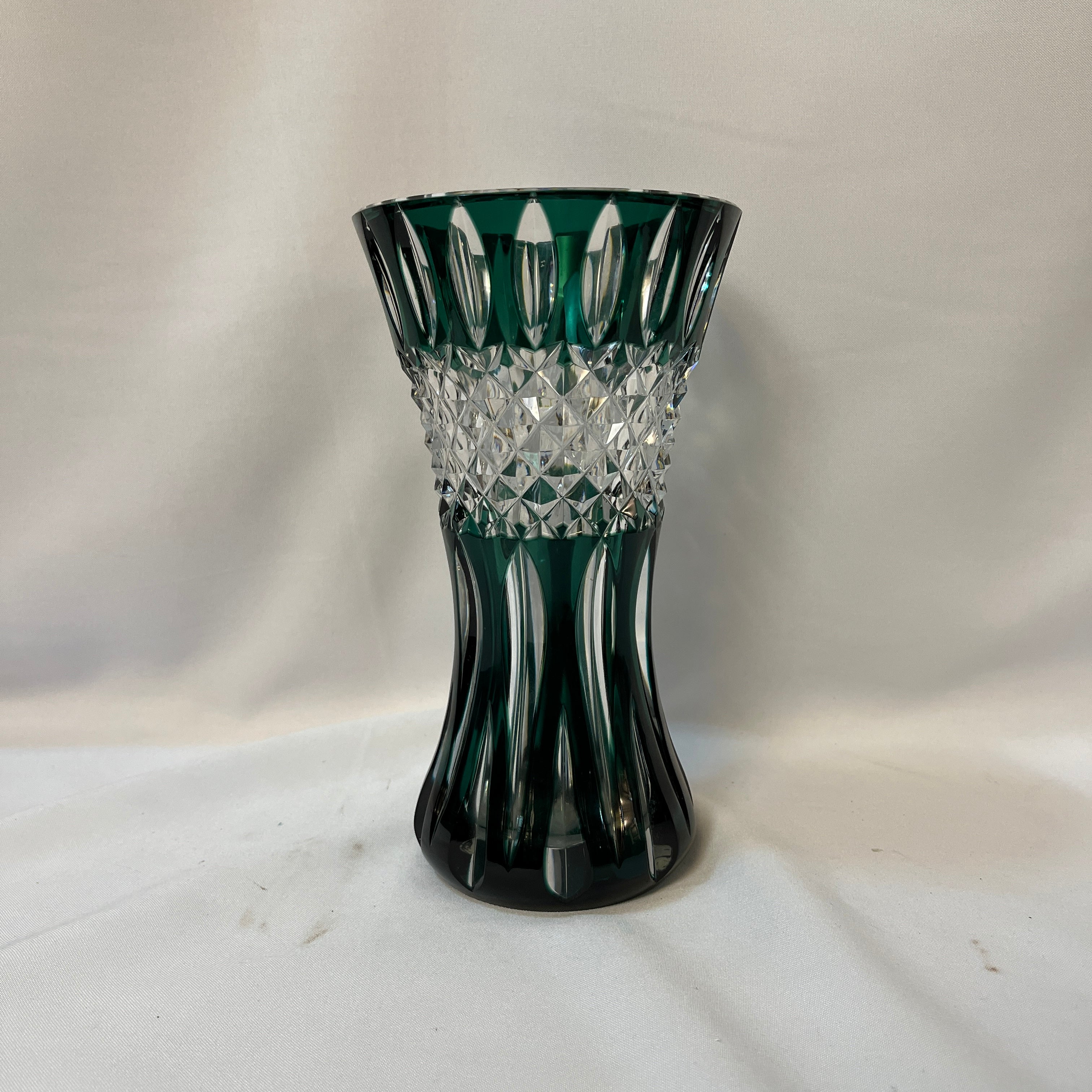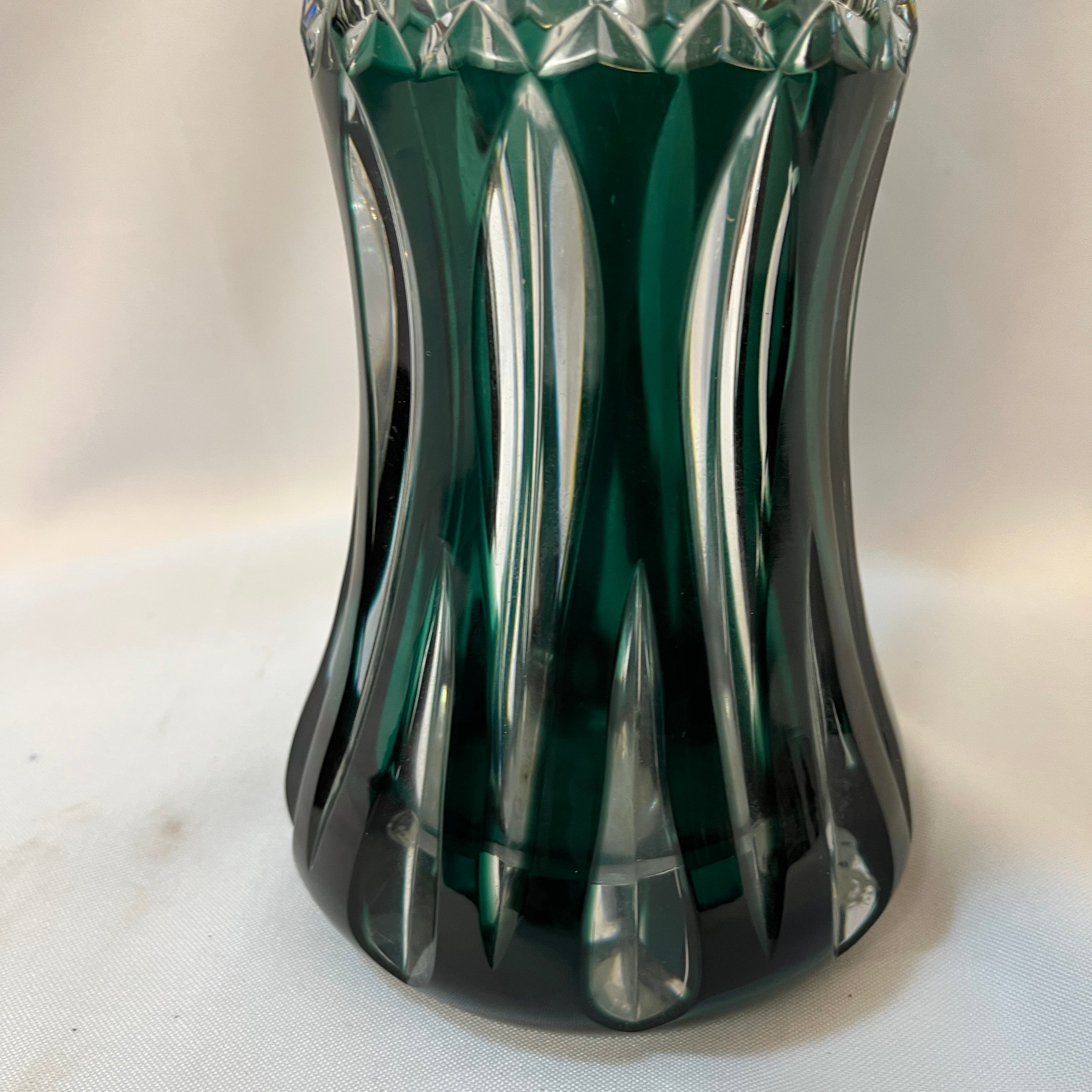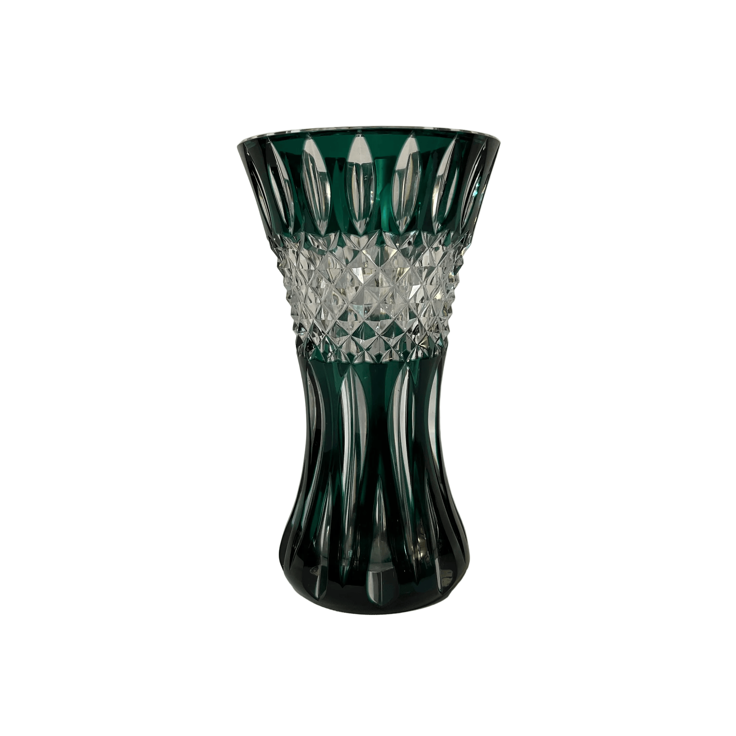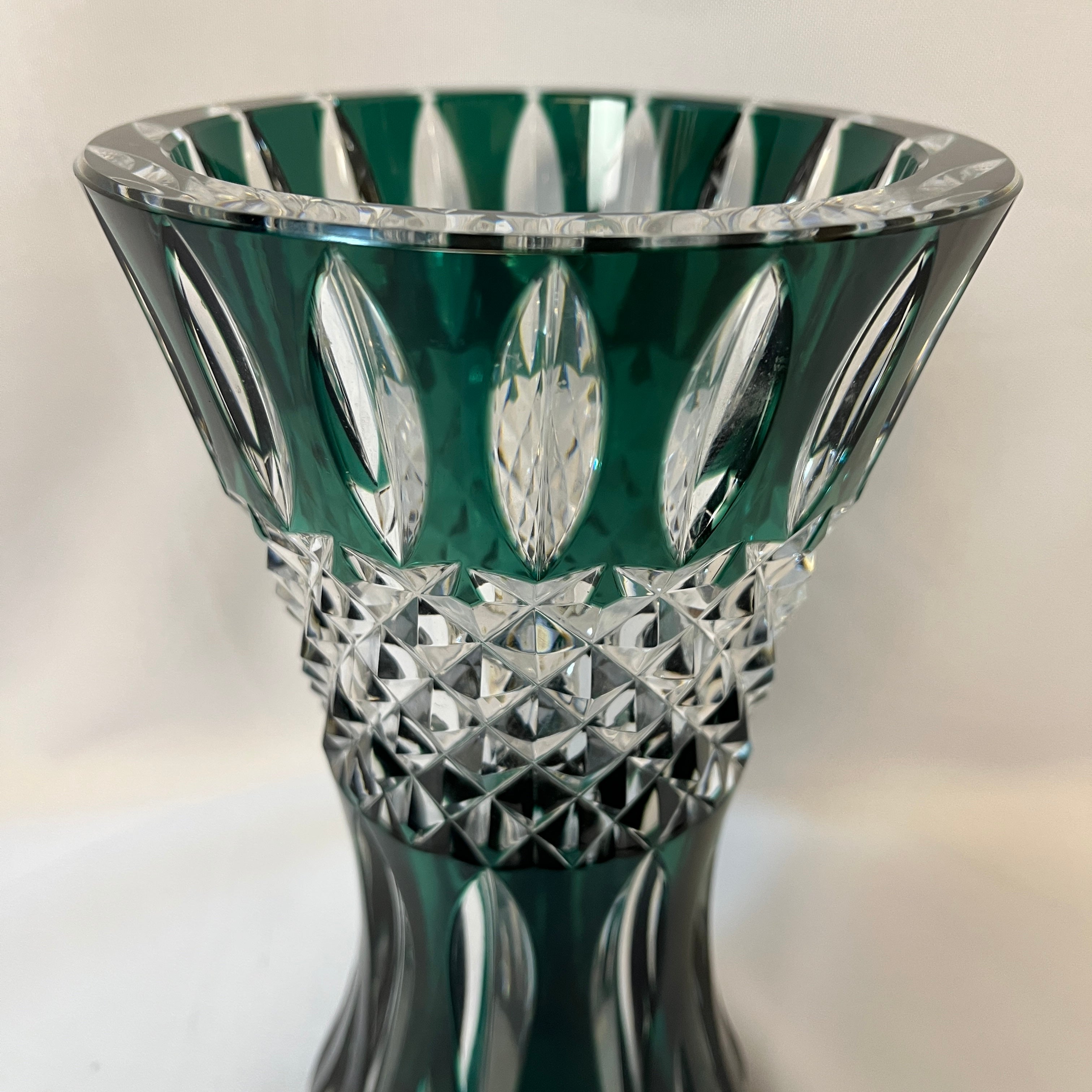 Hermoso jarrón teniers de cristal tallado estilo Cut to clear (tallado transparente) de la prestigiosa marca belga Val Saint Lambert, con un distinguido verde esmeralda, que resalta el trabajo de la pieza y le entrega una prestancia única para decorar los hogares. En su centro posee fino tallado diamantado transparente. Es un jarrón de más de un centímetro de grosor, resistente y a la vez delicado. Posee en su base tallado 'Val Saint Lambert'