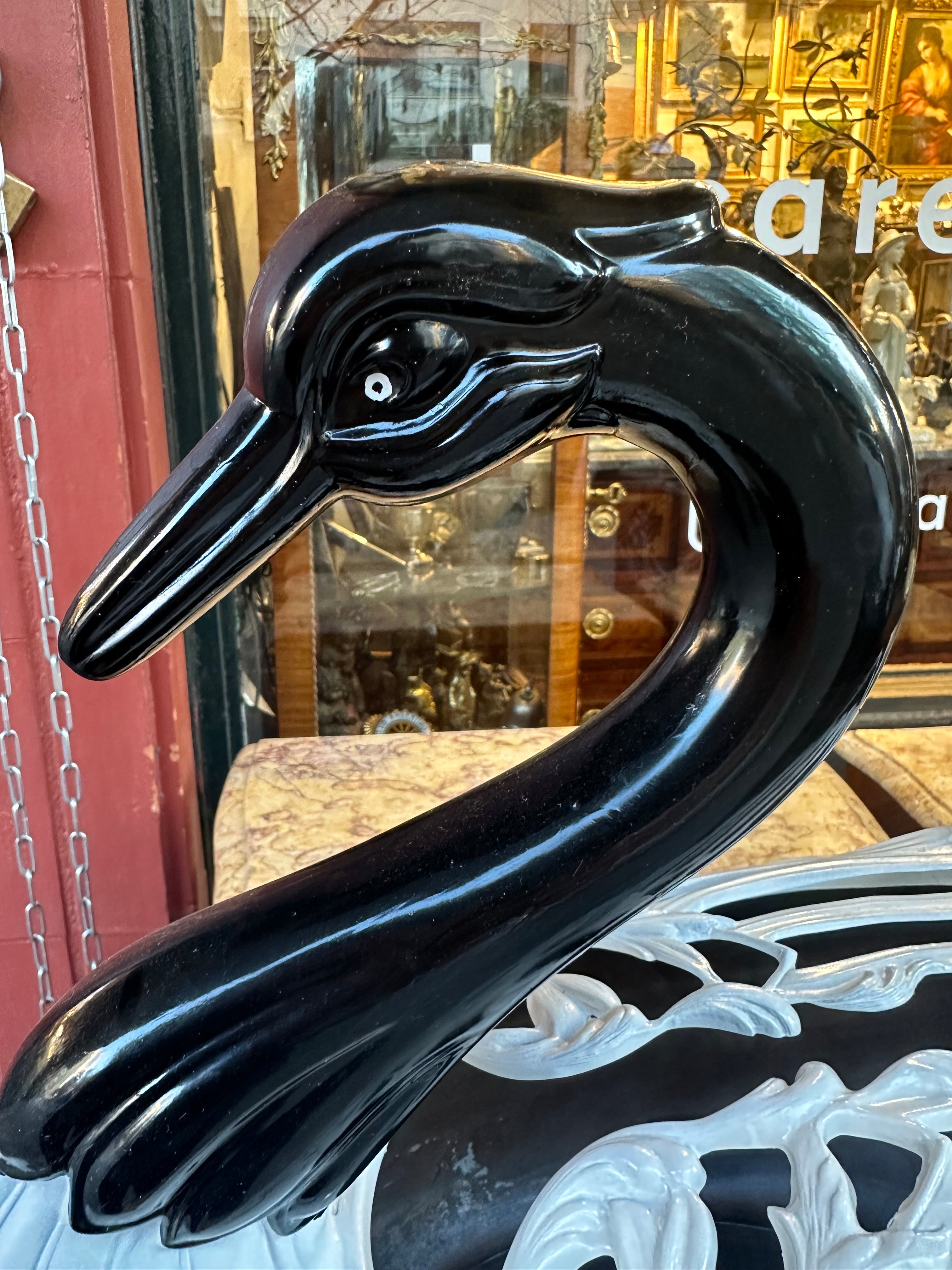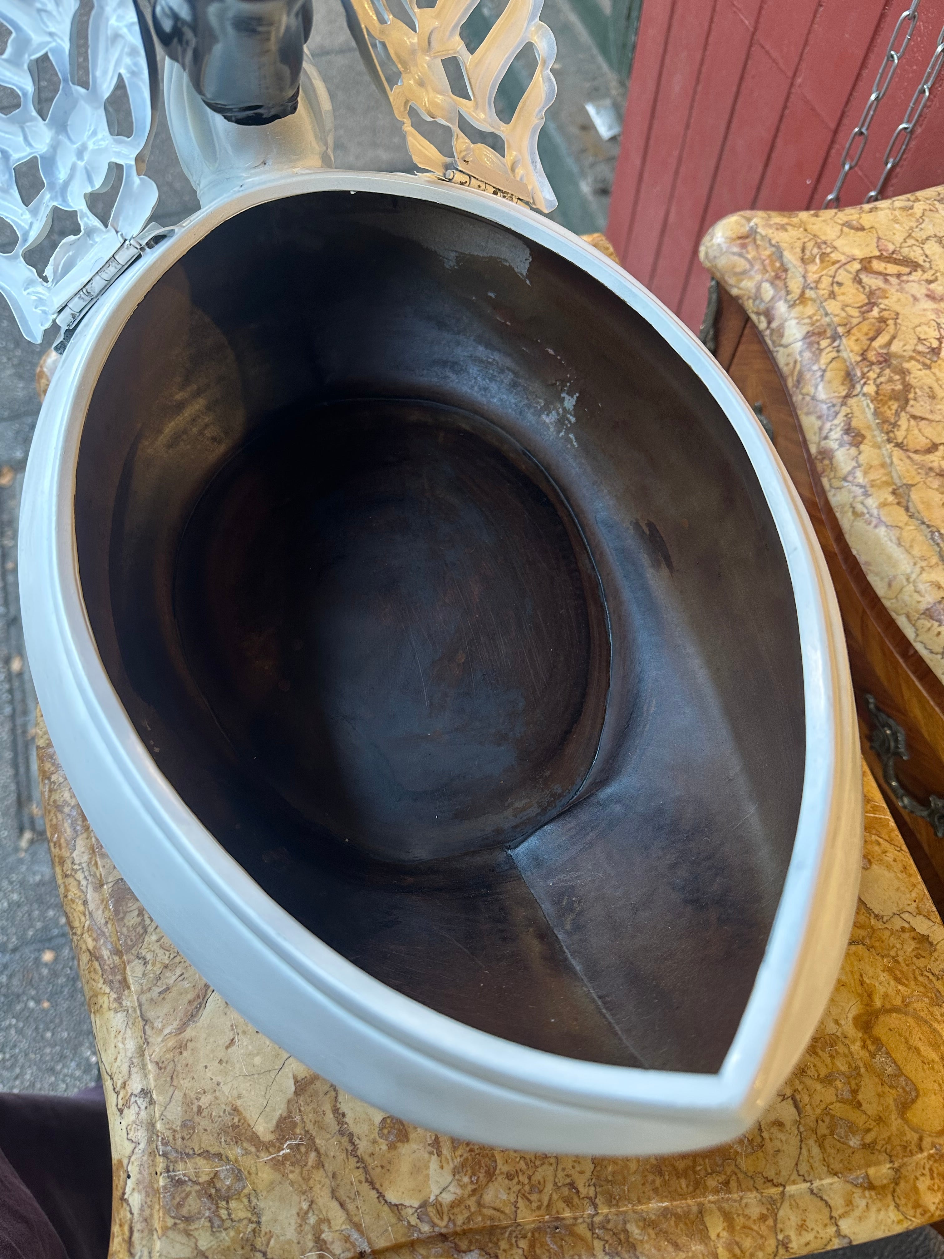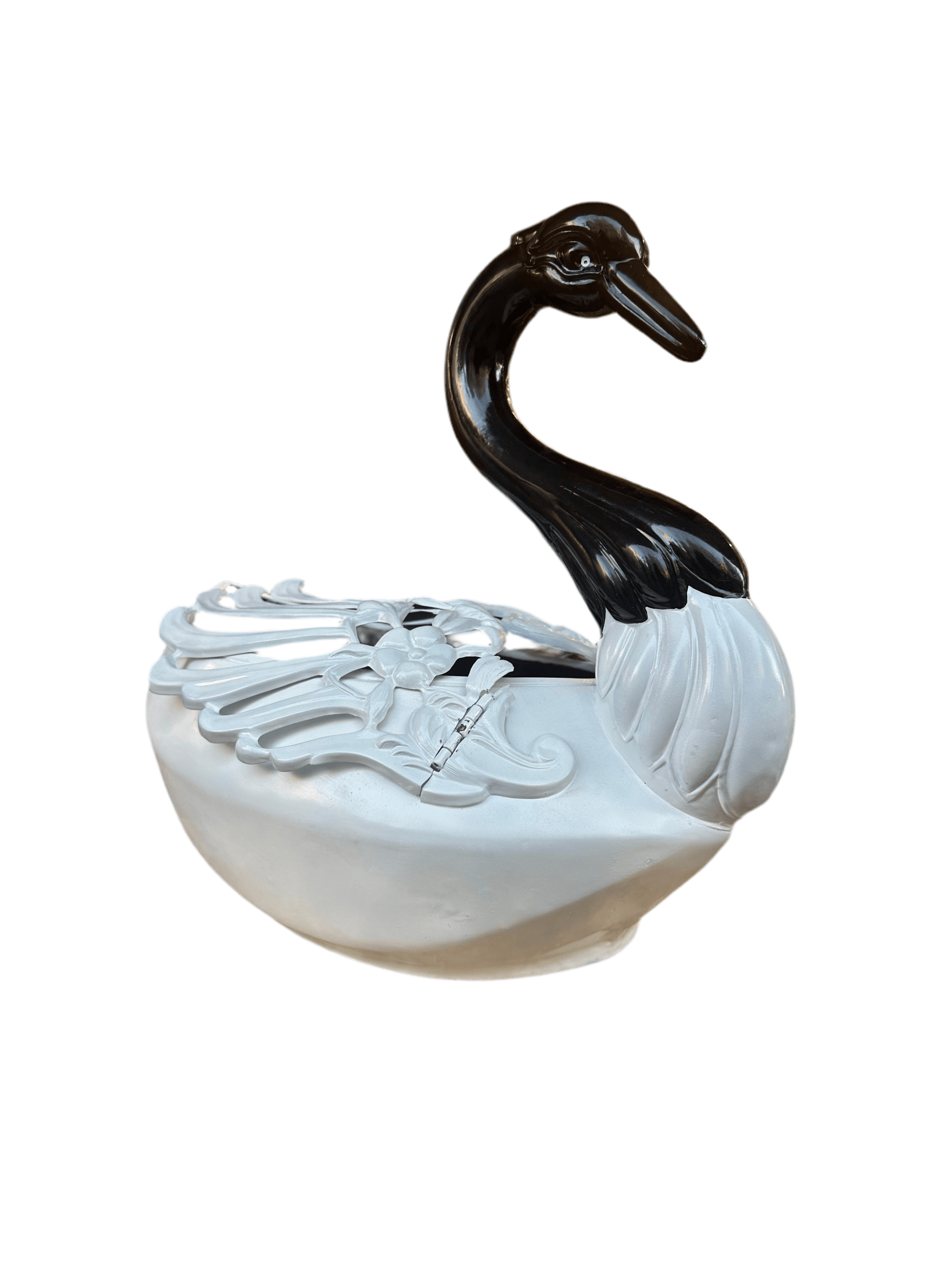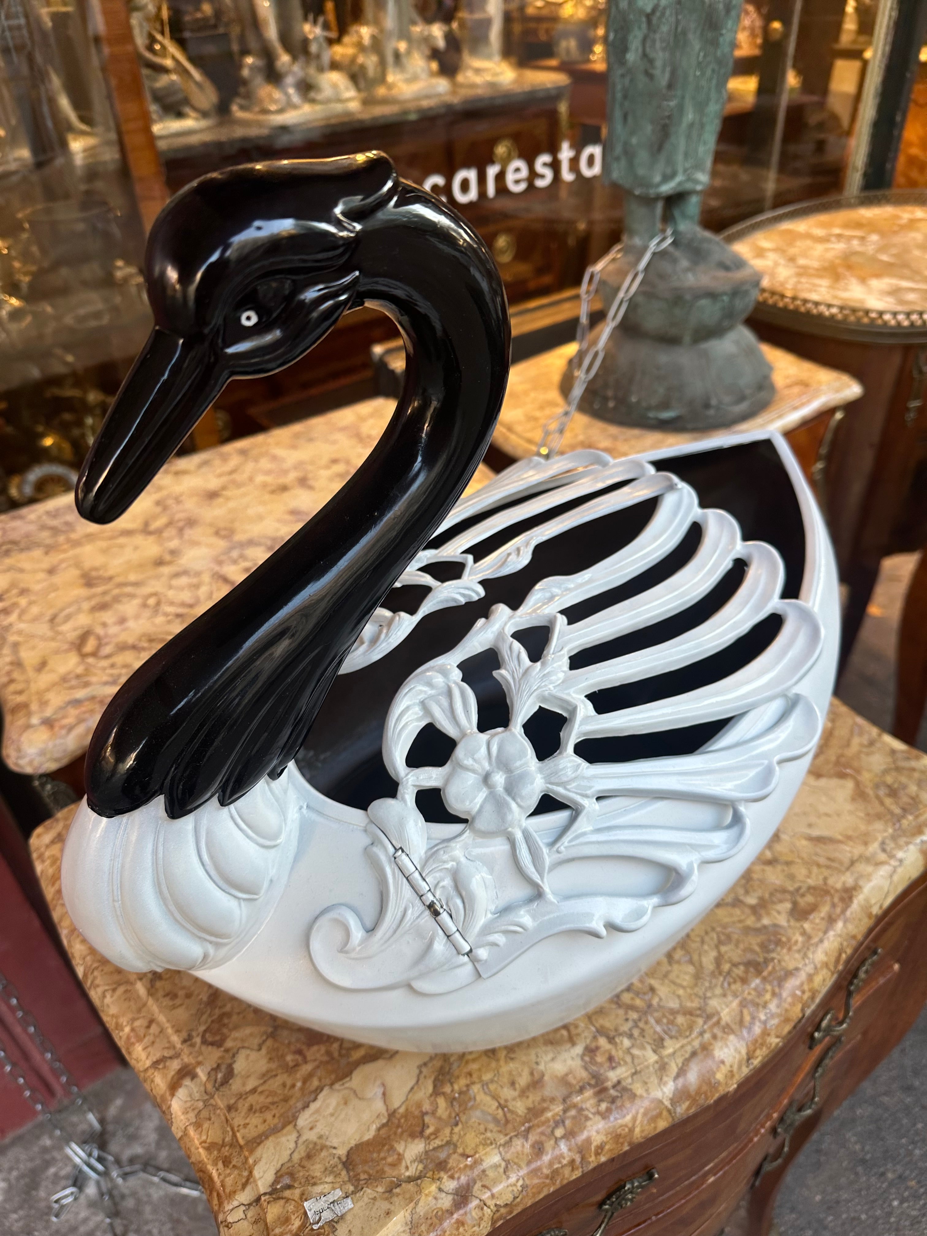 Bello y llamativo juego de dos jardineras de estaño con forma de cisnes. Las alas de cada cisne, con bellas decoraciones florales, tienen bisagras,, convirtiéndolas en rejillas que pueden tapar y destapar el interior de la pieza. Las piezas están pintadas en blanco y negro satinados.