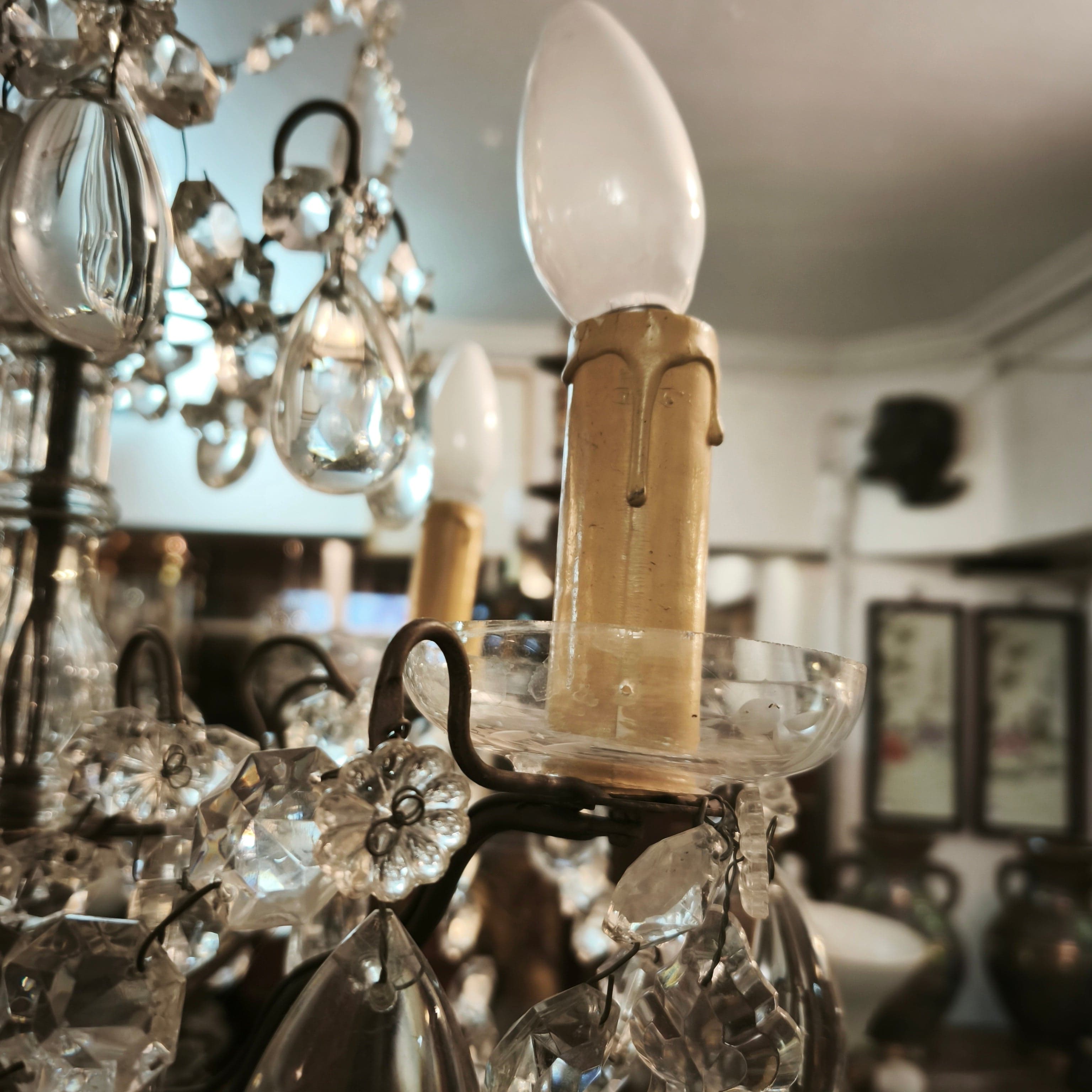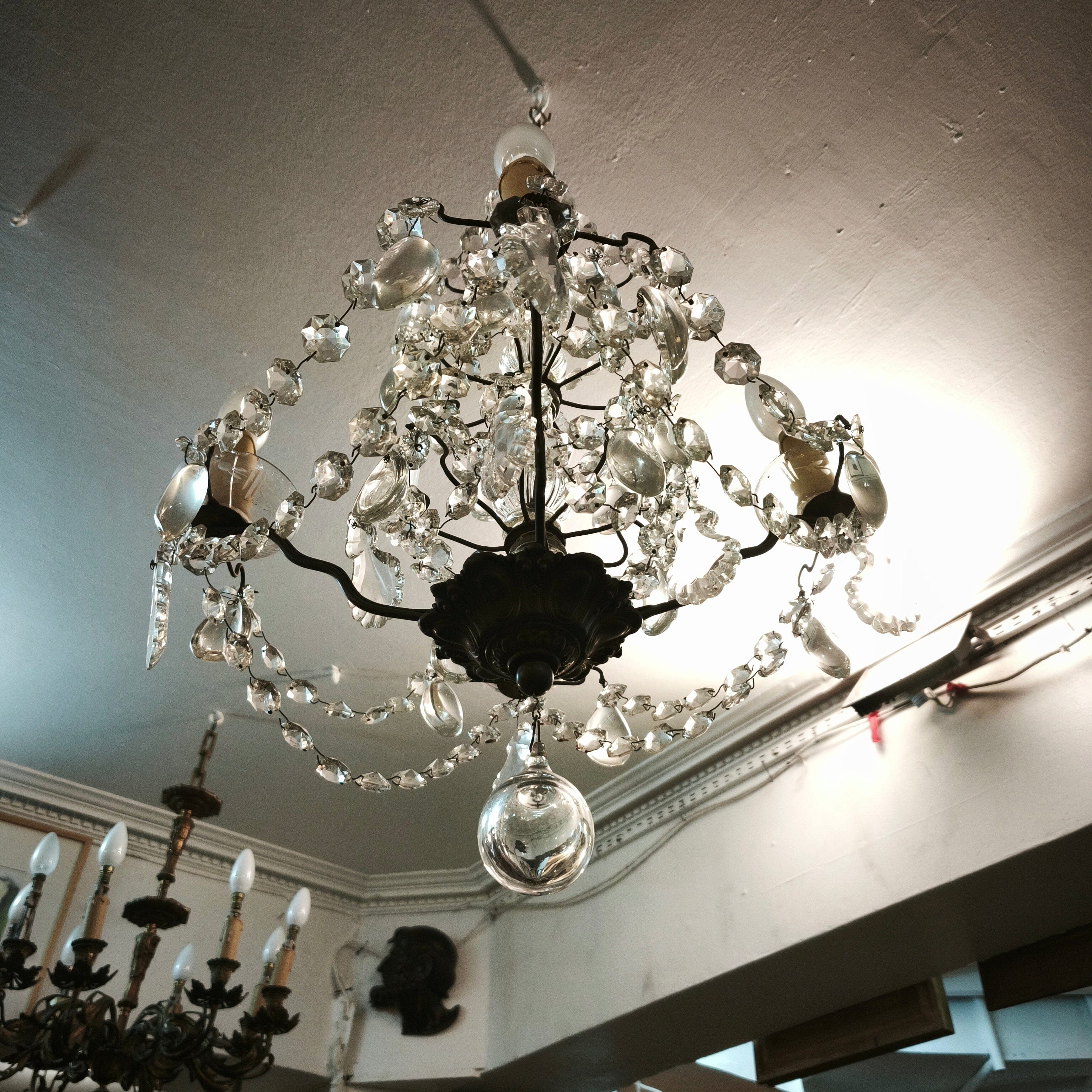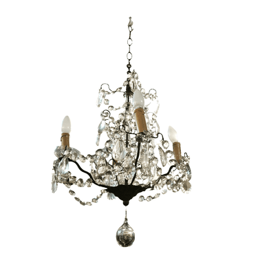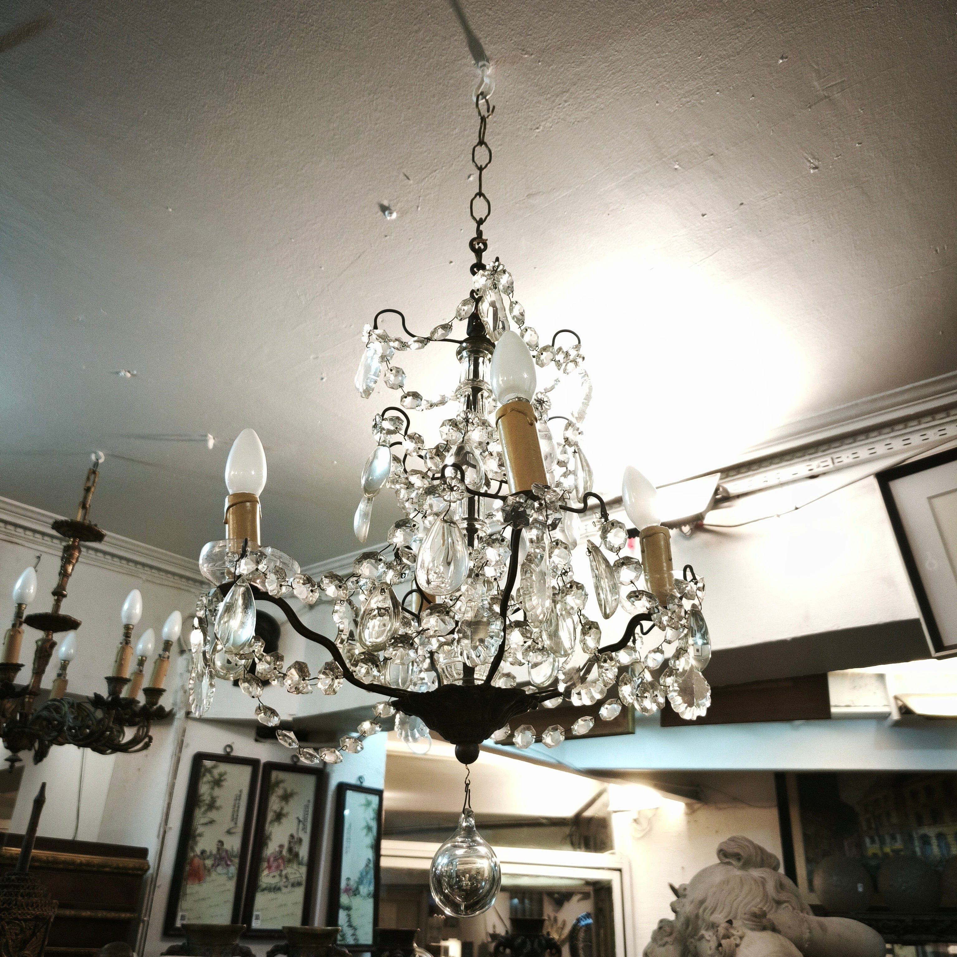 Elegante lámpara de lágrimas de techo, de origen francés, con su estructura hecha de bronce forjado, liviano a la vista y que hace relucir los cristales cuatro brazos y cuatro luces. La pieza tiene tres niveles, cada uno con un patrón distinto de cristalería, que terminan en una gran esfera final, colgada en la parte más baja.