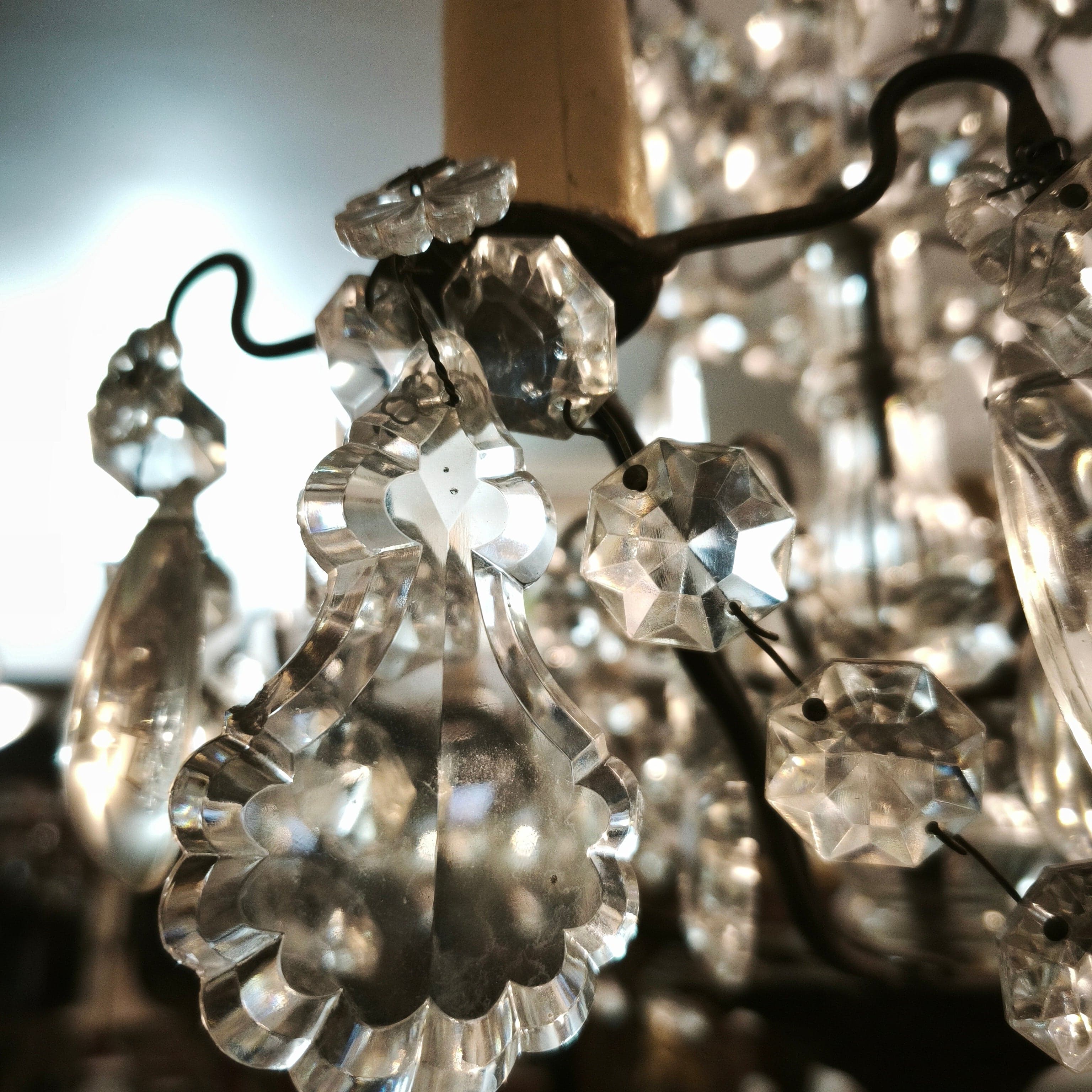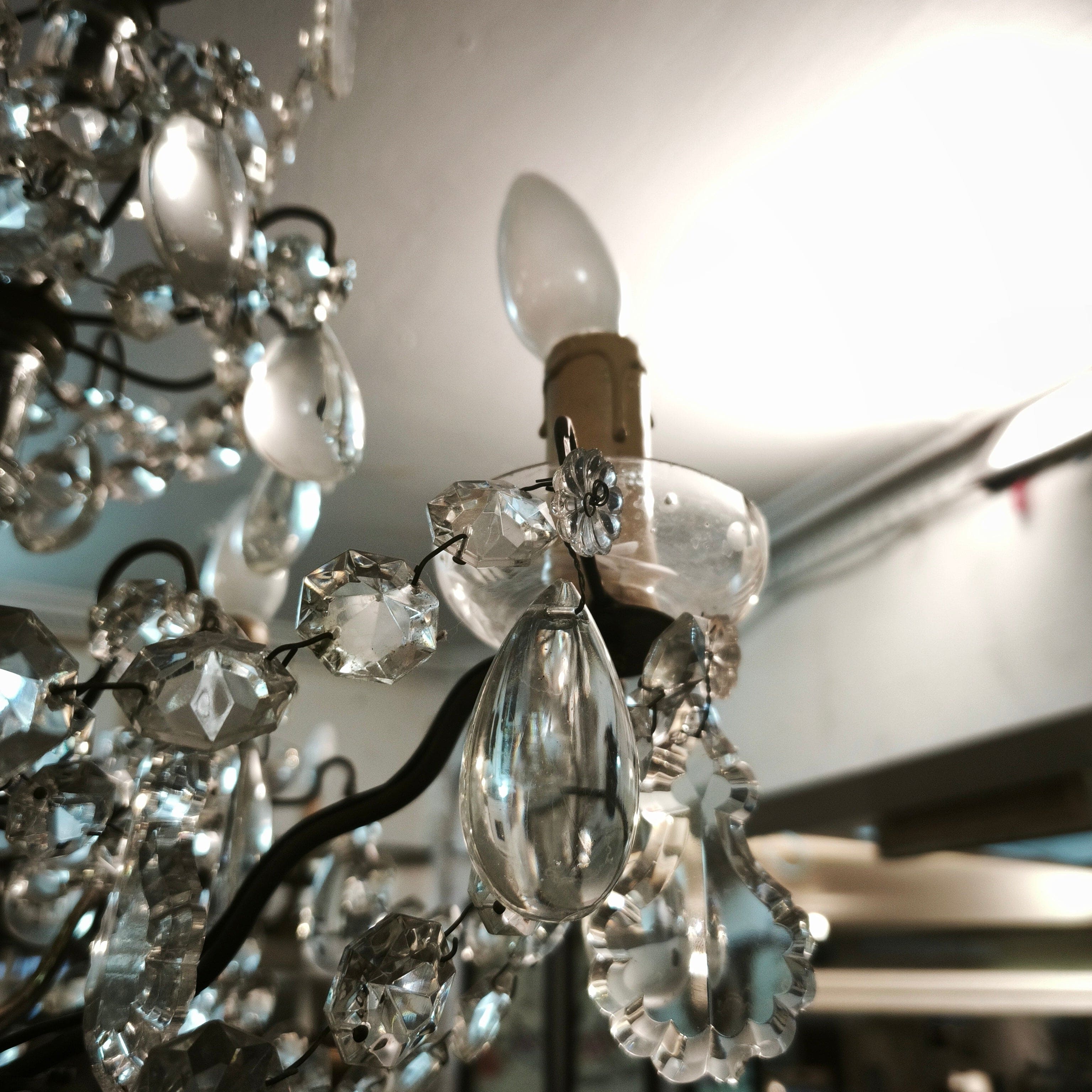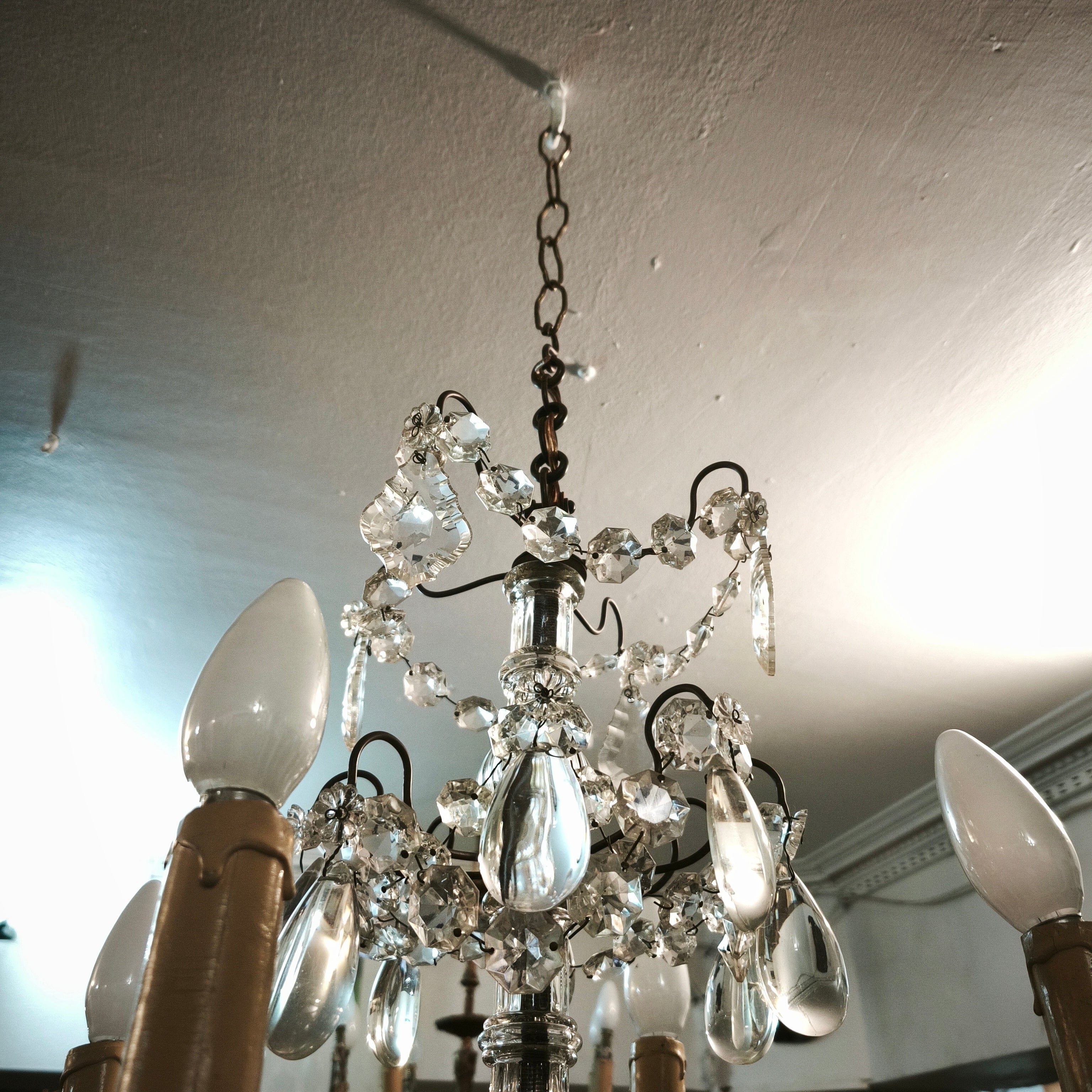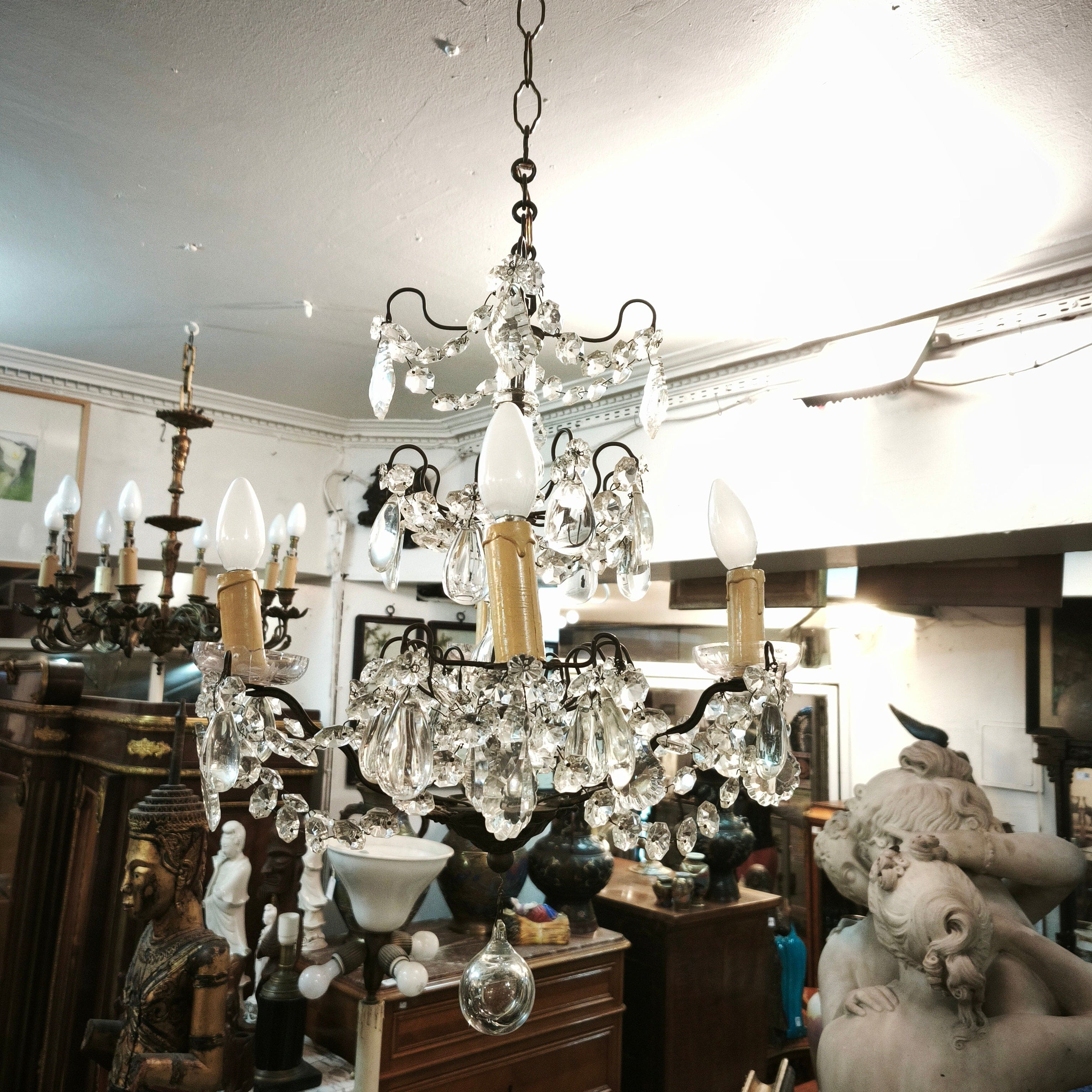 Elegante lámpara de lágrimas de techo, de origen francés, con su estructura hecha de bronce forjado, liviano a la vista y que hace relucir los cristales cuatro brazos y cuatro luces. La pieza tiene tres niveles, cada uno con un patrón distinto de cristalería, que terminan en una gran esfera final, colgada en la parte más baja.