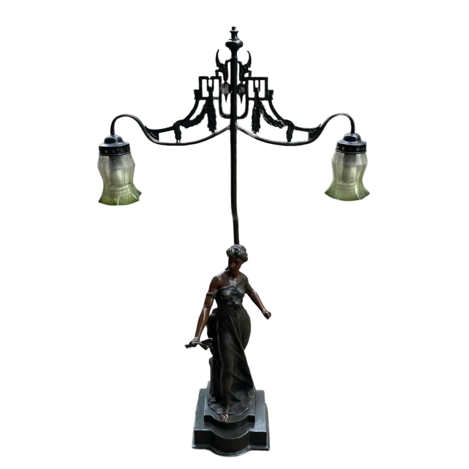 Estatuilla de peltre y lámpara. Cuenta con dos pantalla de cristal y sistema eléctrico listo para usar.