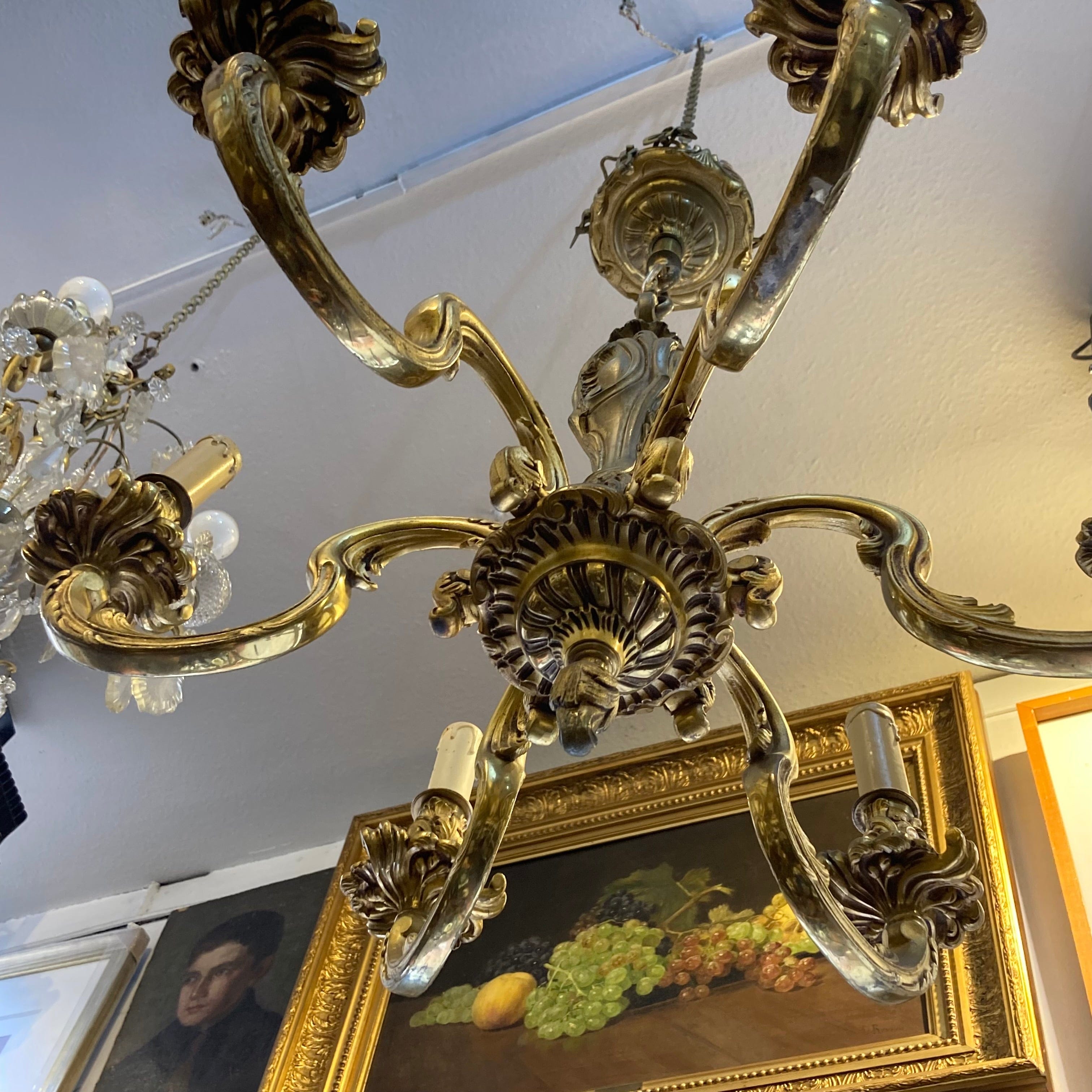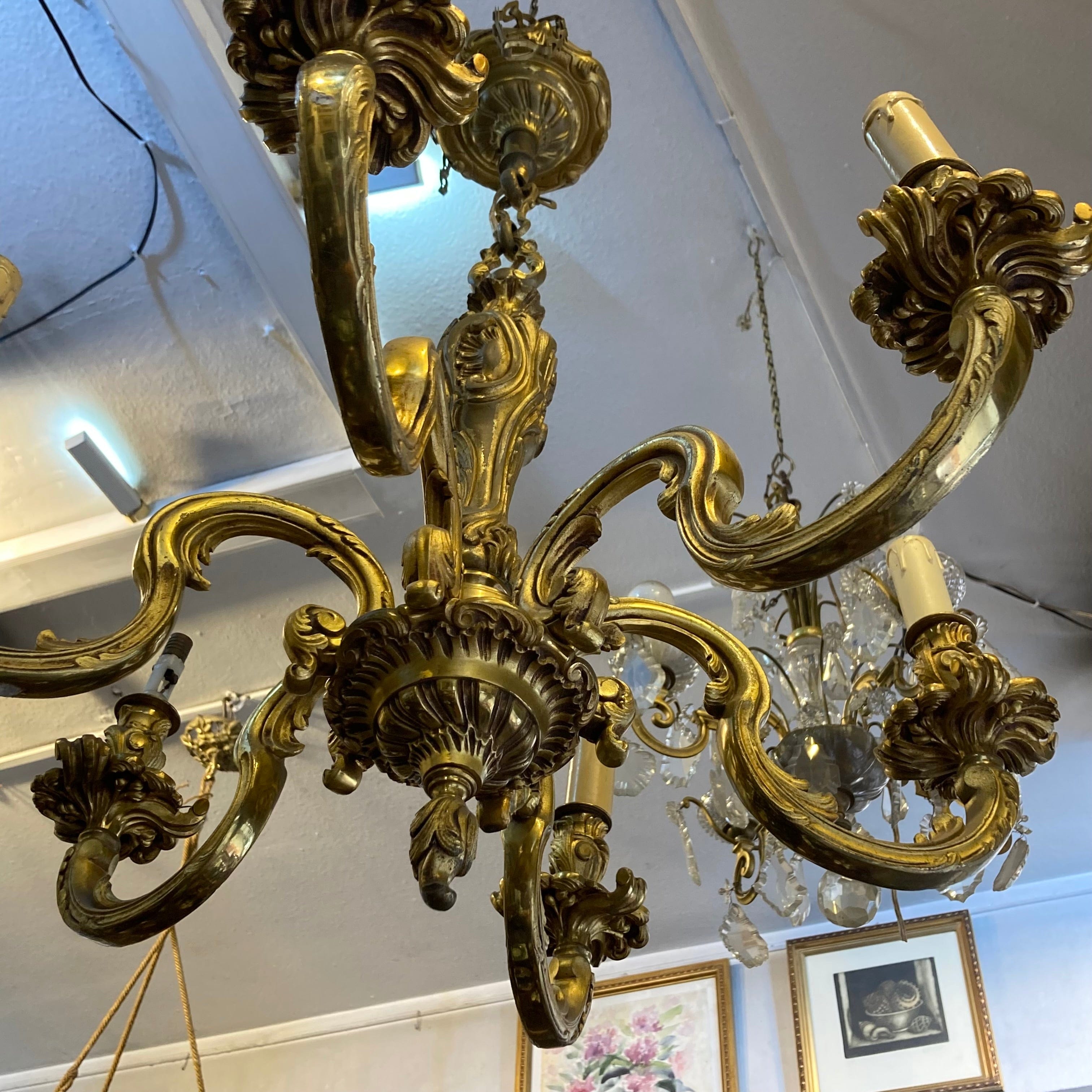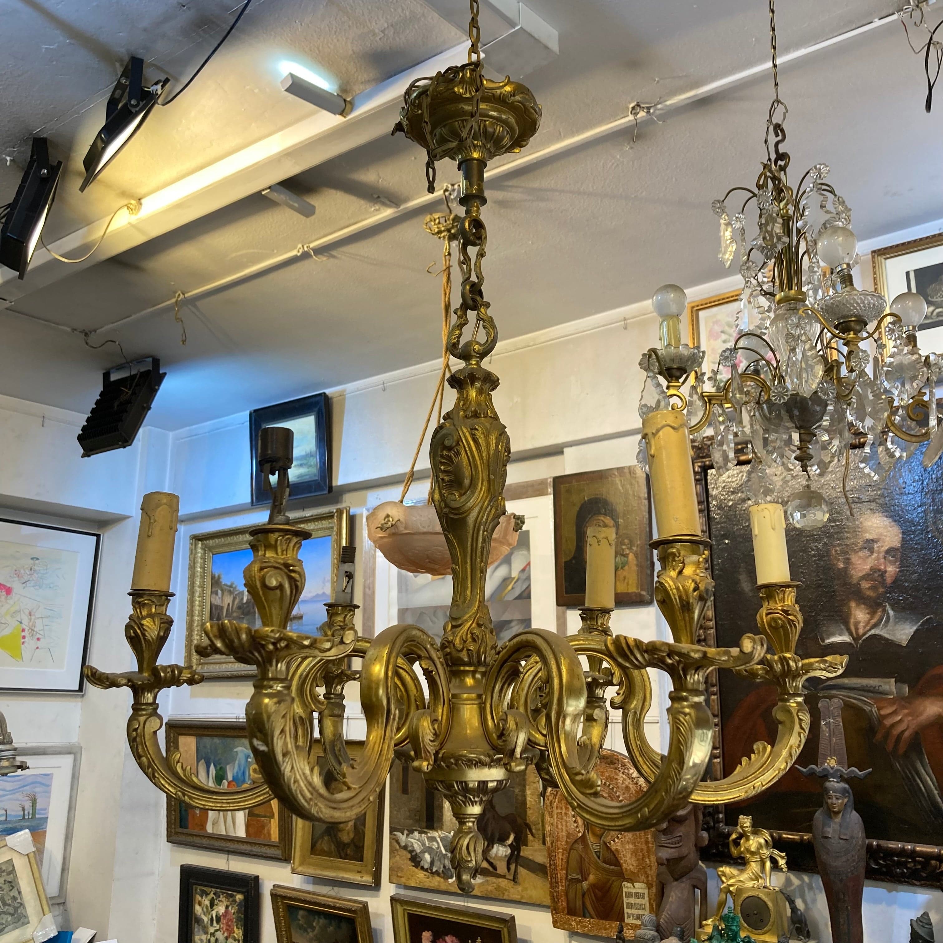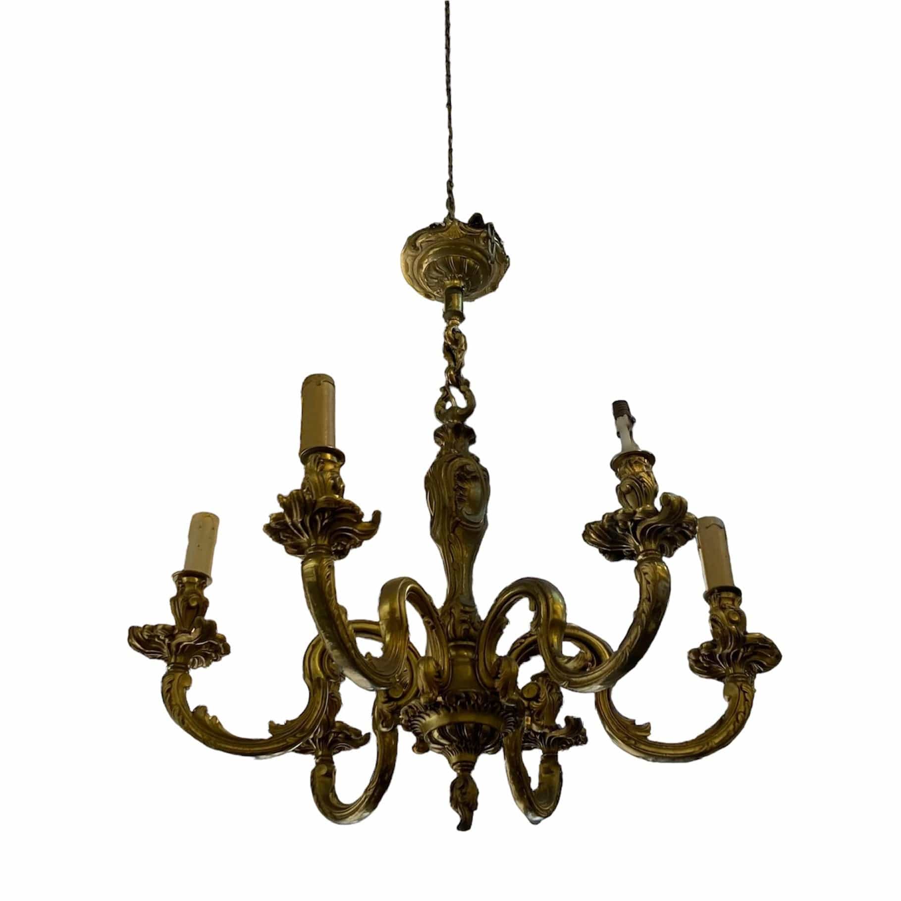 Elegante lámpara de bronce Luis XV. Cuenta con 6 brazos y respectivas luces. Refinados detalles característicos del estilo Luis VX, son parte de su diseño.