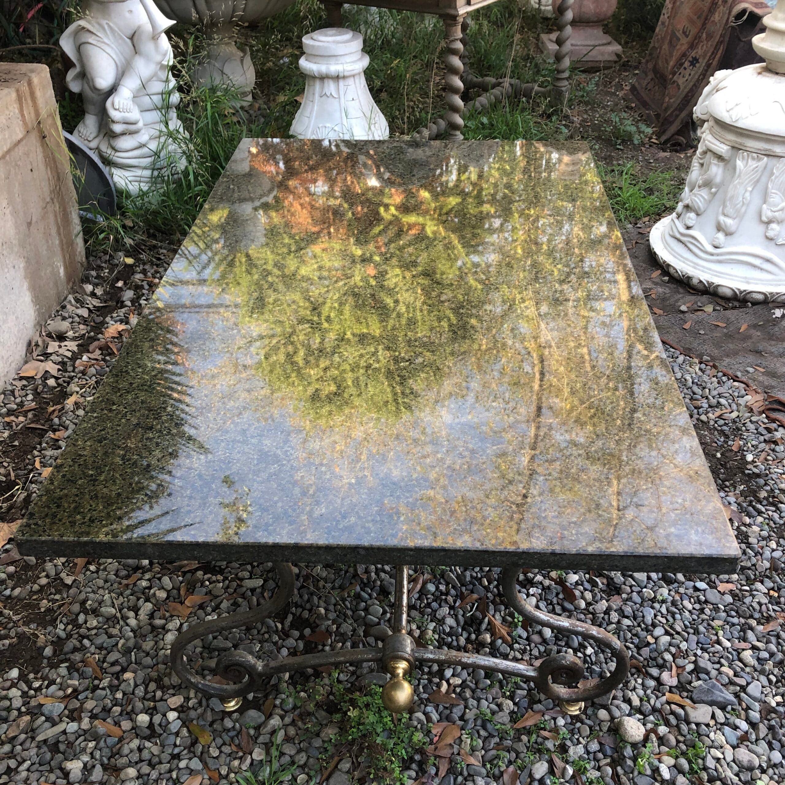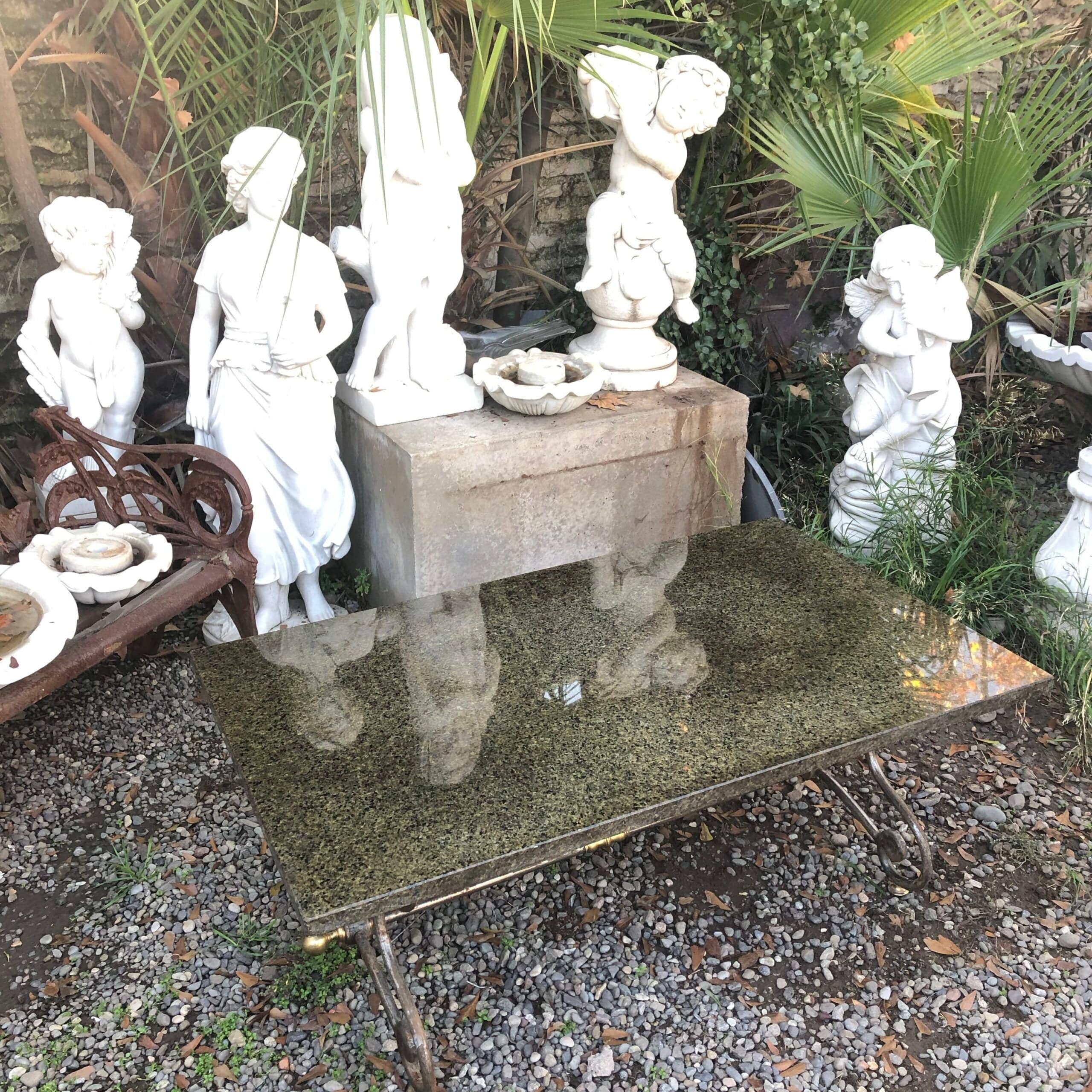 Mesa de exterior, estructura de fierro con aplicaciones de bronce y cubierta de mármol.