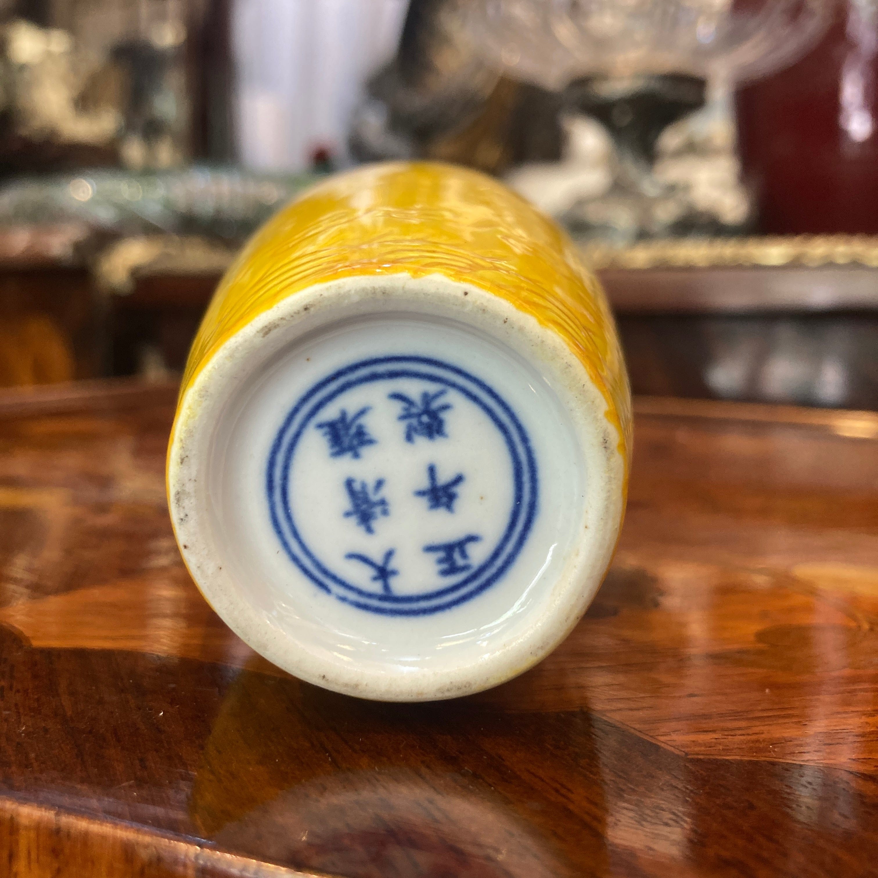 Bello jarroncito de porcelana amarilla, con sutil diseño tallado en su contorno.