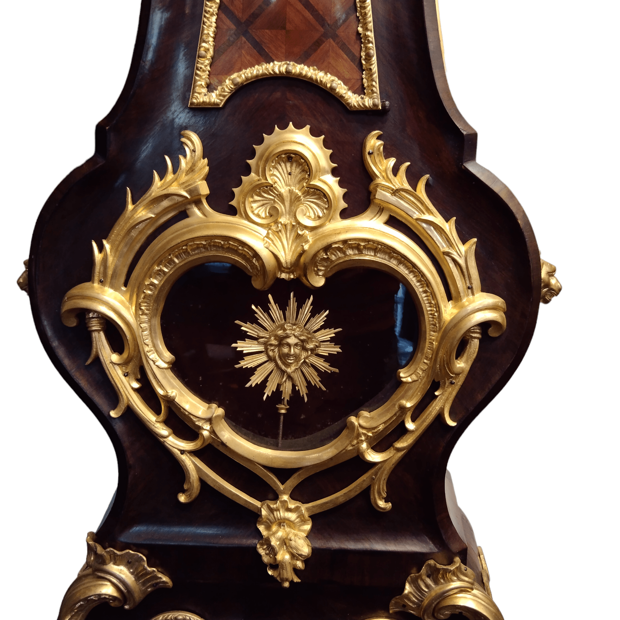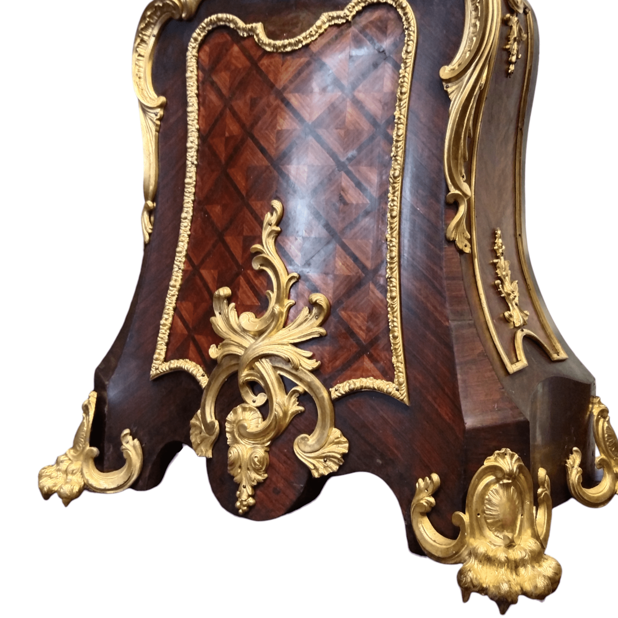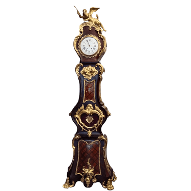 Reloj de caja larga estilo Luis XV, de origen y fabricación francesa del siglo XIX, con magníficas y detalladas aplicaciones en bronce ormolú.