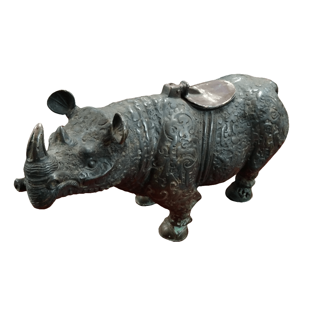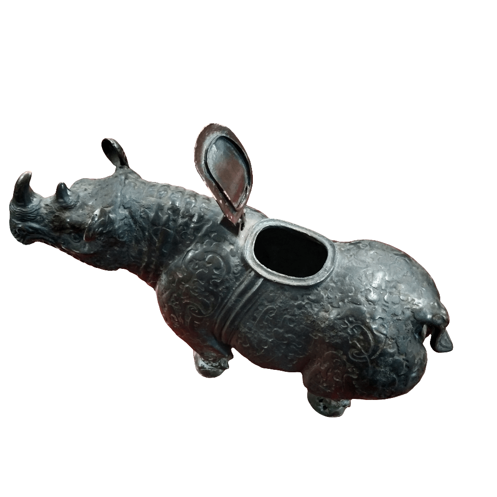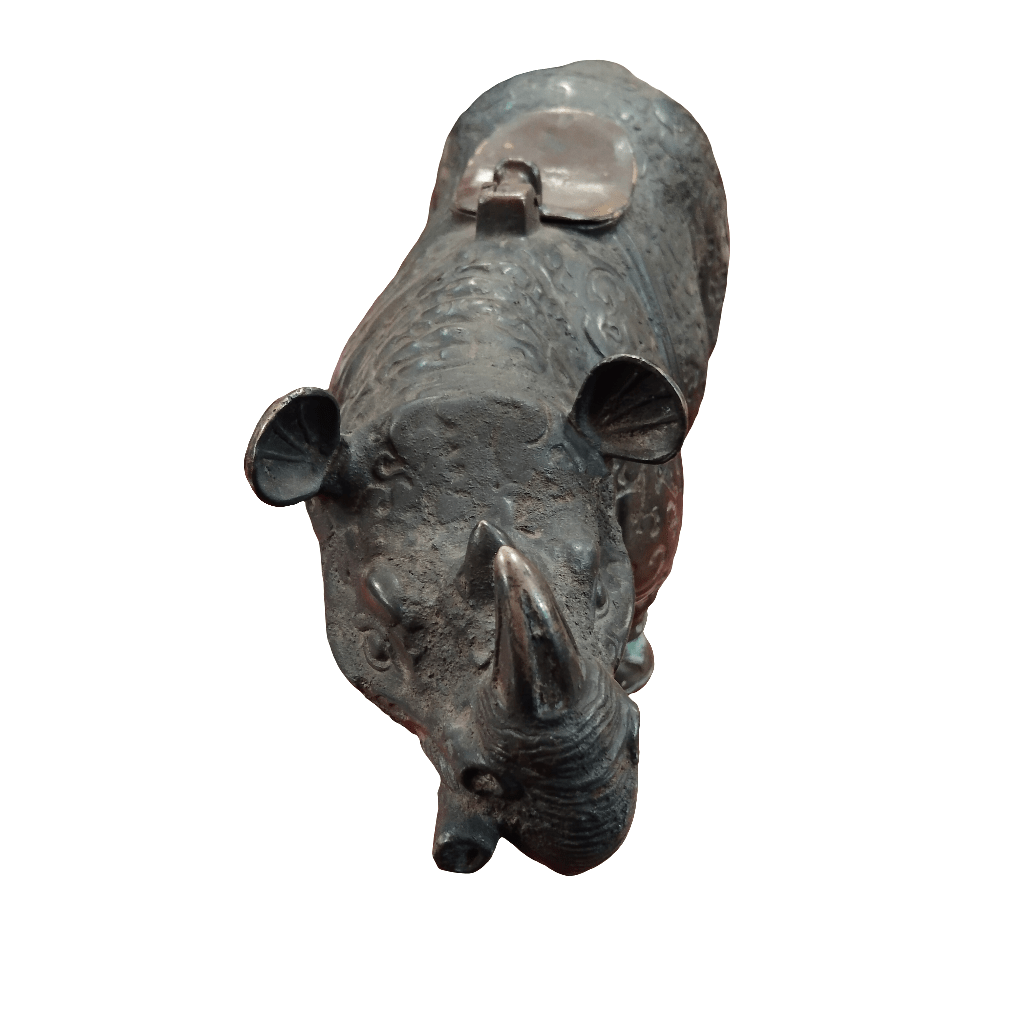 Particular figura en bronce, de origen chino, representando a un magnífico rinoceronte gris, tradicional de esta zona de Asia, con detallados relieves tallados en su cuerpo. La pieza tiene una tapa de bronce en su lomo, haciendo que se utilice como sahumador.