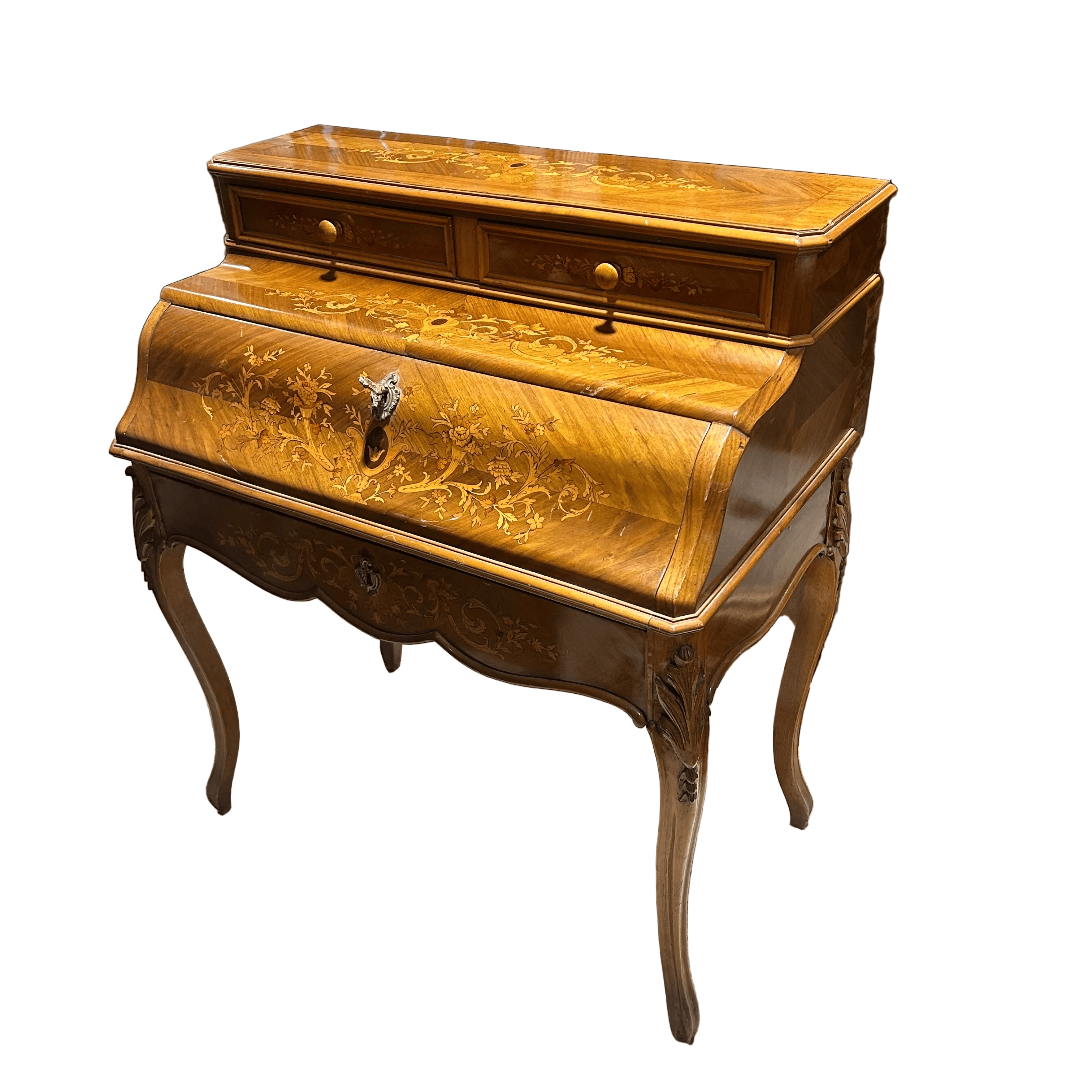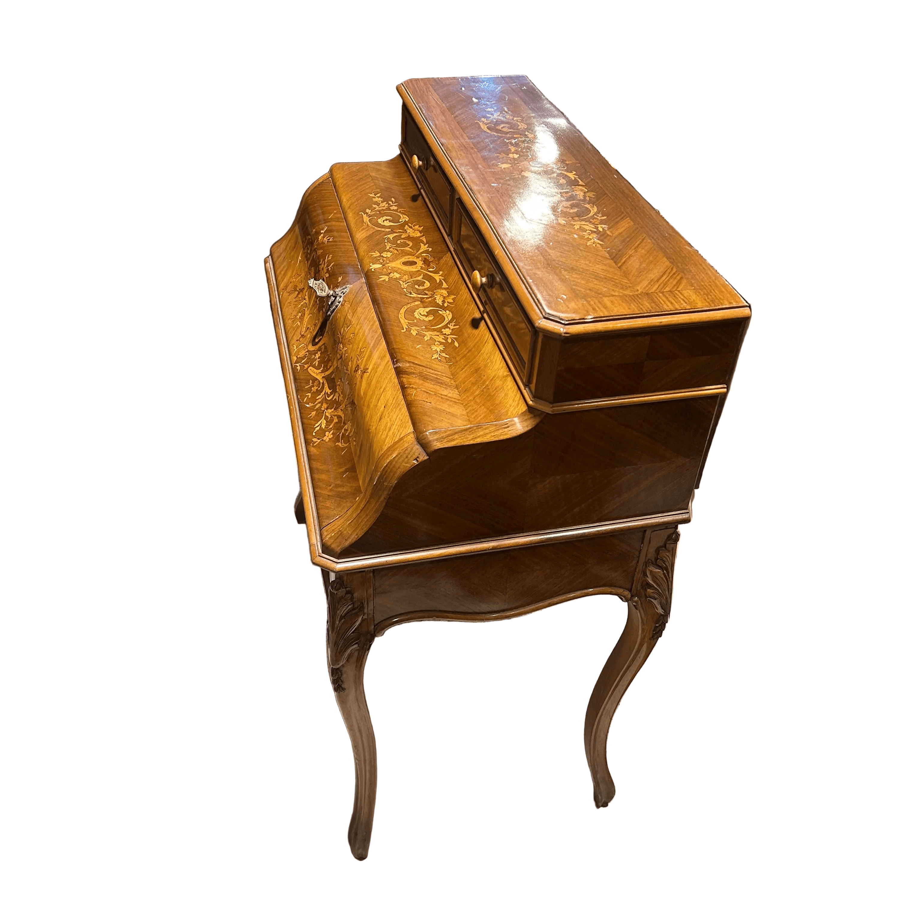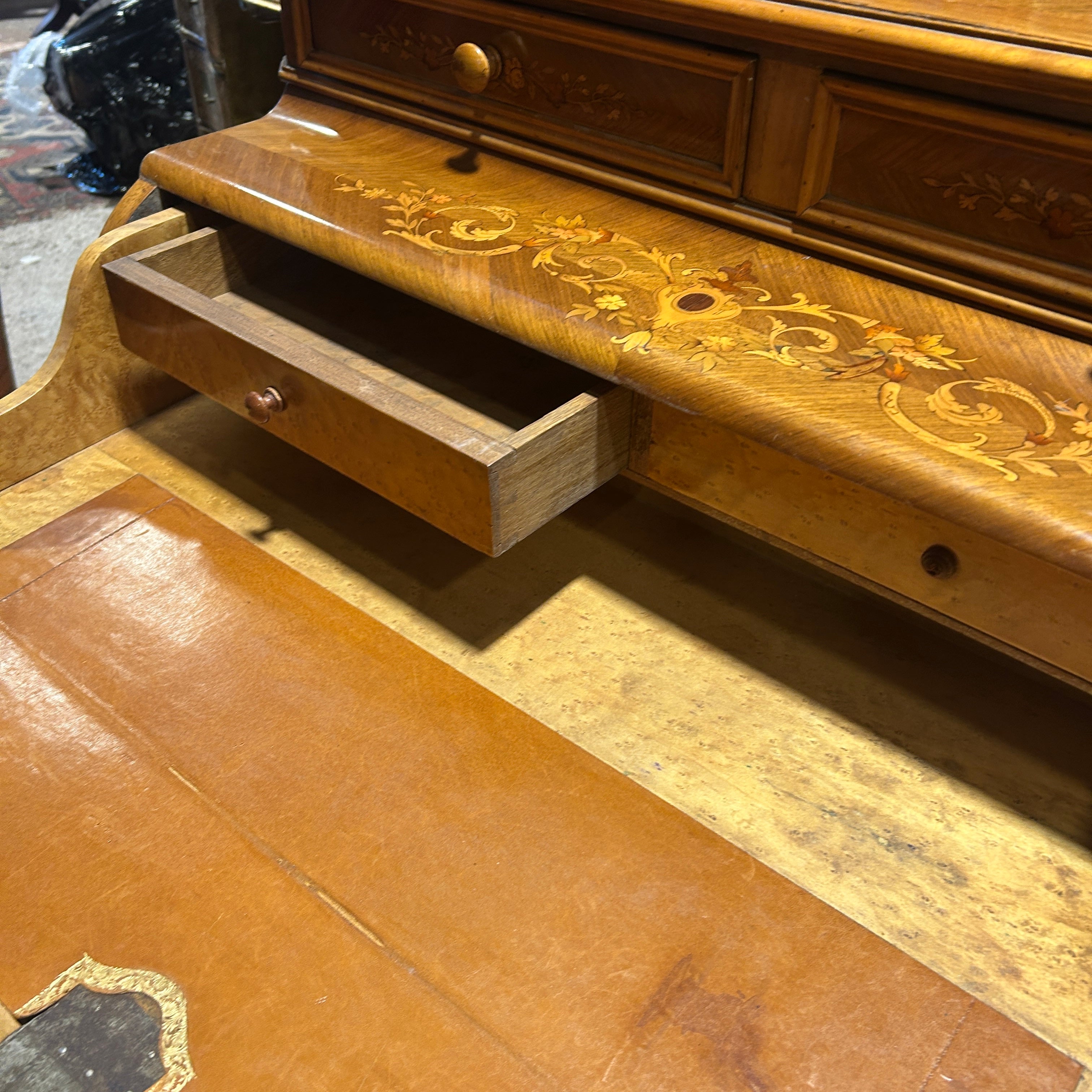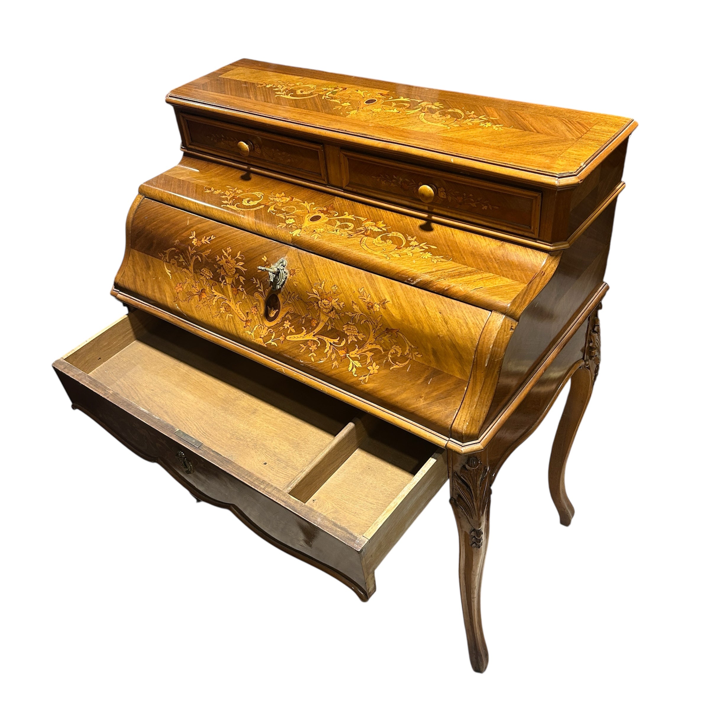 Hermoso secretaire francés en caoba rubia, palorosa, con profusa y detallada marquetería de diversos árboles frutales. de motivo floral en su puerta. Cuenta don dos cajones superiores. Tiene una particular manera de apertura ya que es la base del escritorio la abatible y la que se extiende para poder abrirlo. Su interior tiene cuero café claro con detalles dorados y dos cajones pequeños con tiradores de madera. La parte baja también tiene un cajón extendido con su respectiva llave la cual además tiene la particularidad de bloquear los cajones superiores y puerta abatible. Principios del siglo XX.