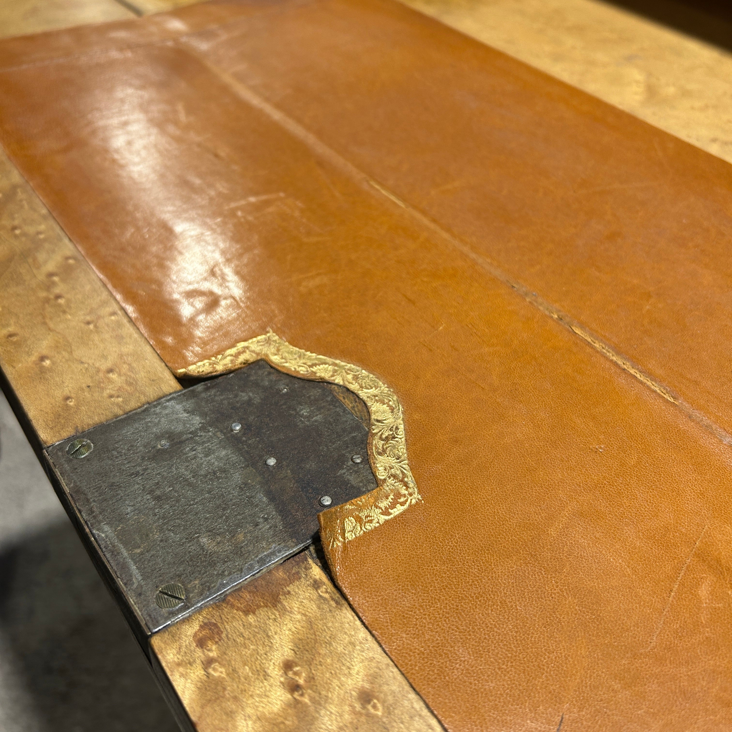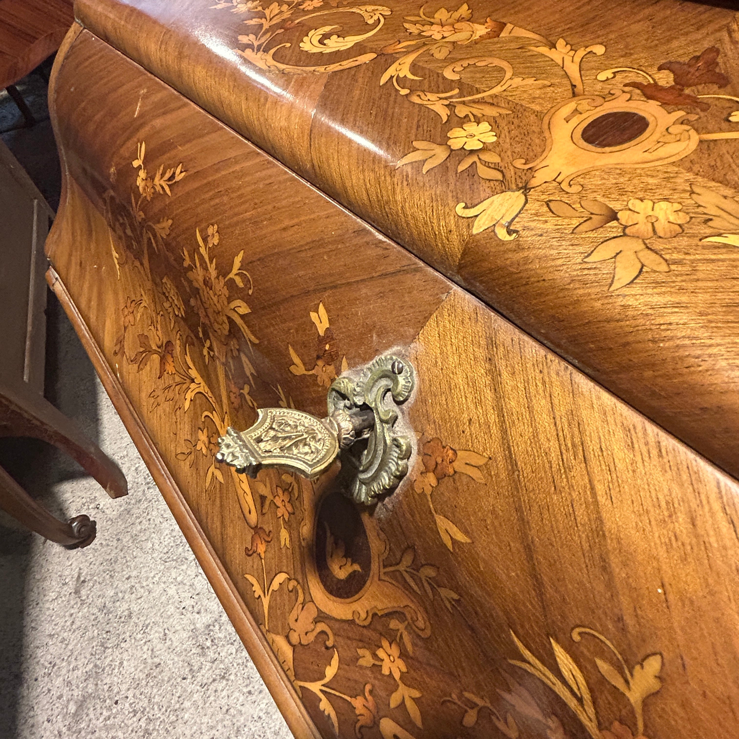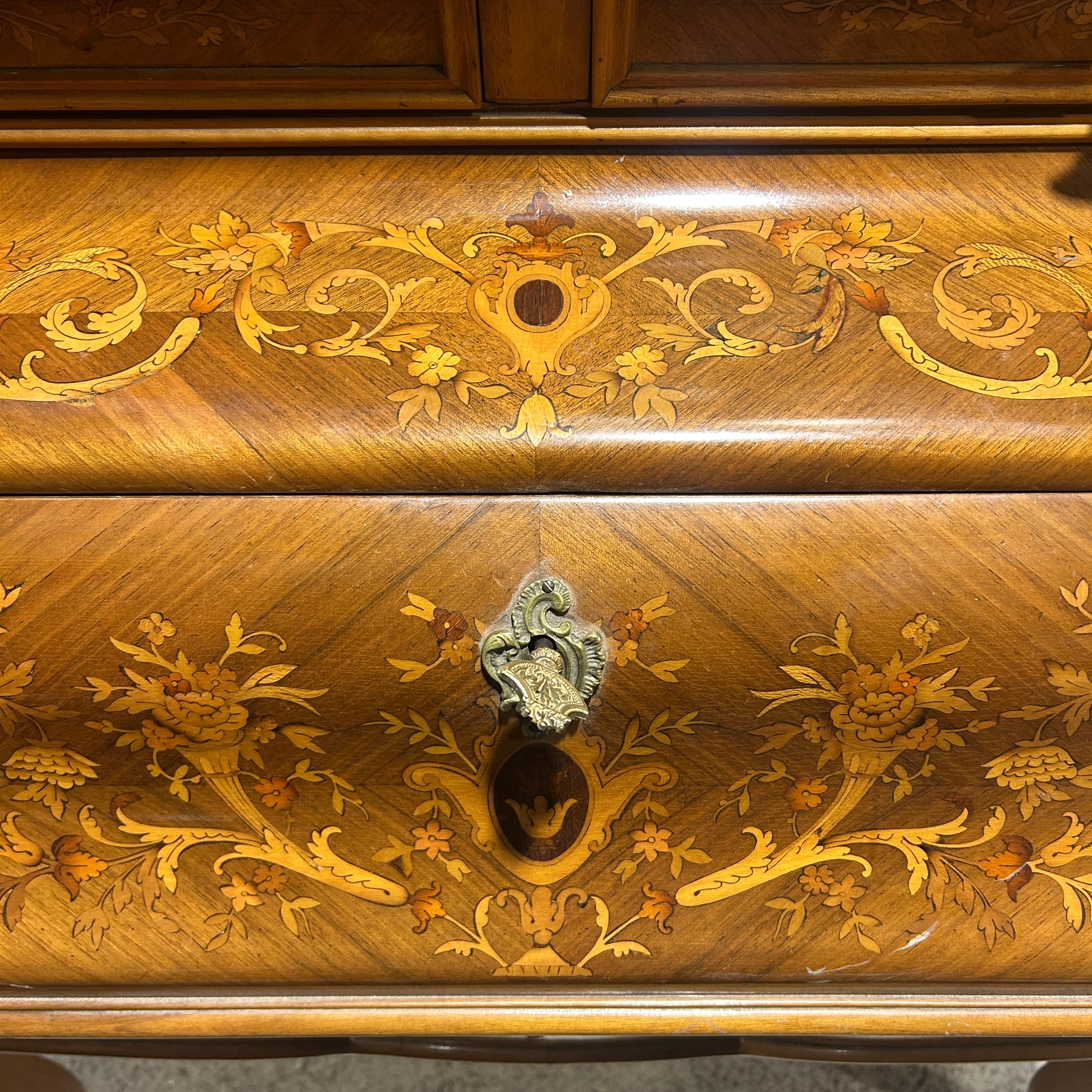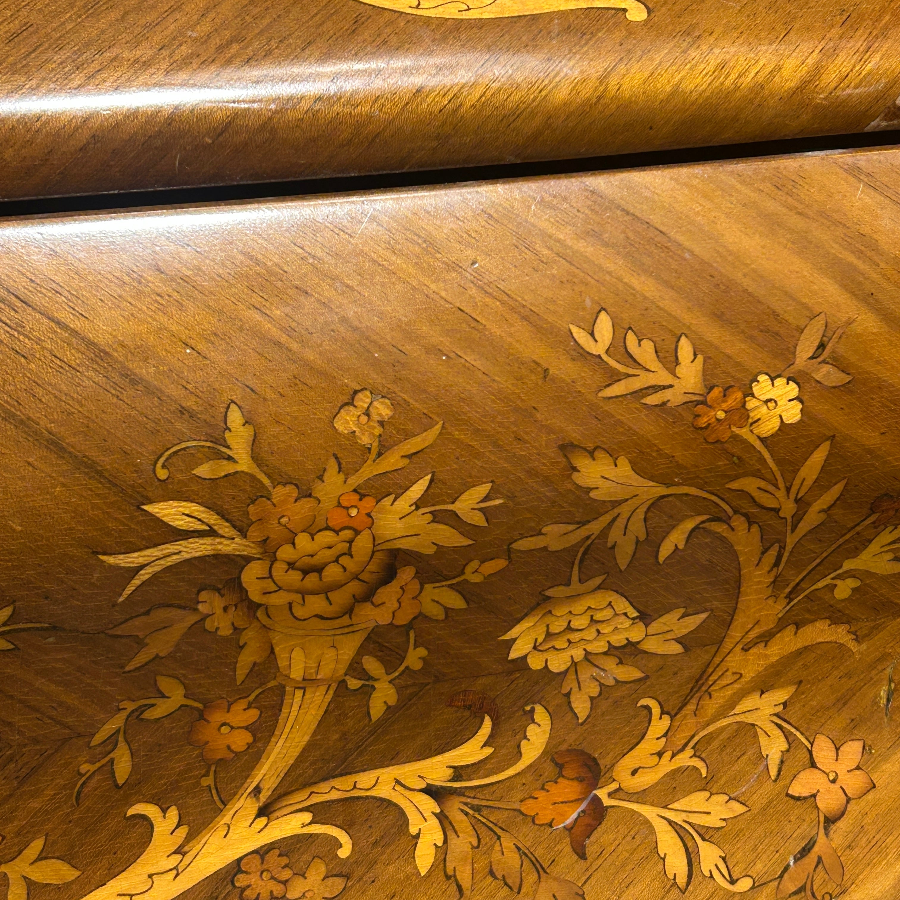 Hermoso secretaire francés en caoba rubia, palorosa, con profusa y detallada marquetería de diversos árboles frutales. de motivo floral en su puerta. Cuenta don dos cajones superiores. Tiene una particular manera de apertura ya que es la base del escritorio la abatible y la que se extiende para poder abrirlo. Su interior tiene cuero café claro con detalles dorados y dos cajones pequeños con tiradores de madera. La parte baja también tiene un cajón extendido con su respectiva llave la cual además tiene la particularidad de bloquear los cajones superiores y puerta abatible. Principios del siglo XX.