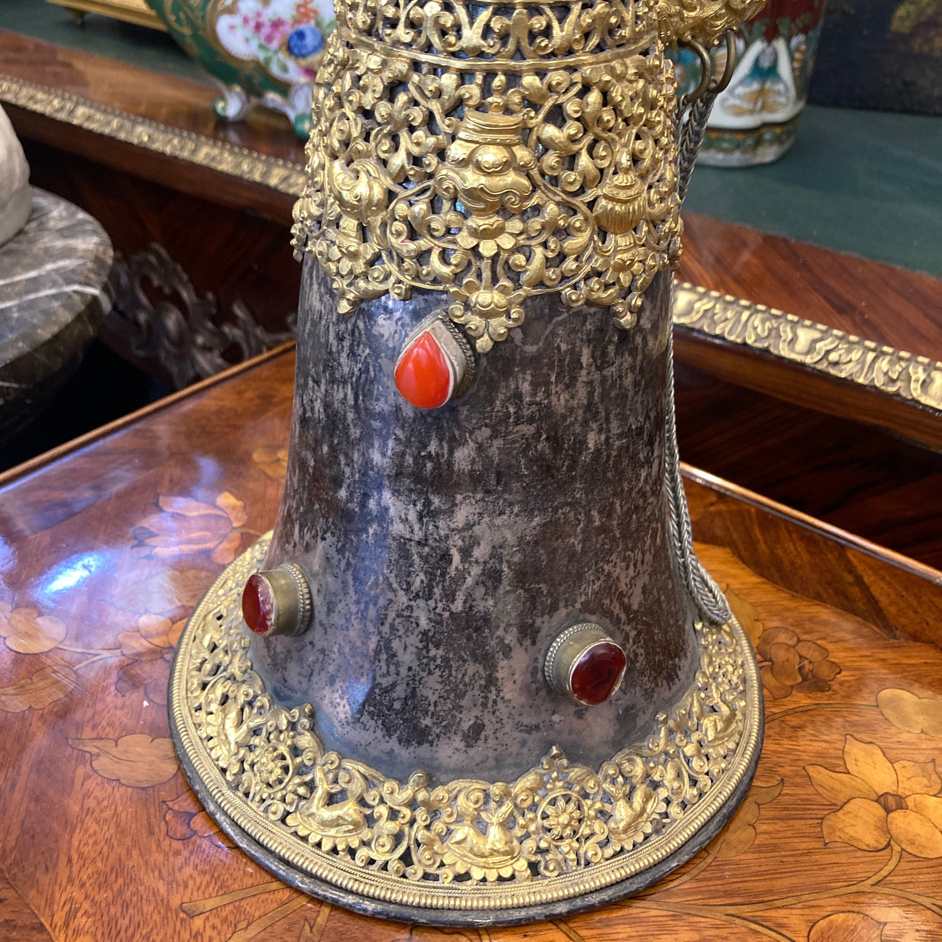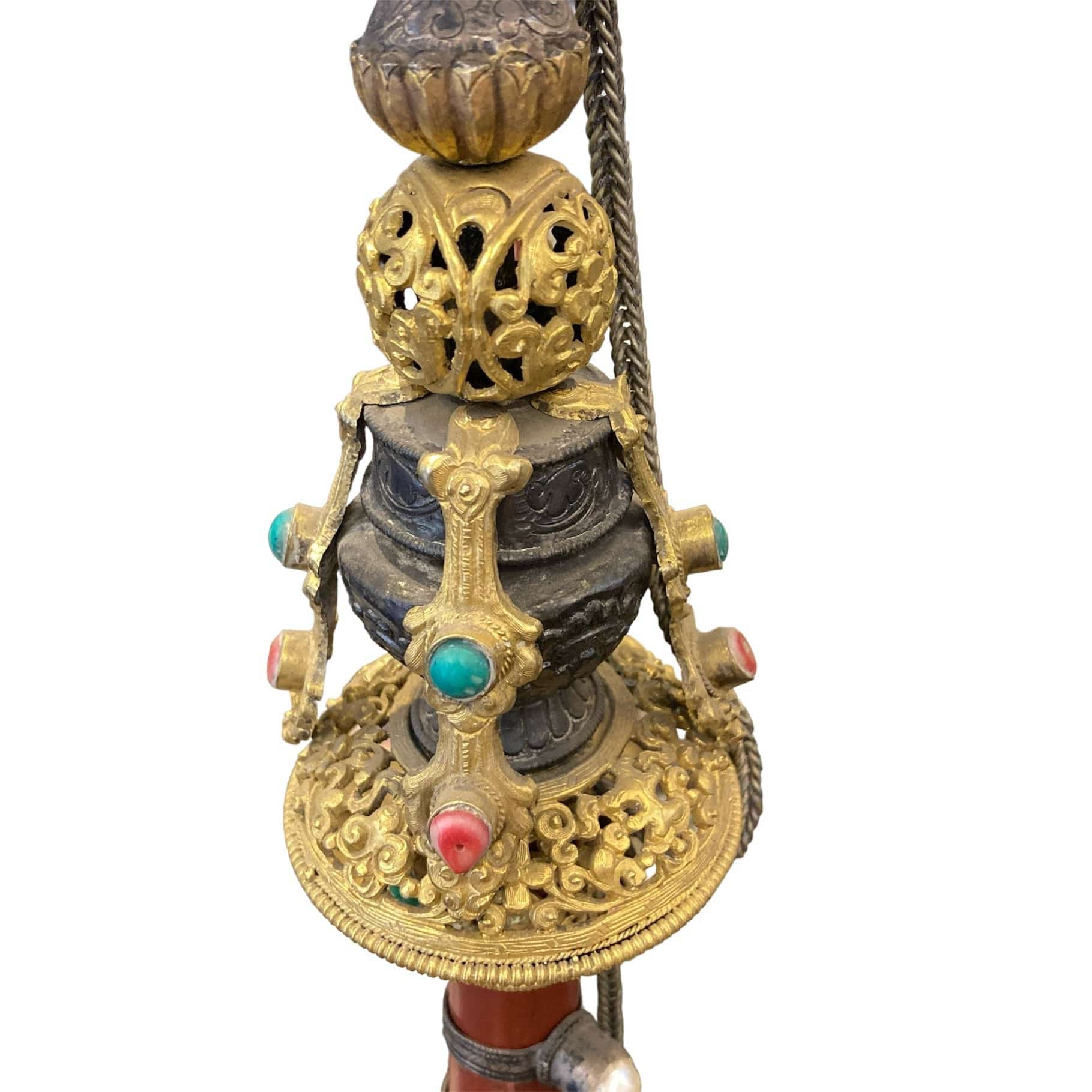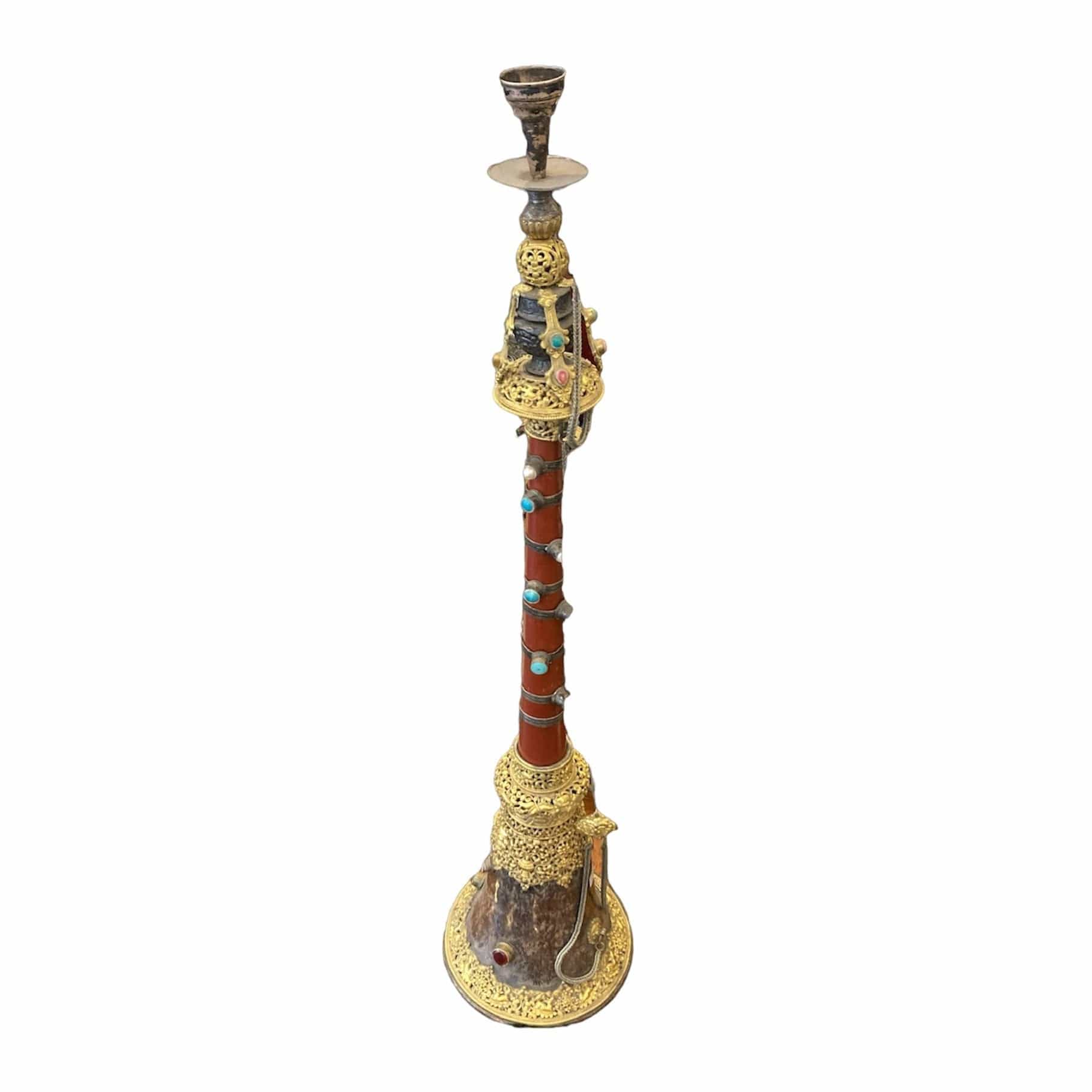 Hermosa y particular trompeta Tibetana o Rgya Gling. Cuenta con bellos detalles en bronce, y piedras preciosas, cuerpo de madera. Su nombre significa literalmente "flauta china", es un instrumento tradicional de viento de madera utilizado en el Tíbet. Como su nombre lo indica, es el cuerno chino Suona de doble caña que se usa principalmente en los monasterios tibetanos durante la puja y está asociado con deidades pacíficas y la idea de devoción