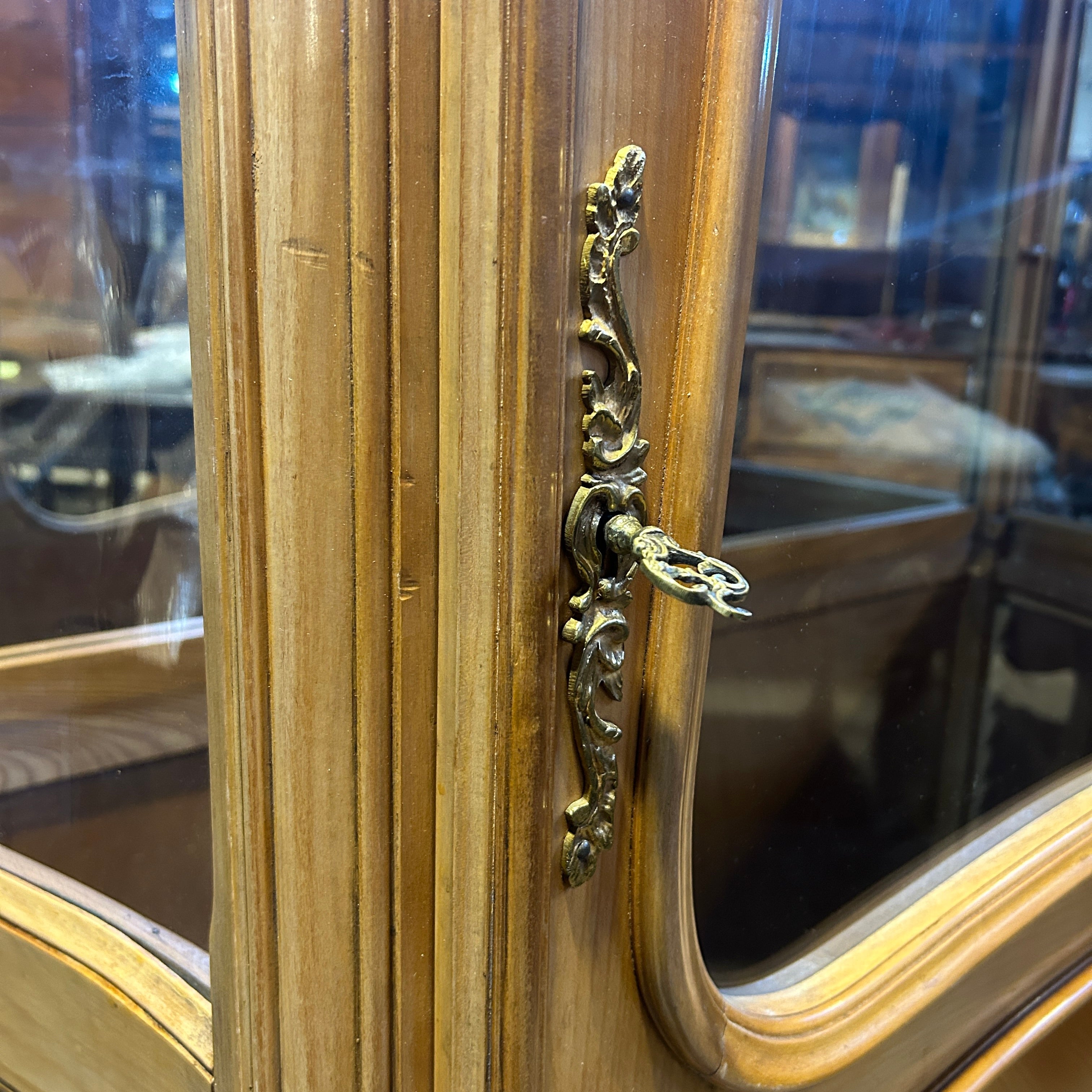 Vitrina francesa estilo Luis XV y fabricación contemporánea 1950, diseño bombé y contrabombé, hecha de madera de citronnier tallada, bocallave de bronce, patas talladas, espejo interior y sistema de iluminación.