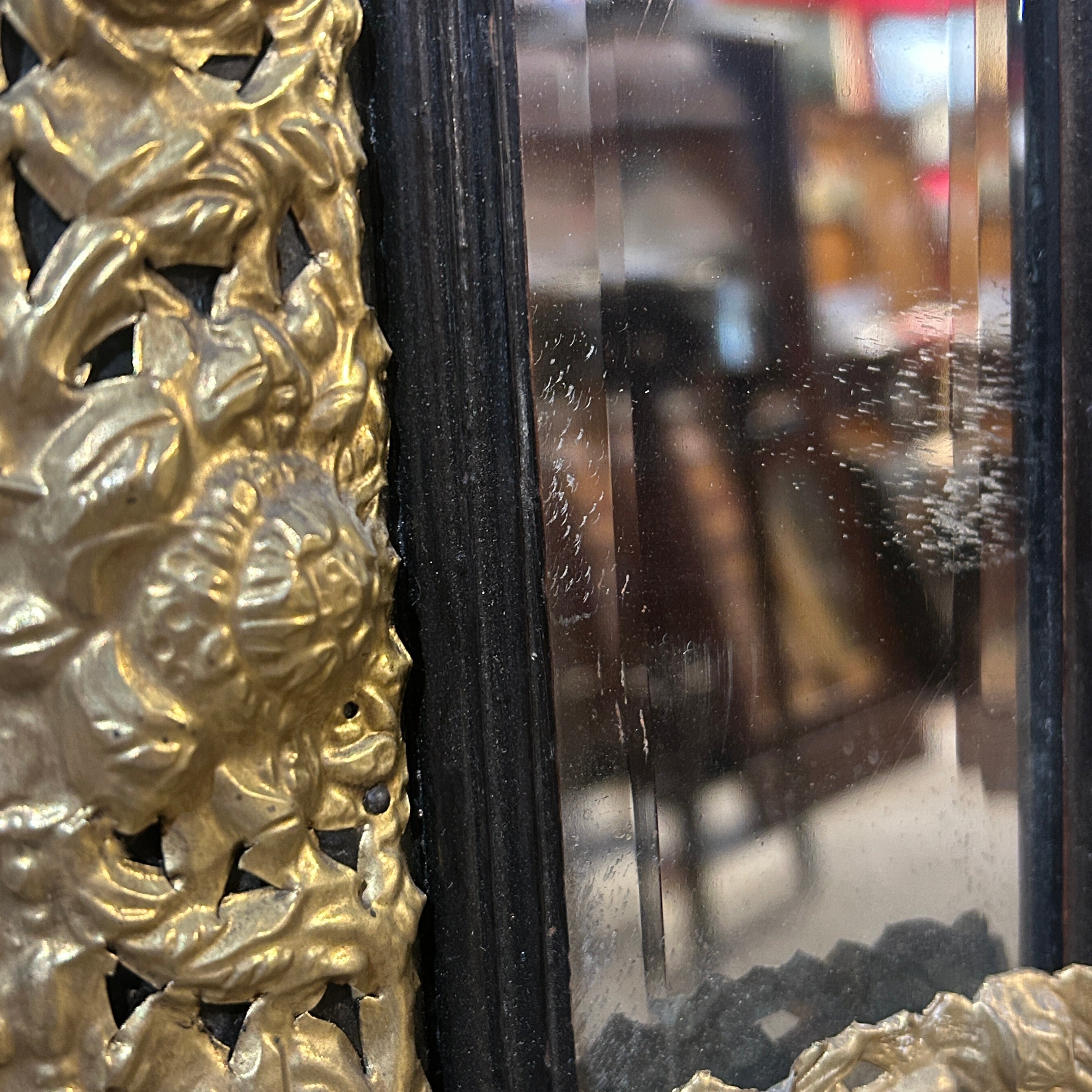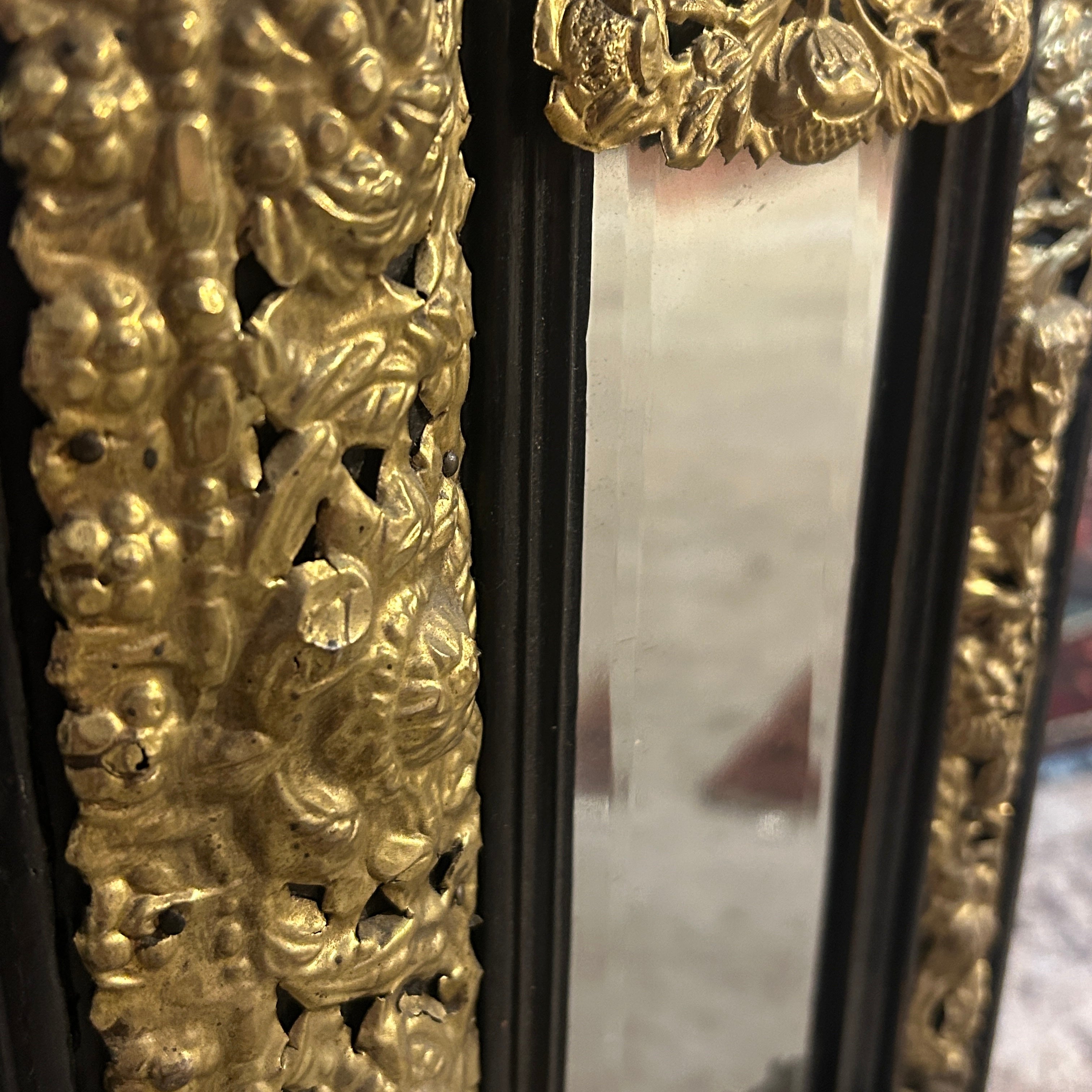 Elegante espejo francés estilo Napoleón III, siglo XIX, de diseño rectangular completamente hecho a mano en madera dorada, con molduras y decorada con querubines y flores. El espejo se encuentra doblemente biselado, mientras que su marco es de madera con terminación en negro y molduras de latón bronceado.