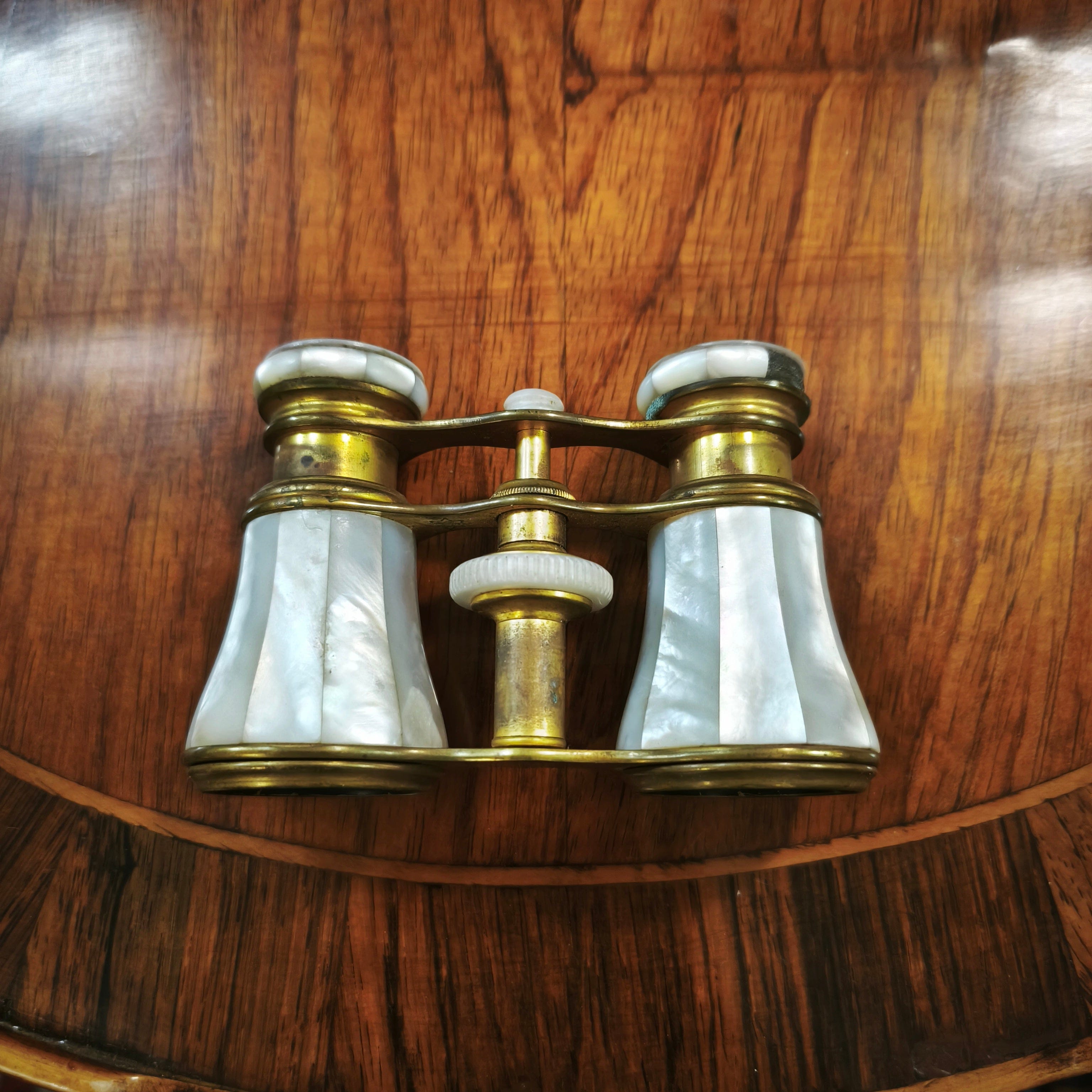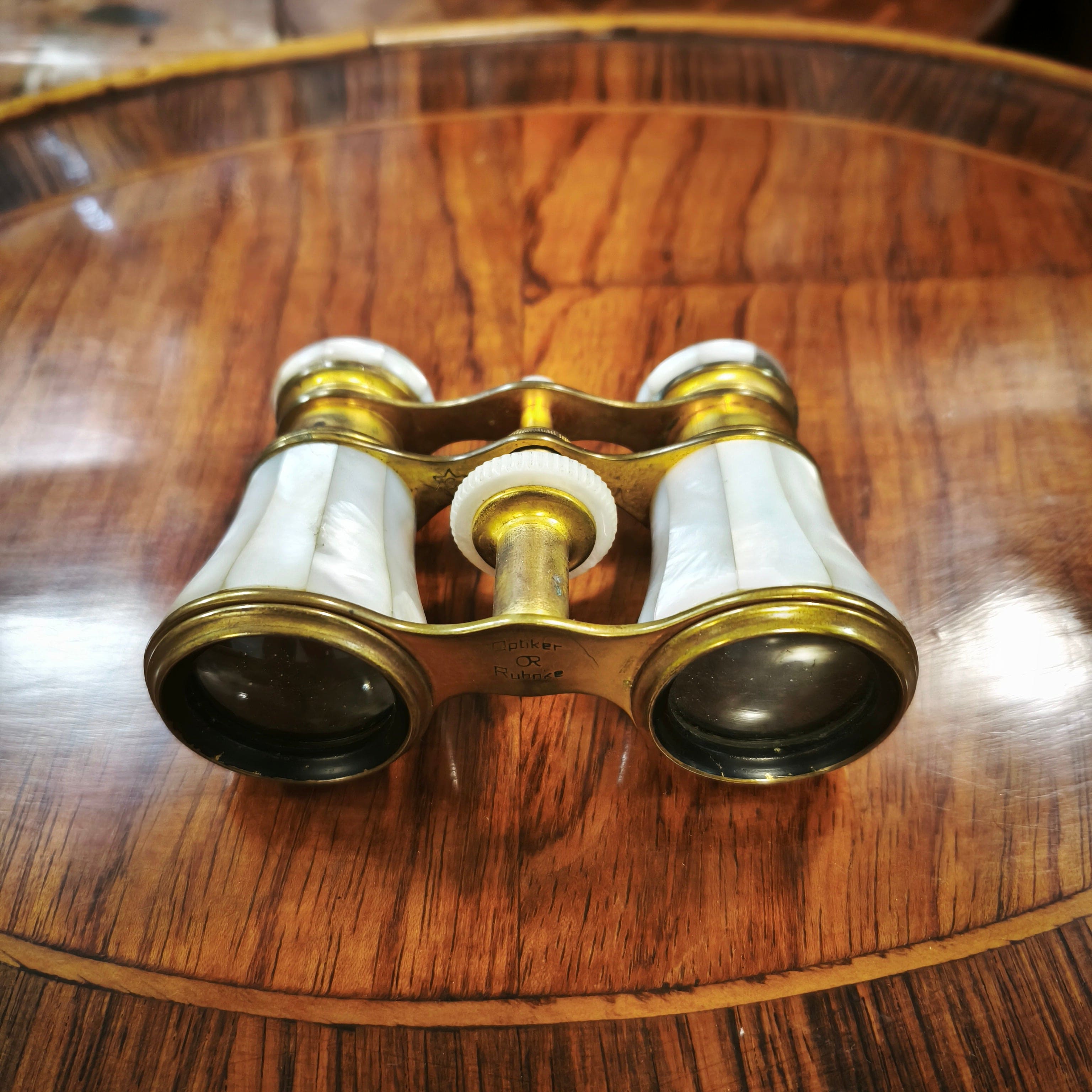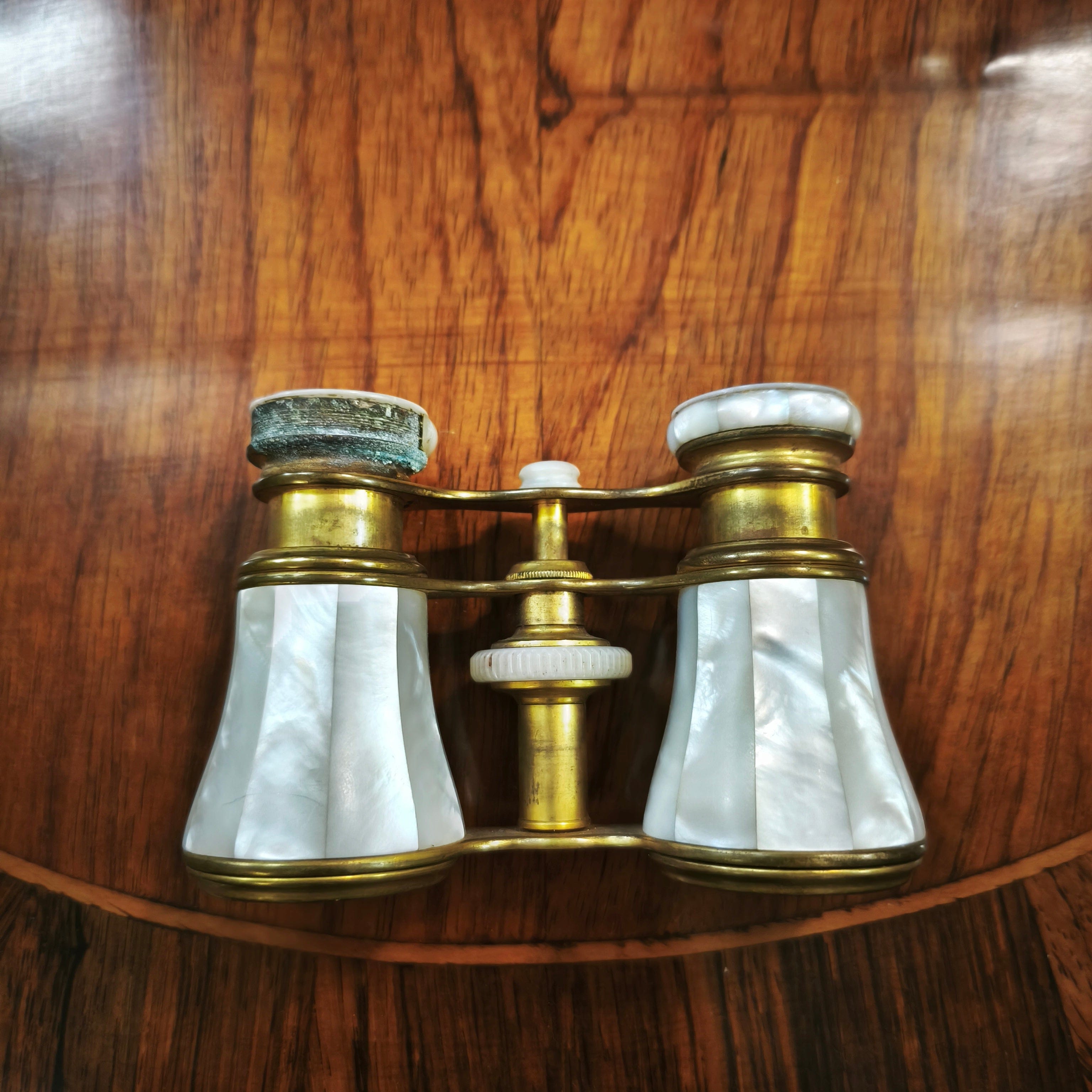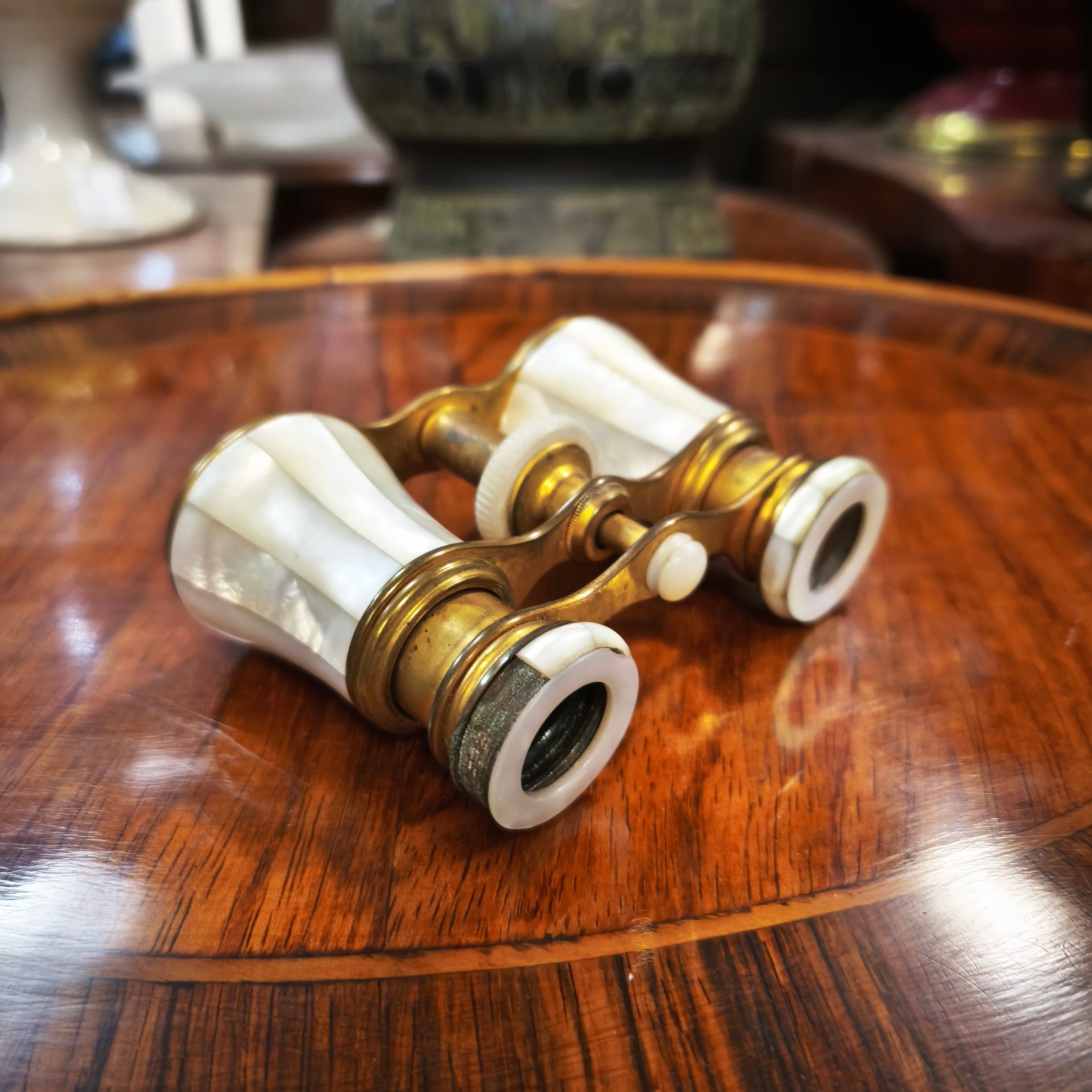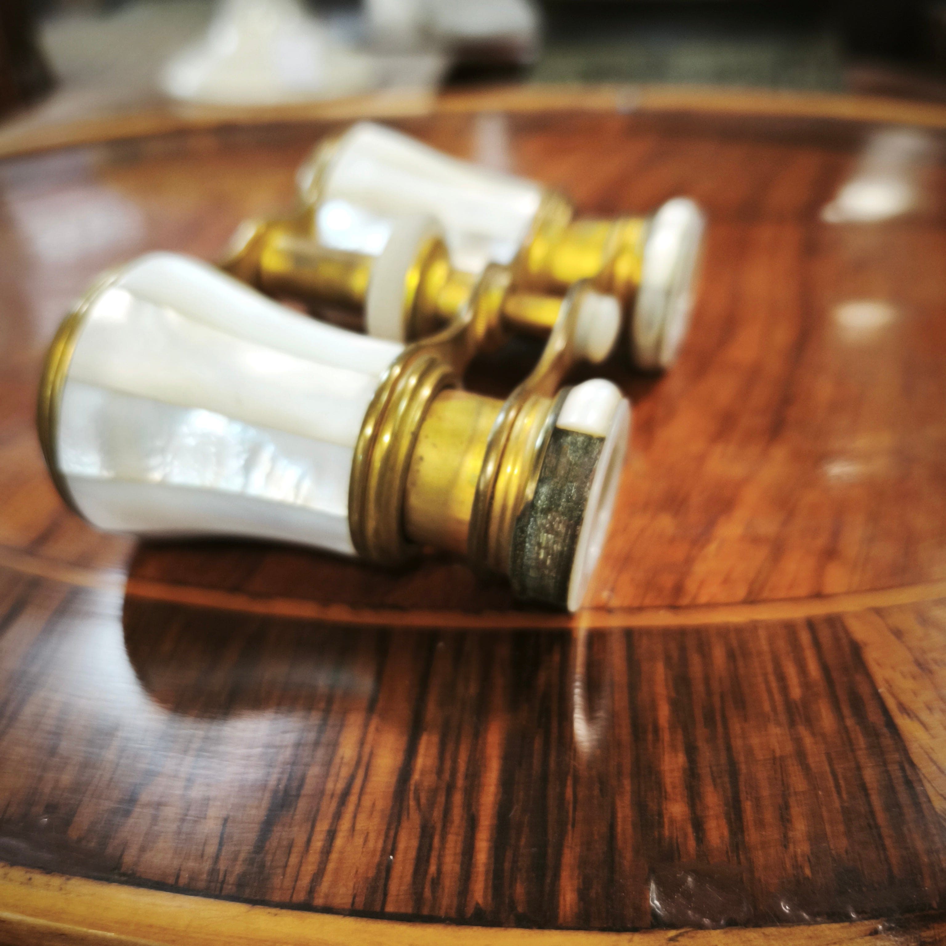 Hermosos binoculares prismáticos de metal dorado y nácar blanco. En su momento utilizados para la opera. Falta un cristal, por lo que actualmente son una pieza decorativa.