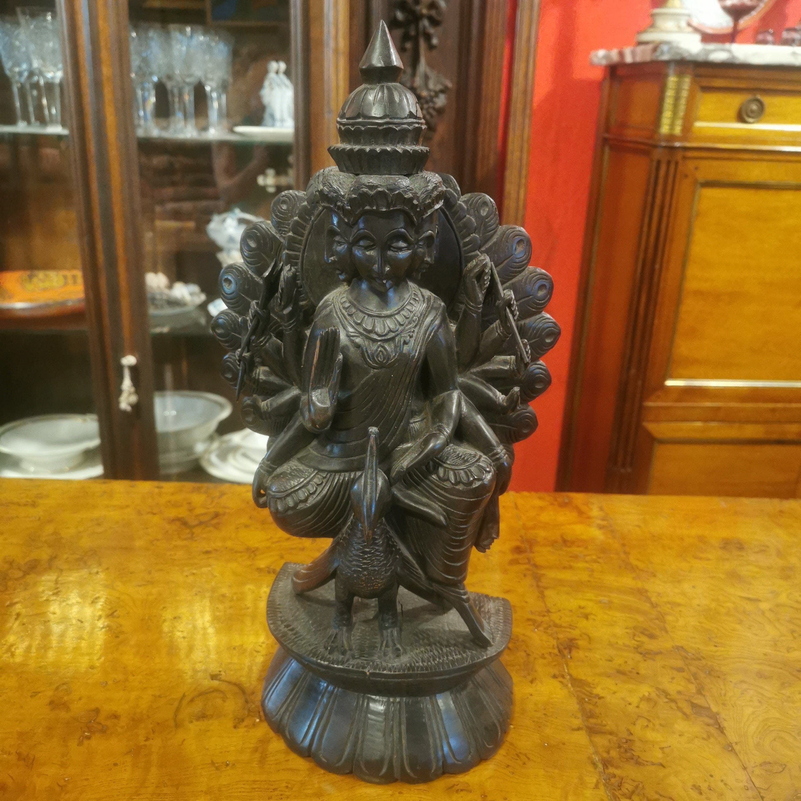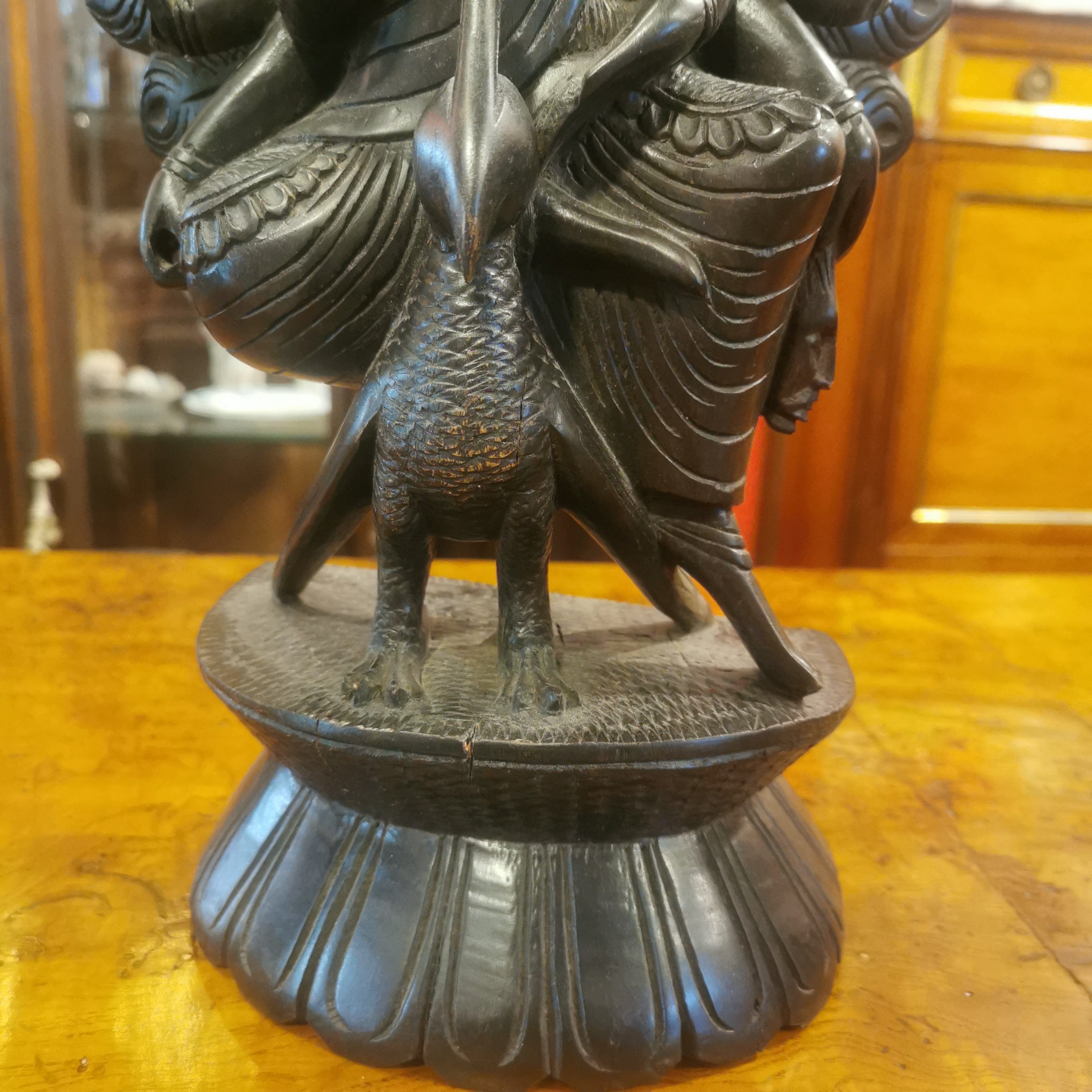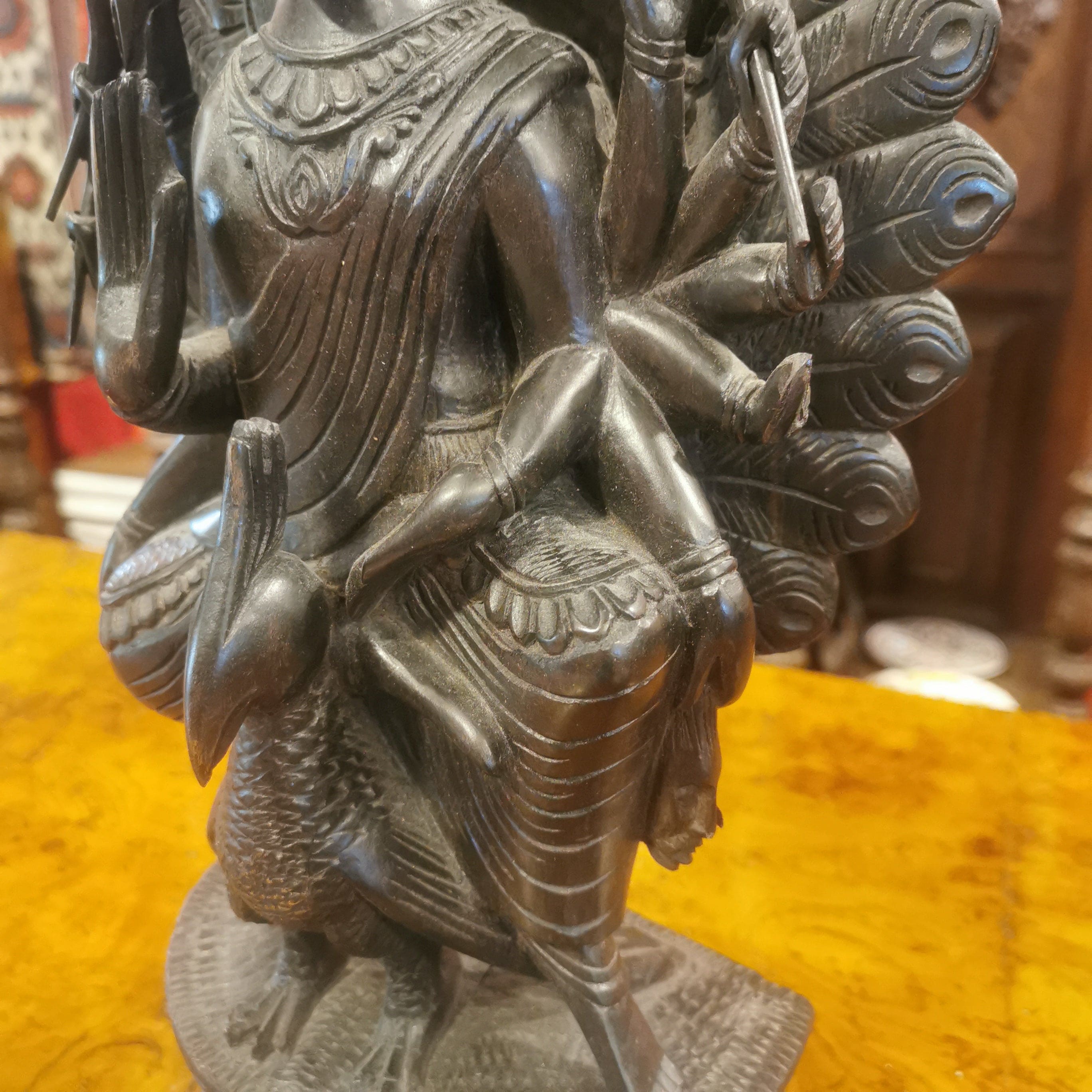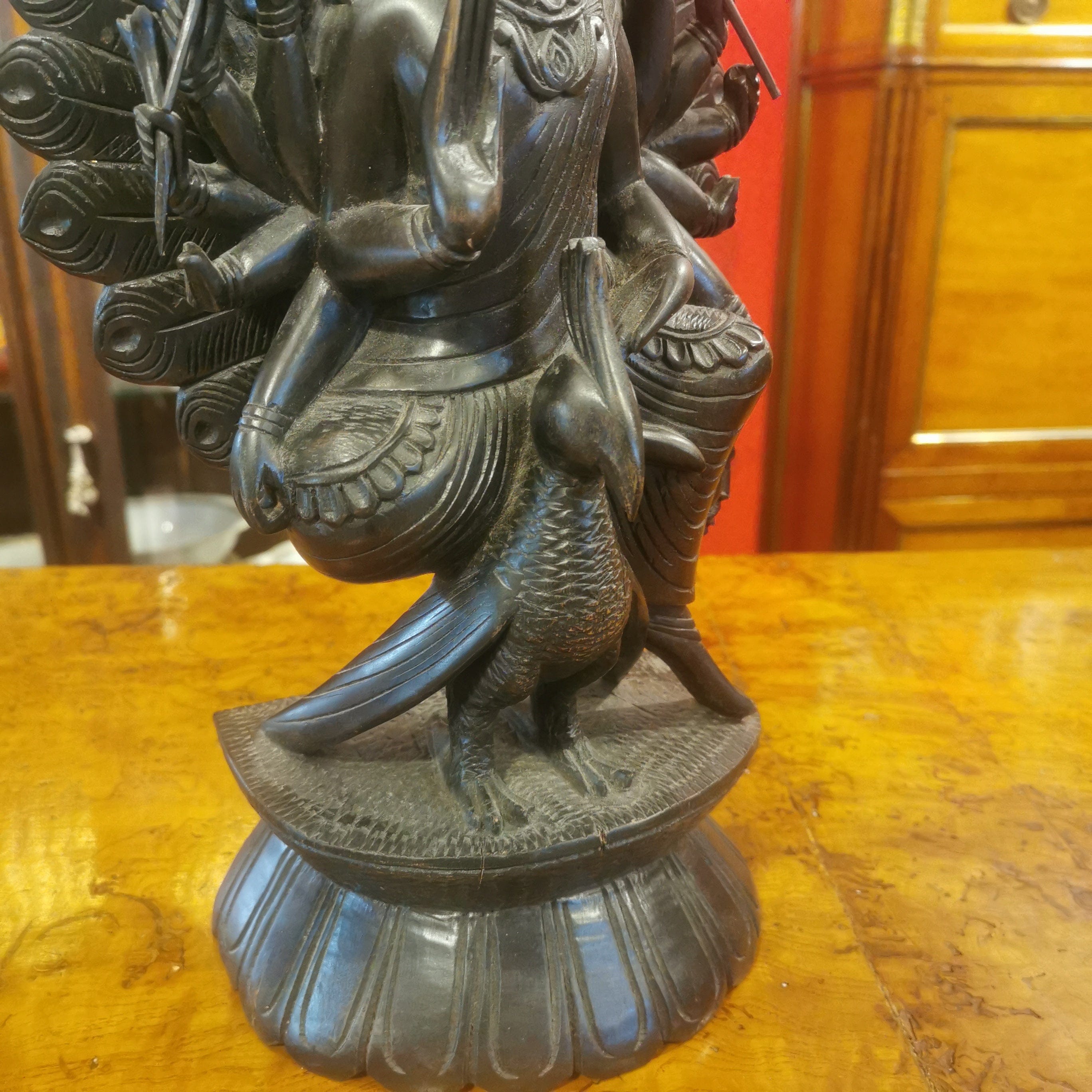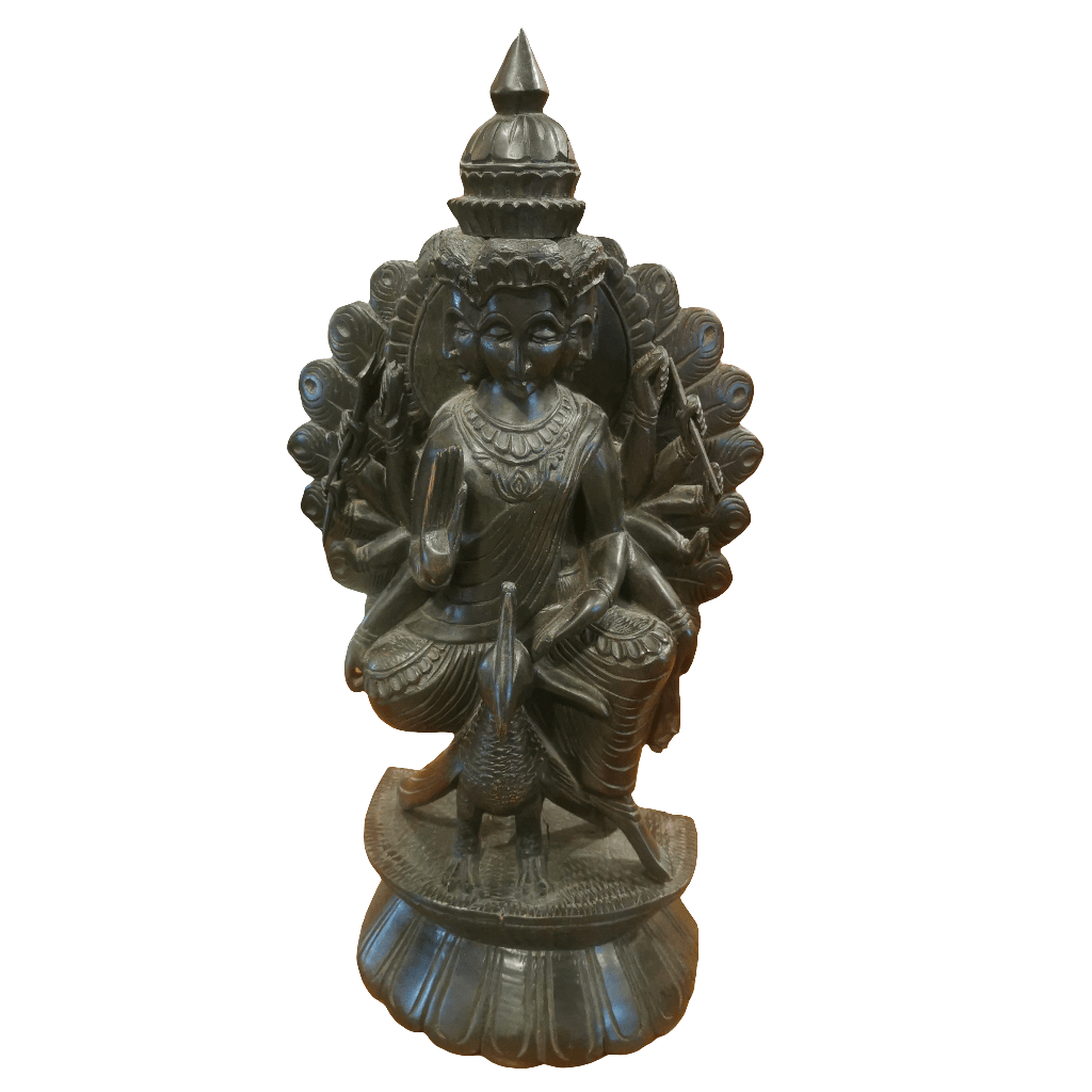 Figura de madera de fierro, representando al Dios hindú de la guerra Kartikeya. Kartikeya es el comandante en jefe del ejército de los dioses, y se le representa con armas como la lanza, la espada, la jabalina, el disco, la maza y el arco. Su montura es un pavo real, que simboliza la destrucción del ego.