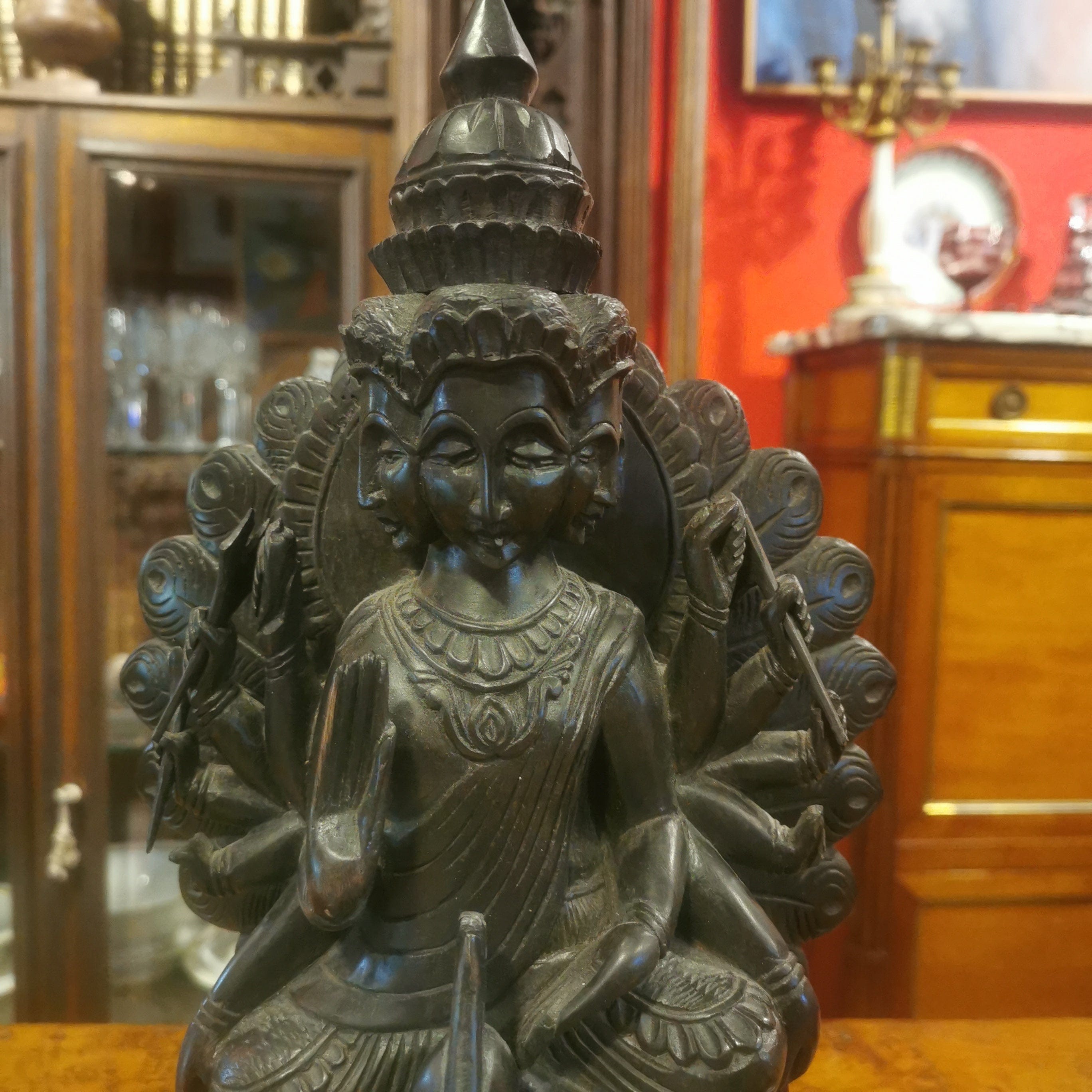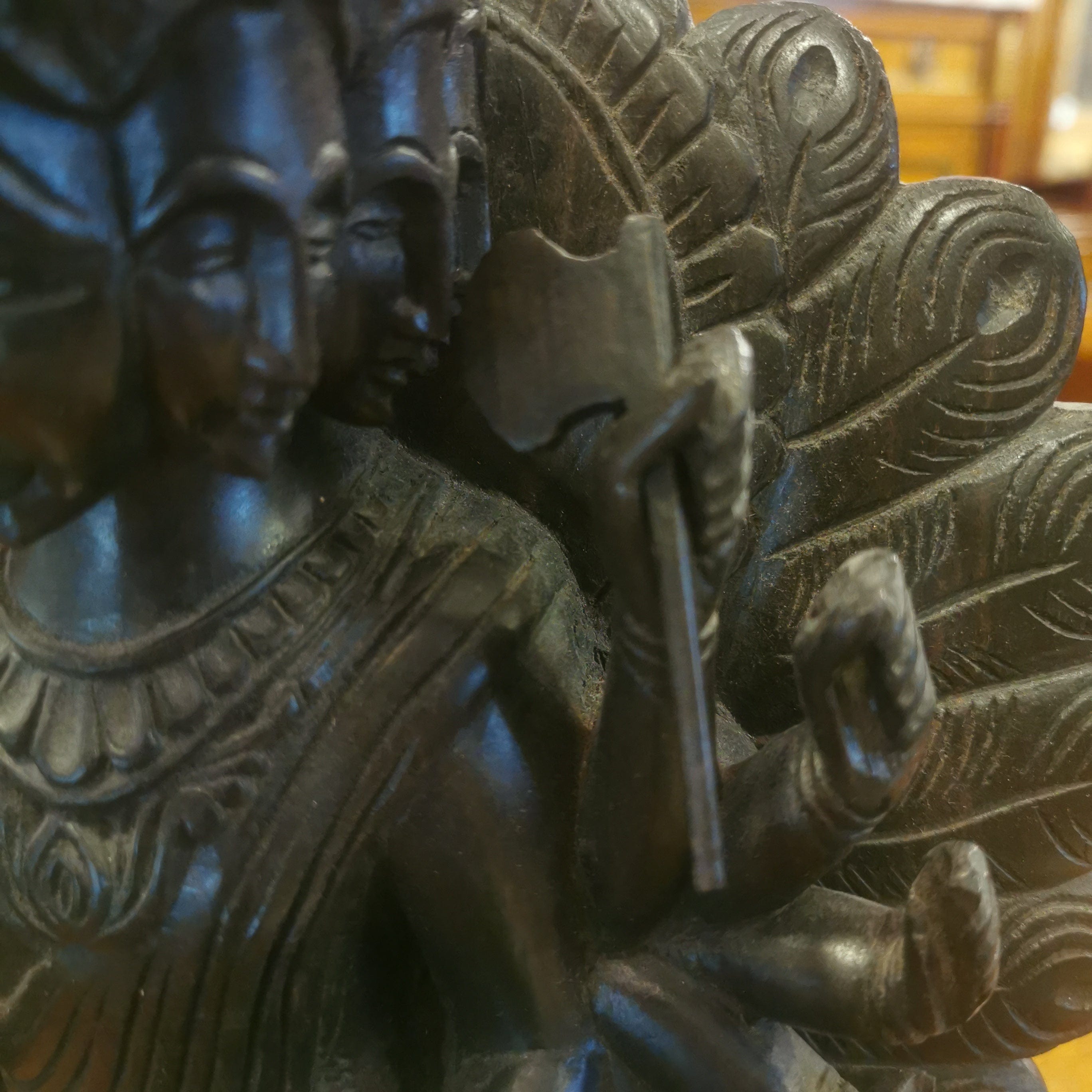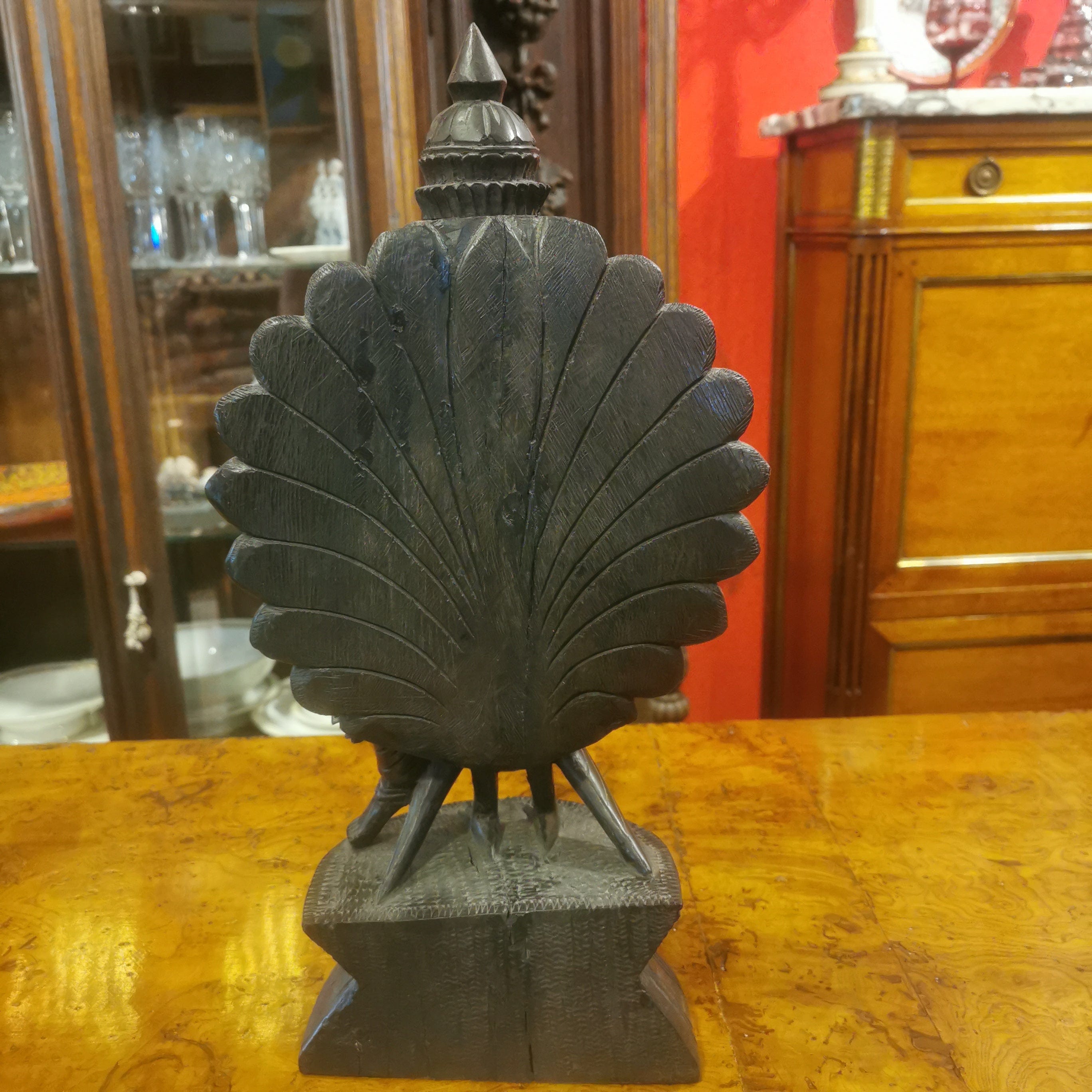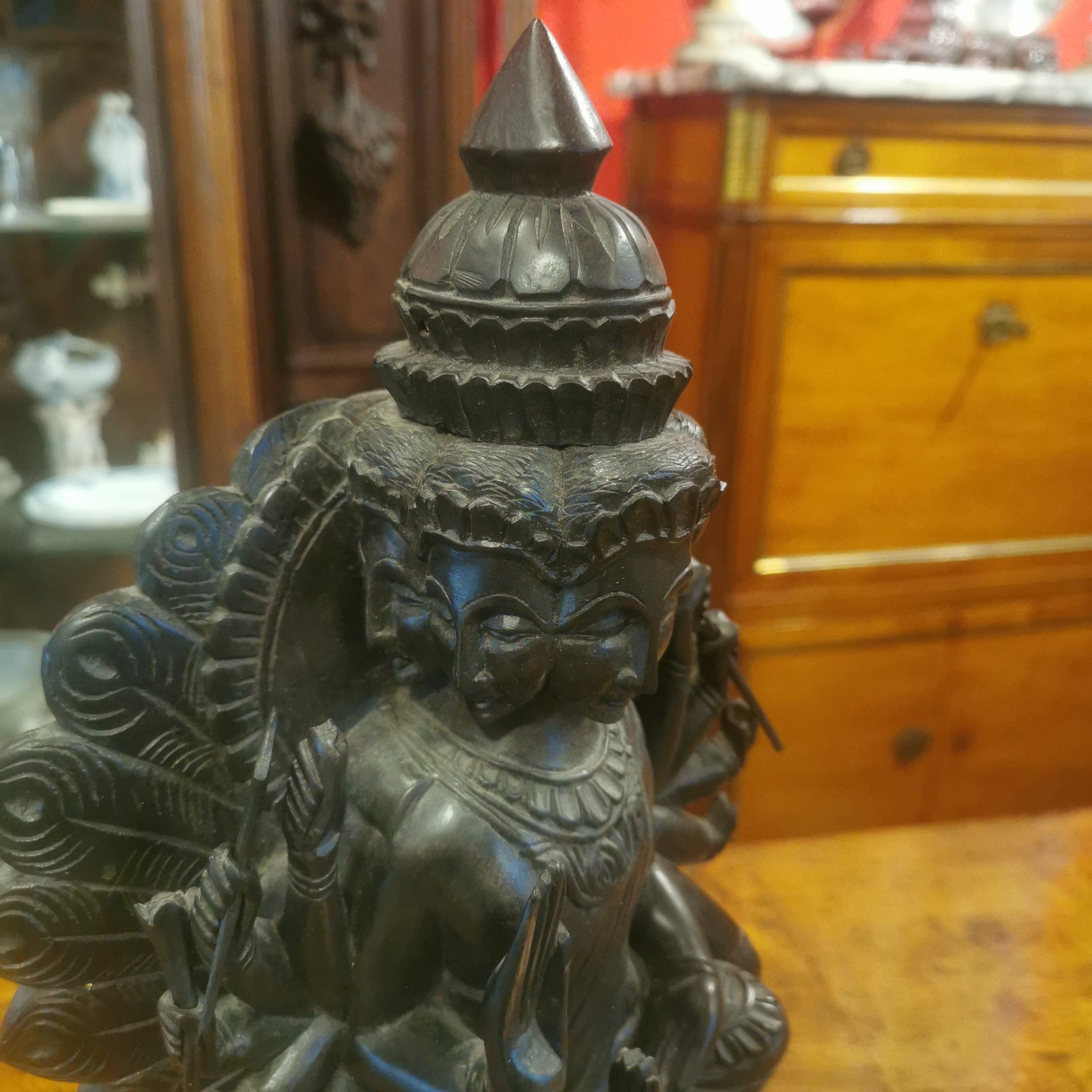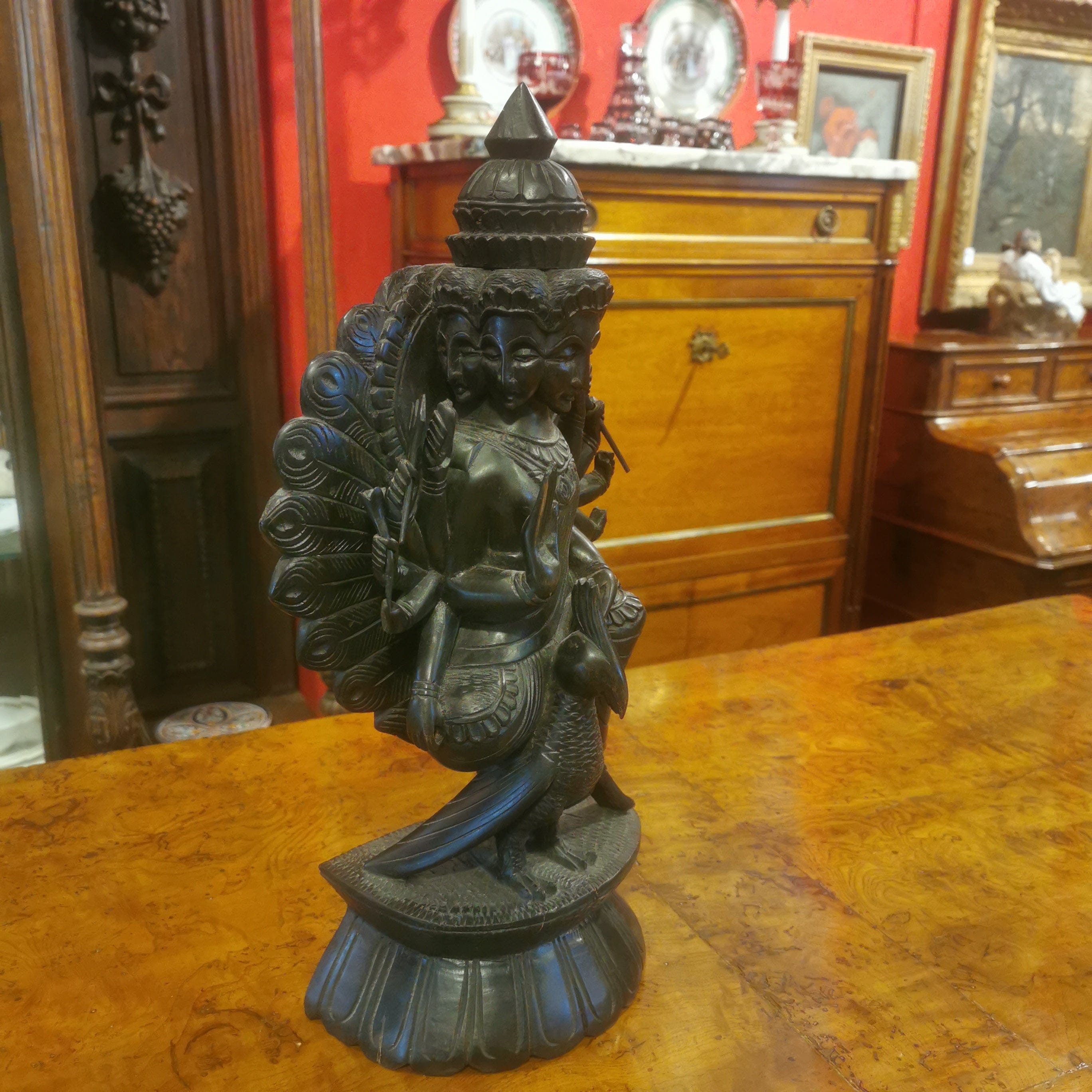 Figura de madera de fierro, representando al Dios hindú de la guerra Kartikeya. Kartikeya es el comandante en jefe del ejército de los dioses, y se le representa con armas como la lanza, la espada, la jabalina, el disco, la maza y el arco. Su montura es un pavo real, que simboliza la destrucción del ego.