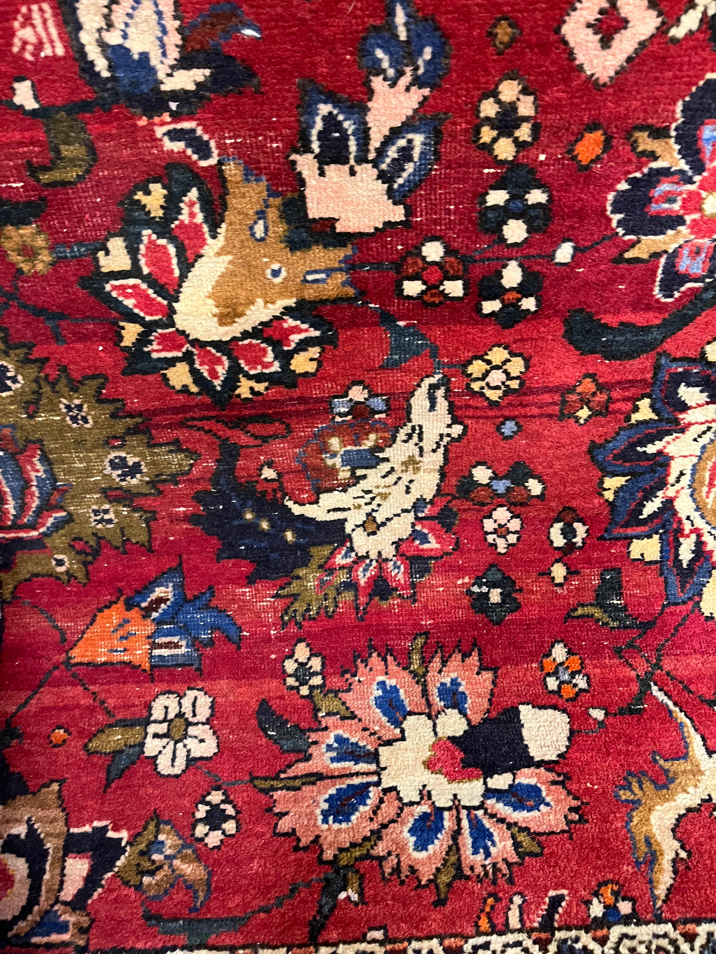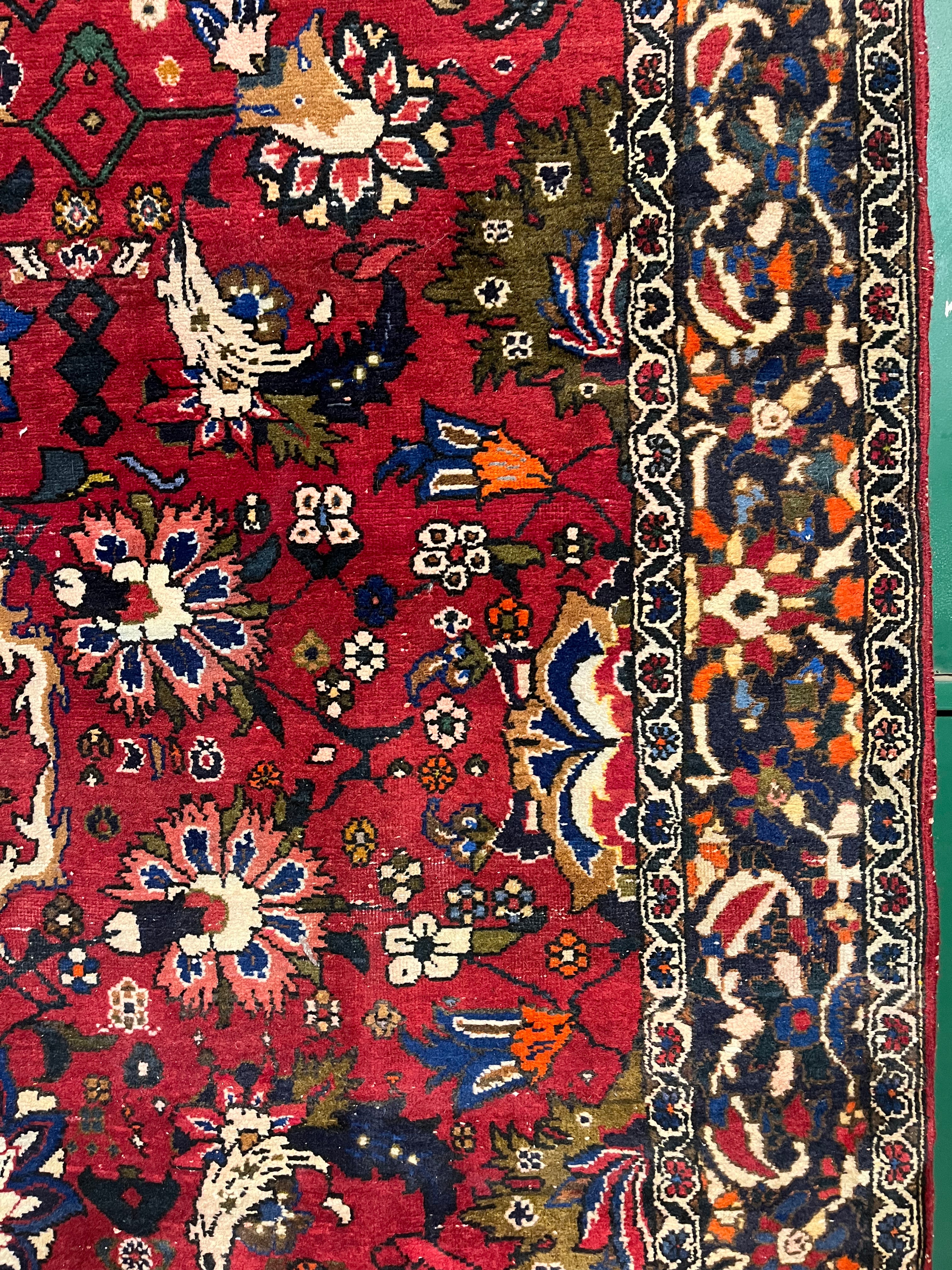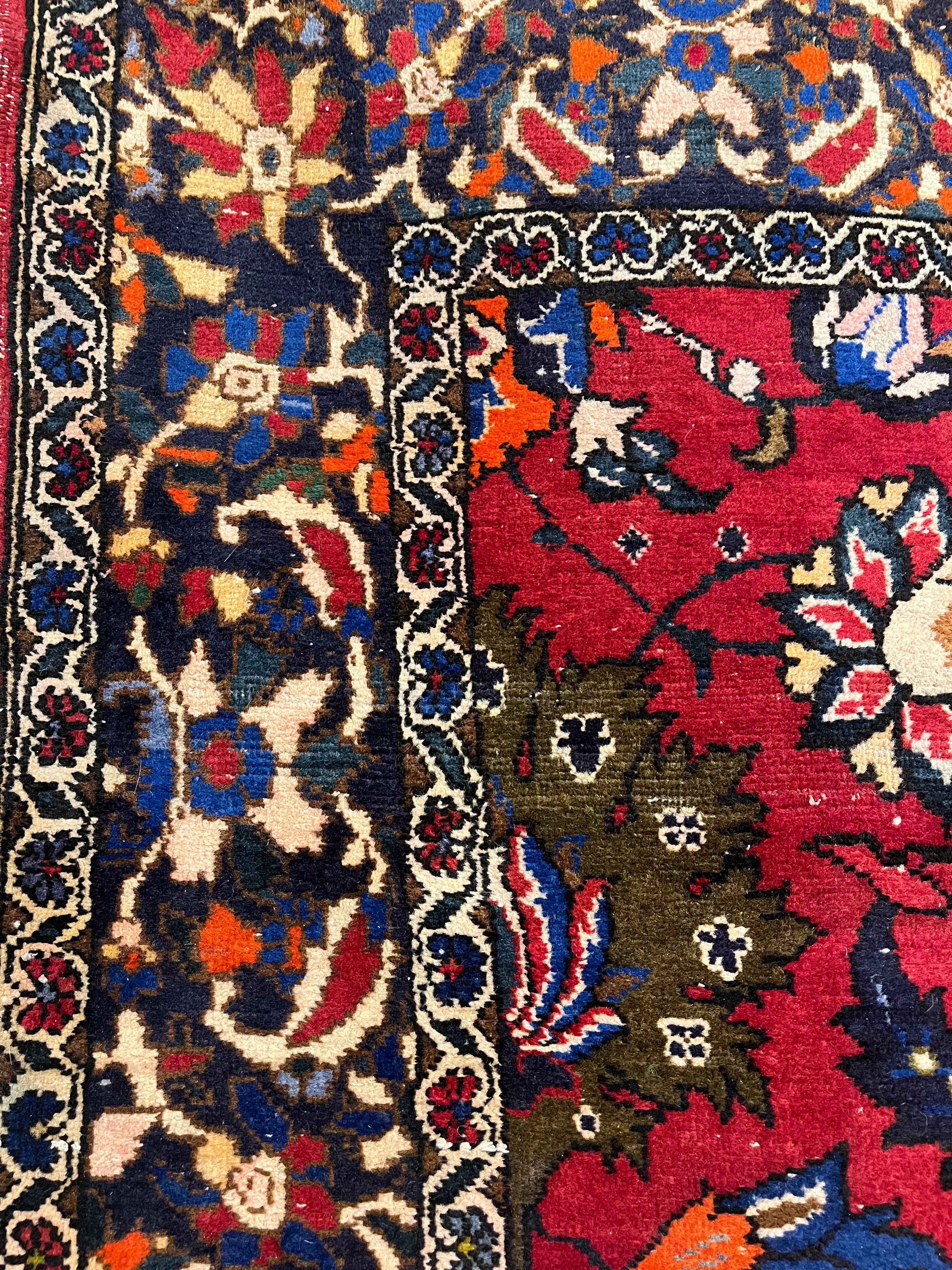 Hermosa alfombra persa Sarok proveniente de la región de Markazi, Irán. Presenta un fino trabajo de bordado completamente hecho a mano con motivos florales en medallones y guarda, destacando por la tintura artesanal utilizada, con vivos tonos azules y naranjos, difíciles de encontrar.