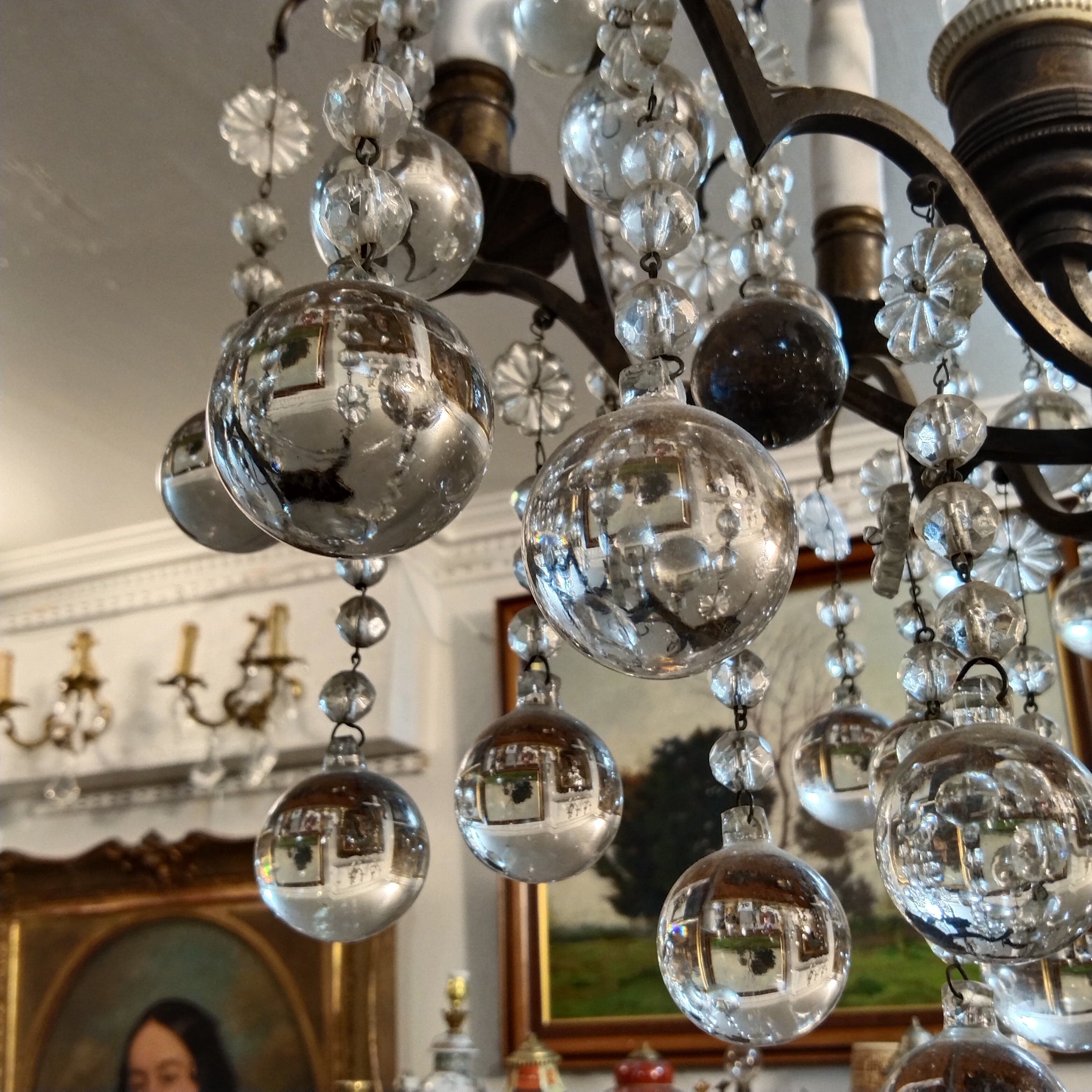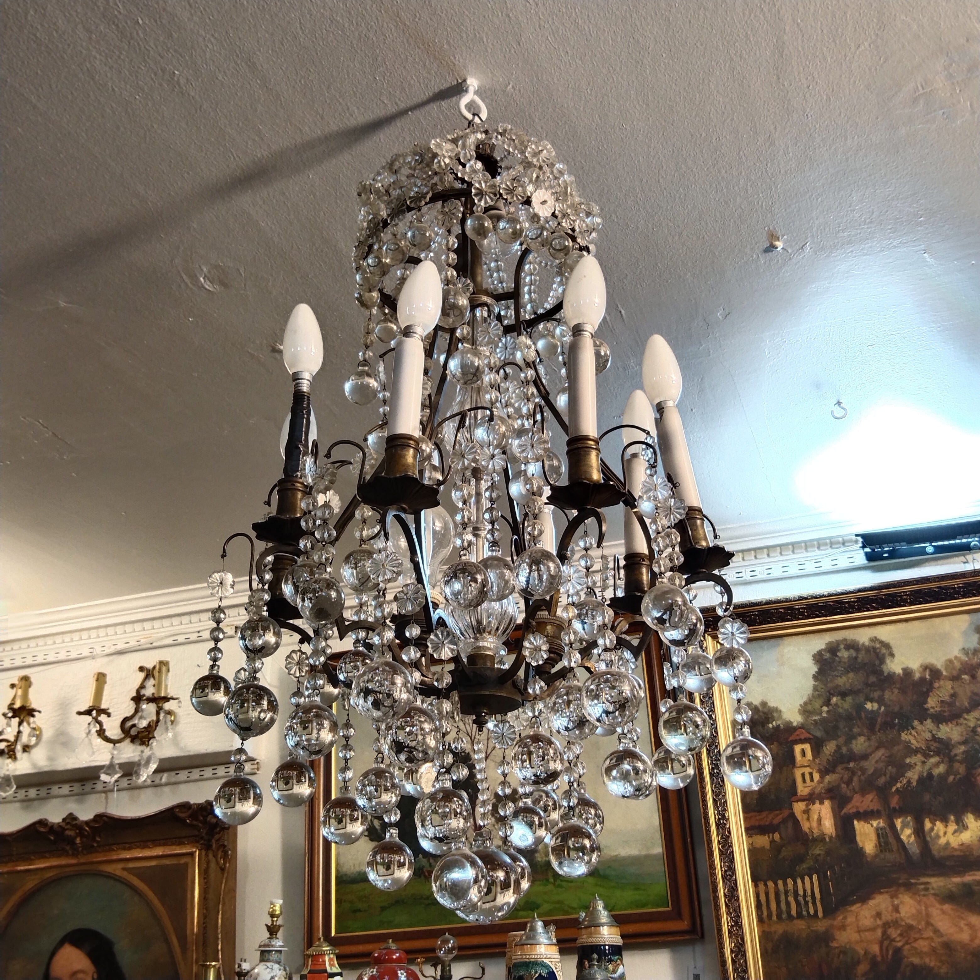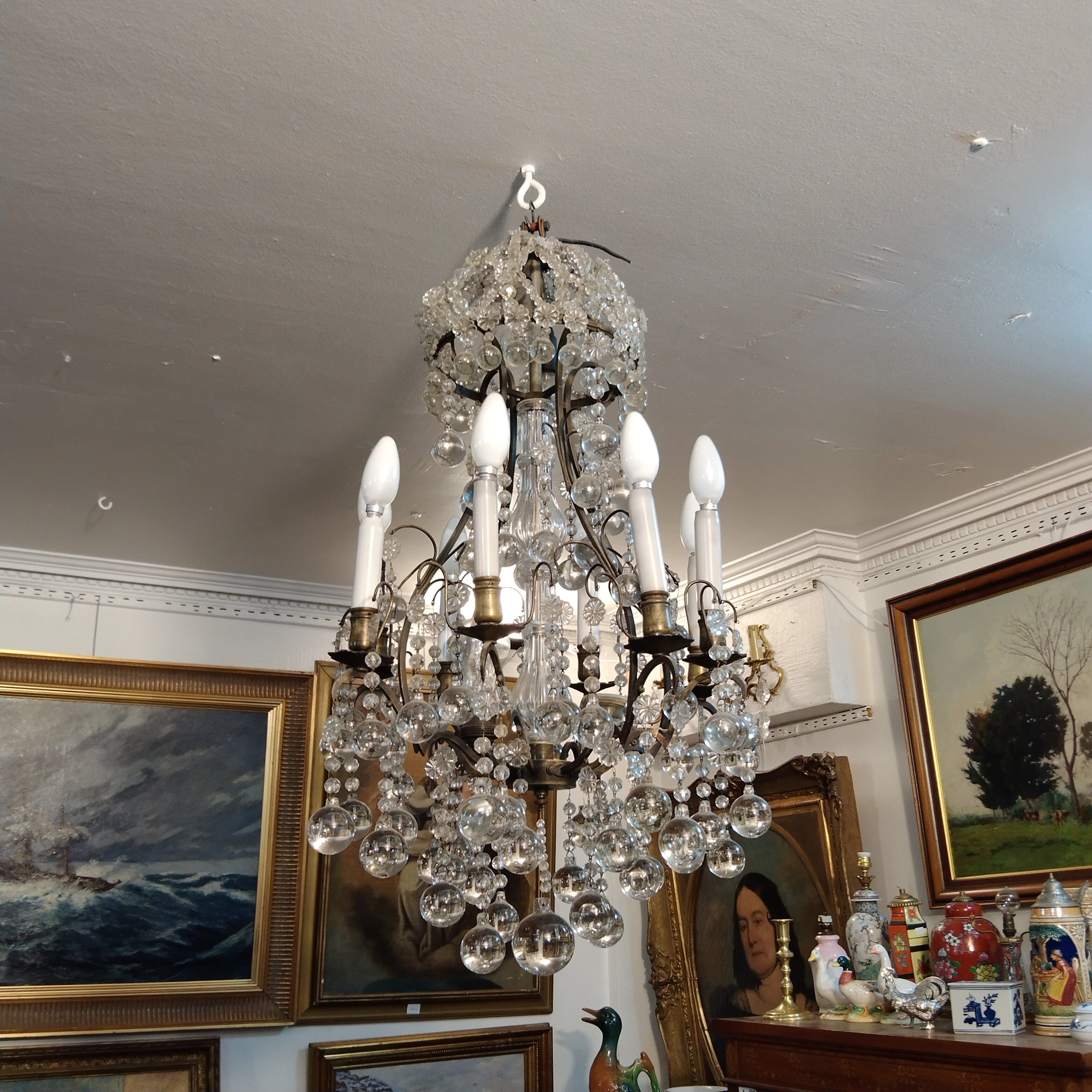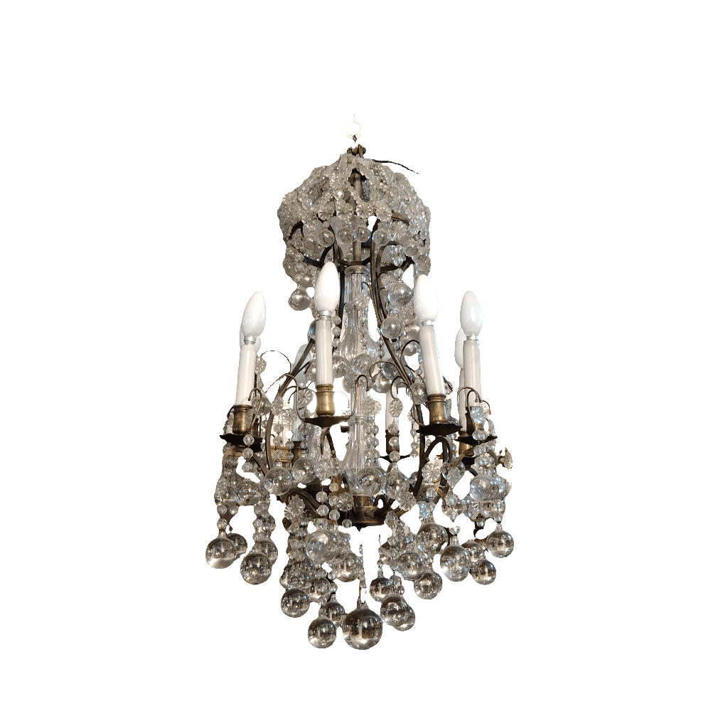 Bellísima lámpara de estructura de bronce y lágrimas de cristal redondas. La pieza tiene un centro recubierto en cristal y 10 candilejas, readaptas para ampolletas. Su sistema eléctrico está restaurado y en funcionamiento.