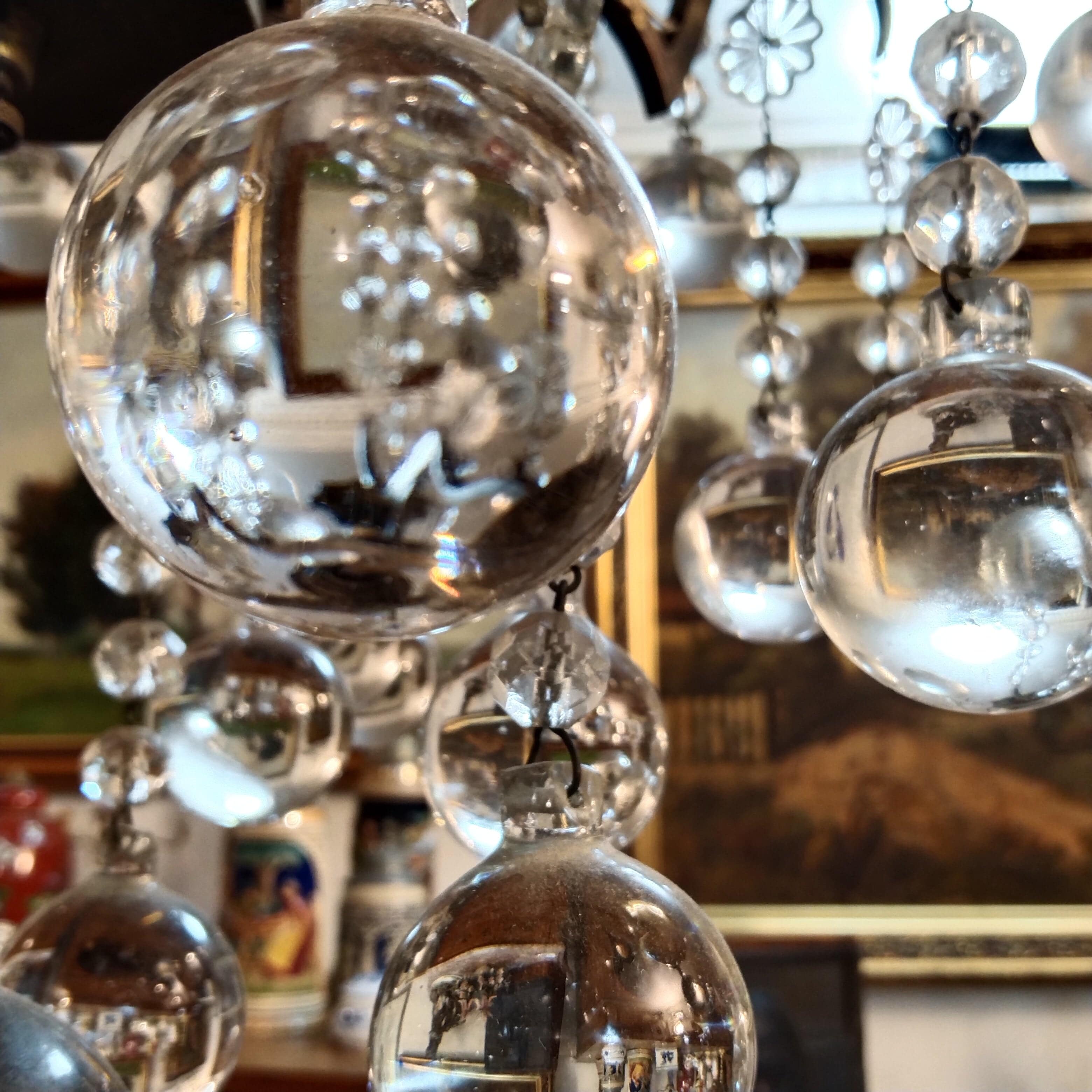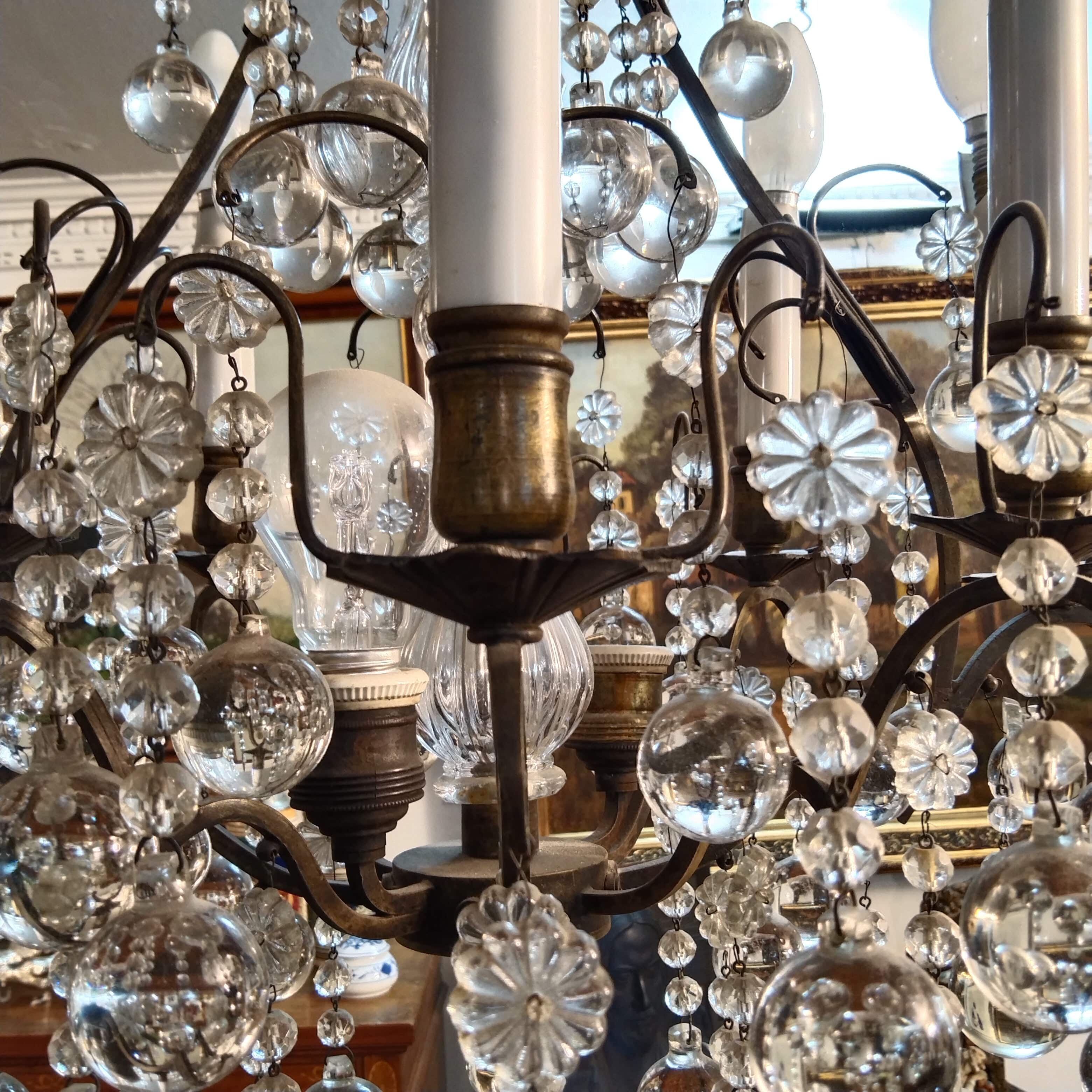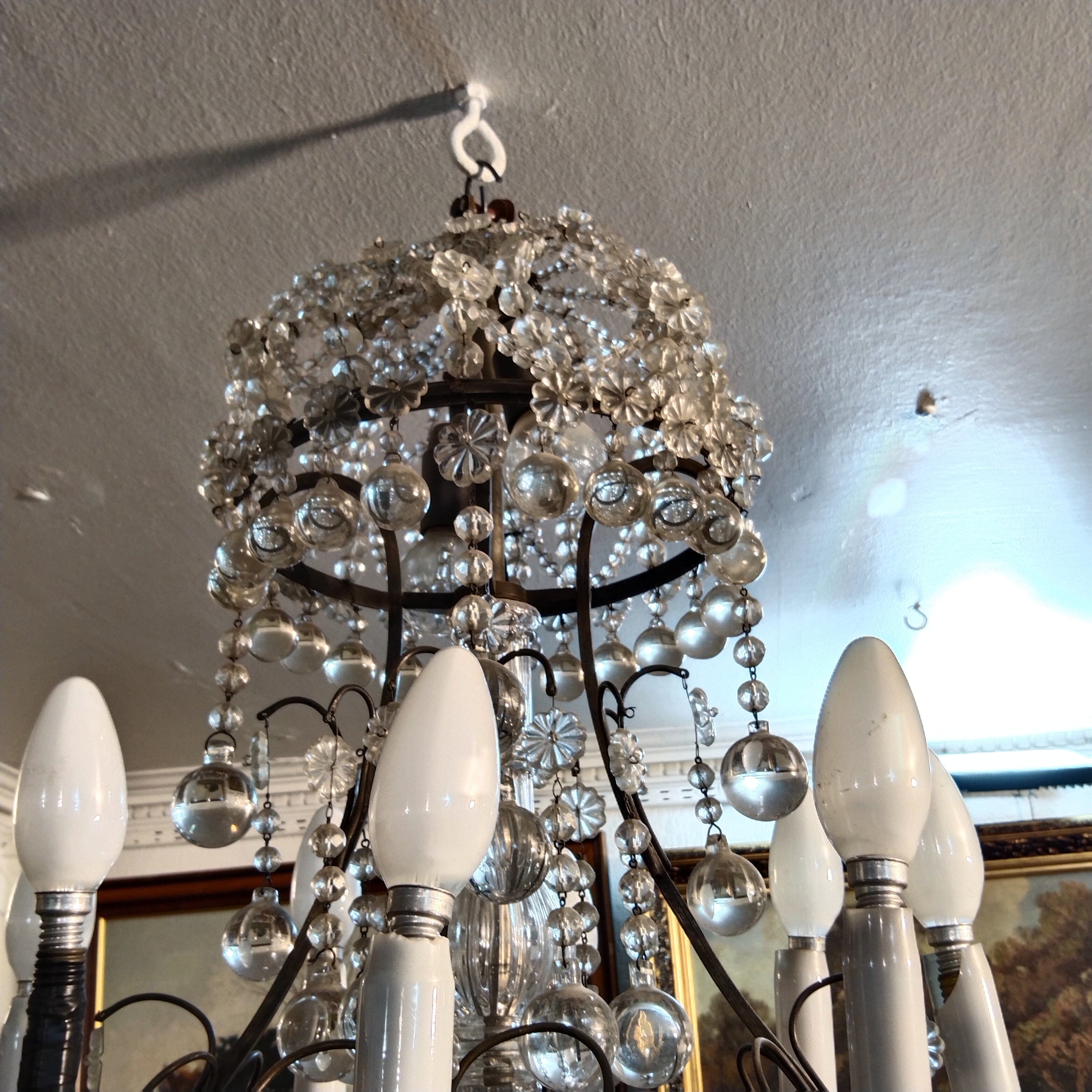 Bellísima lámpara de estructura de bronce y lágrimas de cristal redondas. La pieza tiene un centro recubierto en cristal y 10 candilejas, readaptas para ampolletas. Su sistema eléctrico está restaurado y en funcionamiento.
