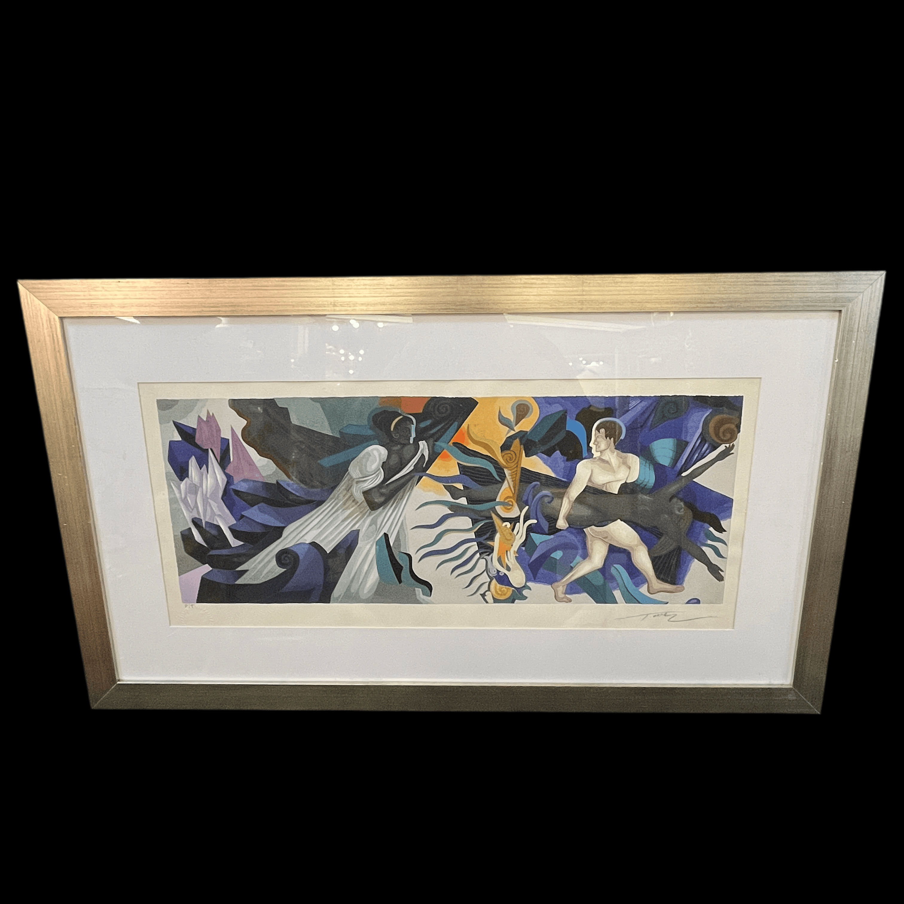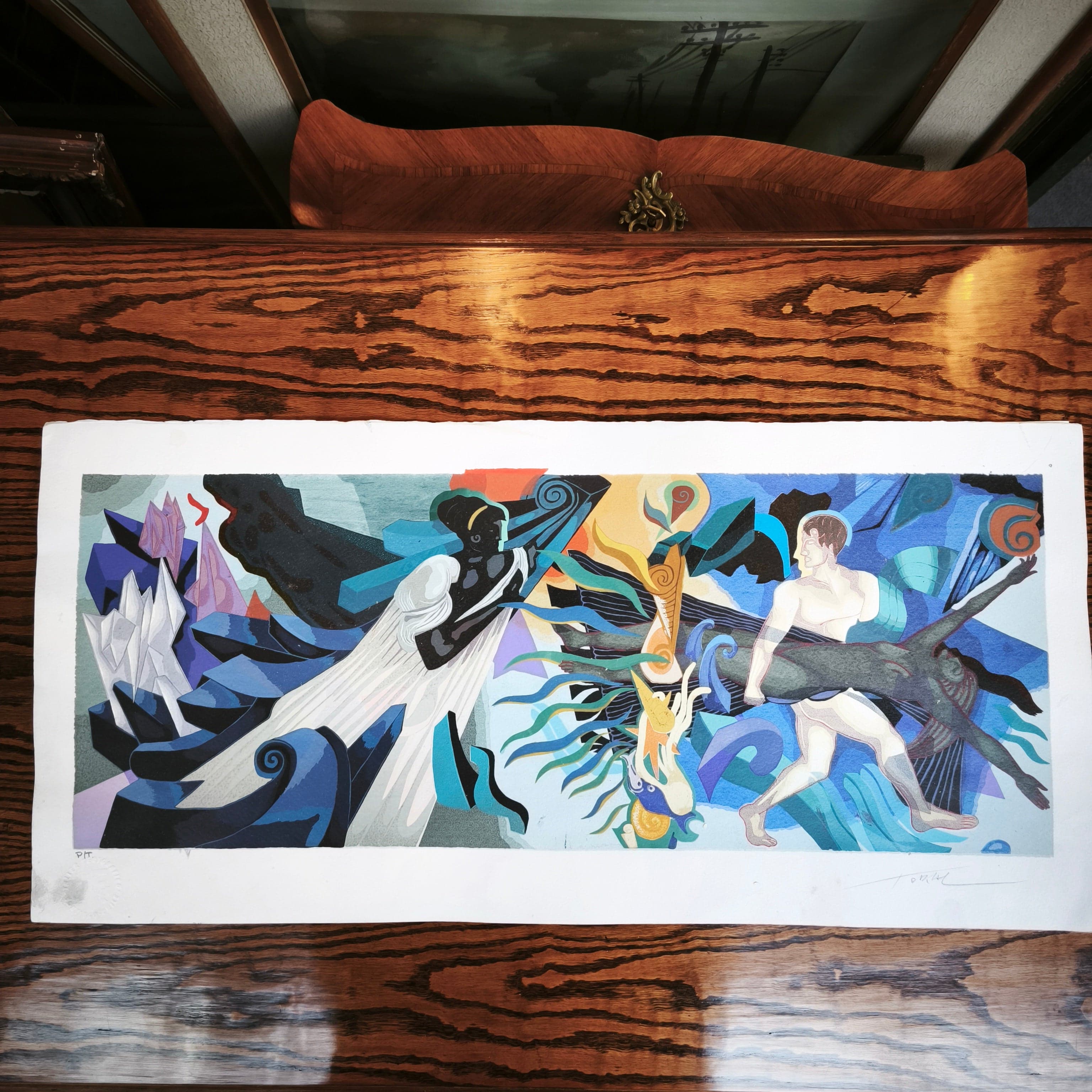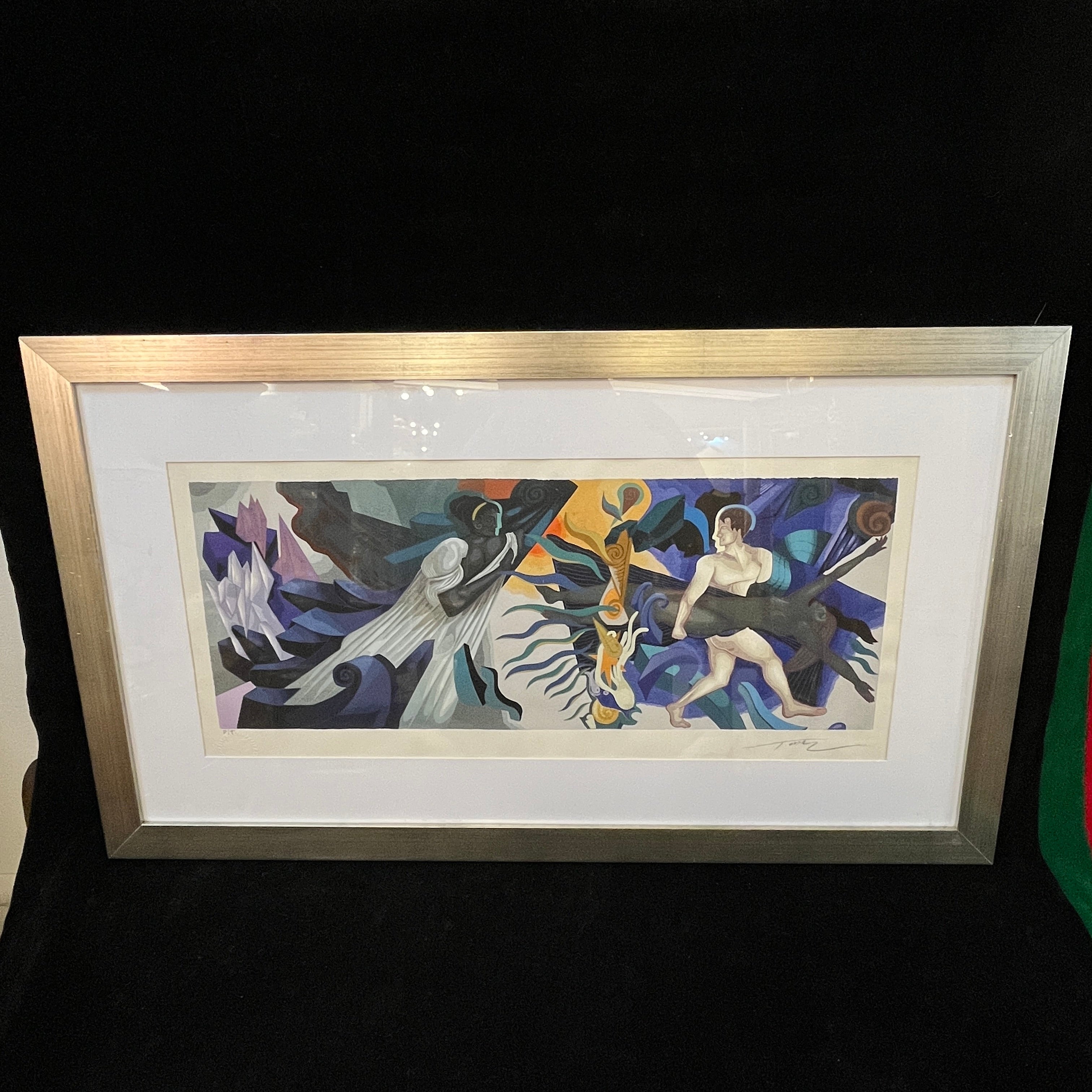 Serigrafía del reconocido artista chileno Mario Toral, firmado y marcado como prueba de artista, correspondiente a una pieza escala del mural hecho por el artista para la estación Universidad de Chile del metro de Santiago en 2013. La obra está enmarcada en madera, de diseño sobrio, y terminación en plateado.