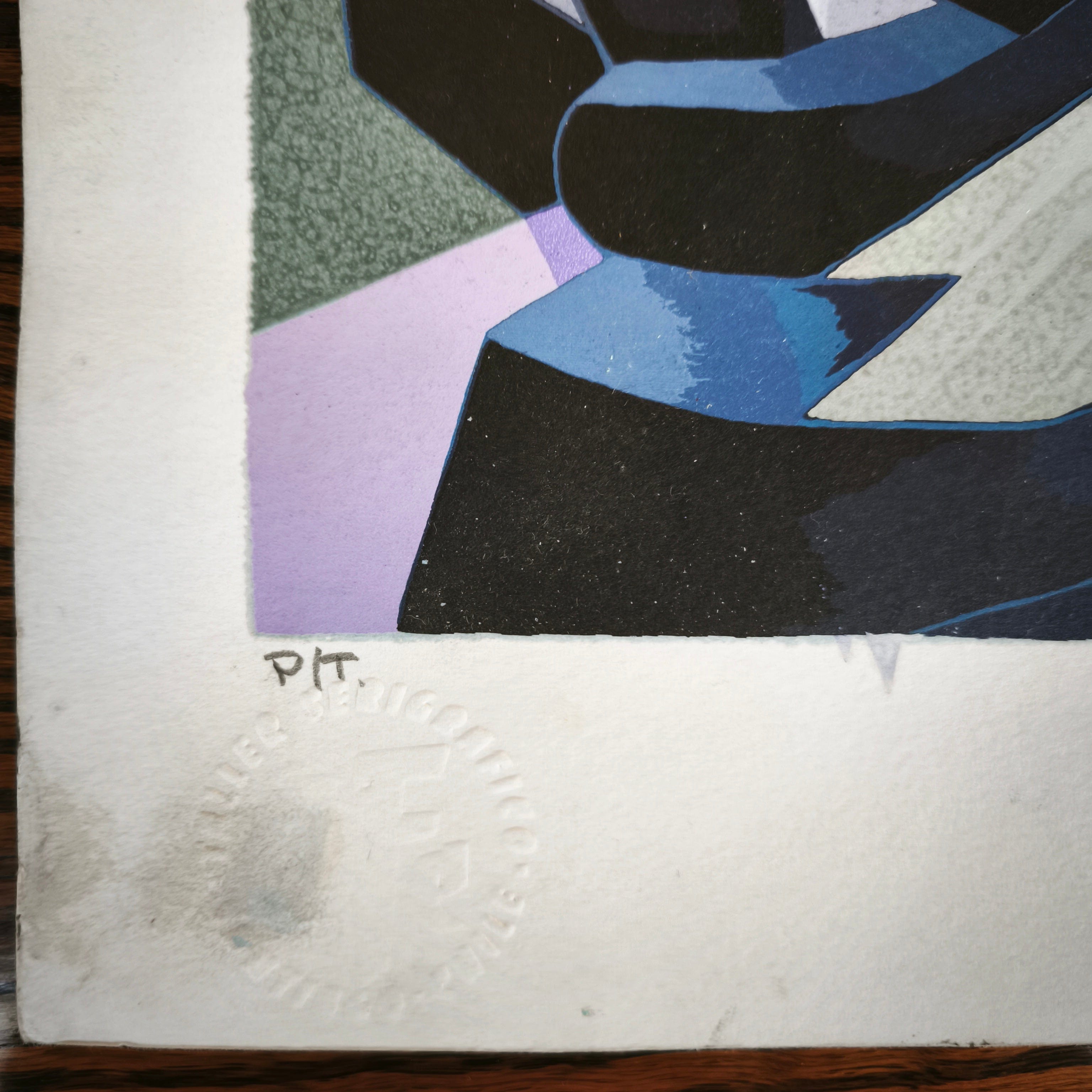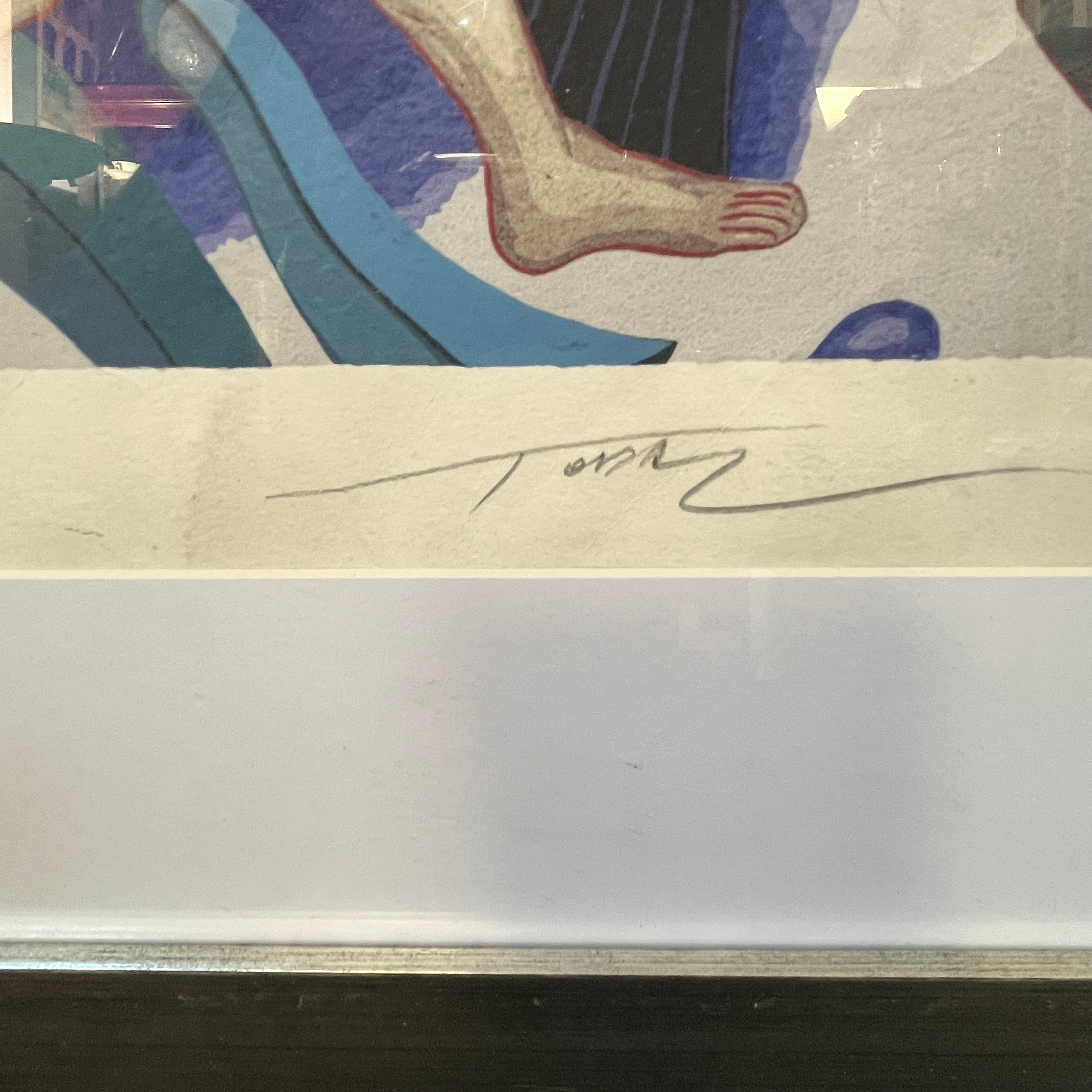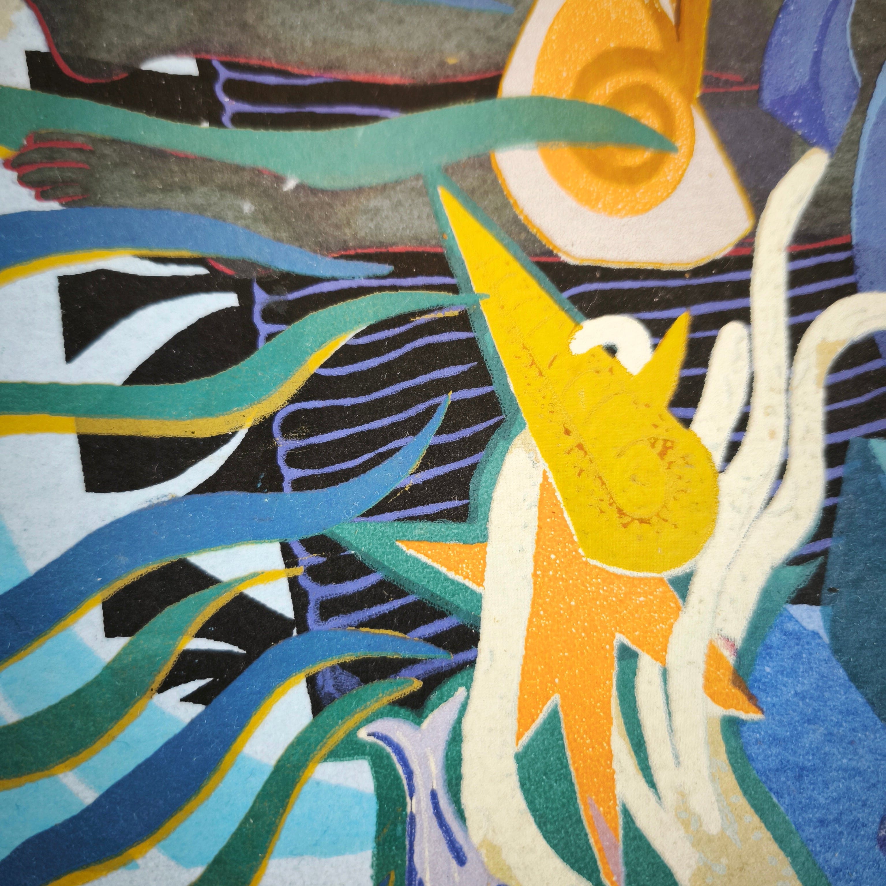 Serigrafía del reconocido artista chileno Mario Toral, firmado y marcado como prueba de artista, correspondiente a una pieza escala del mural hecho por el artista para la estación Universidad de Chile del metro de Santiago en 2013. La obra está enmarcada en madera, de diseño sobrio, y terminación en plateado.