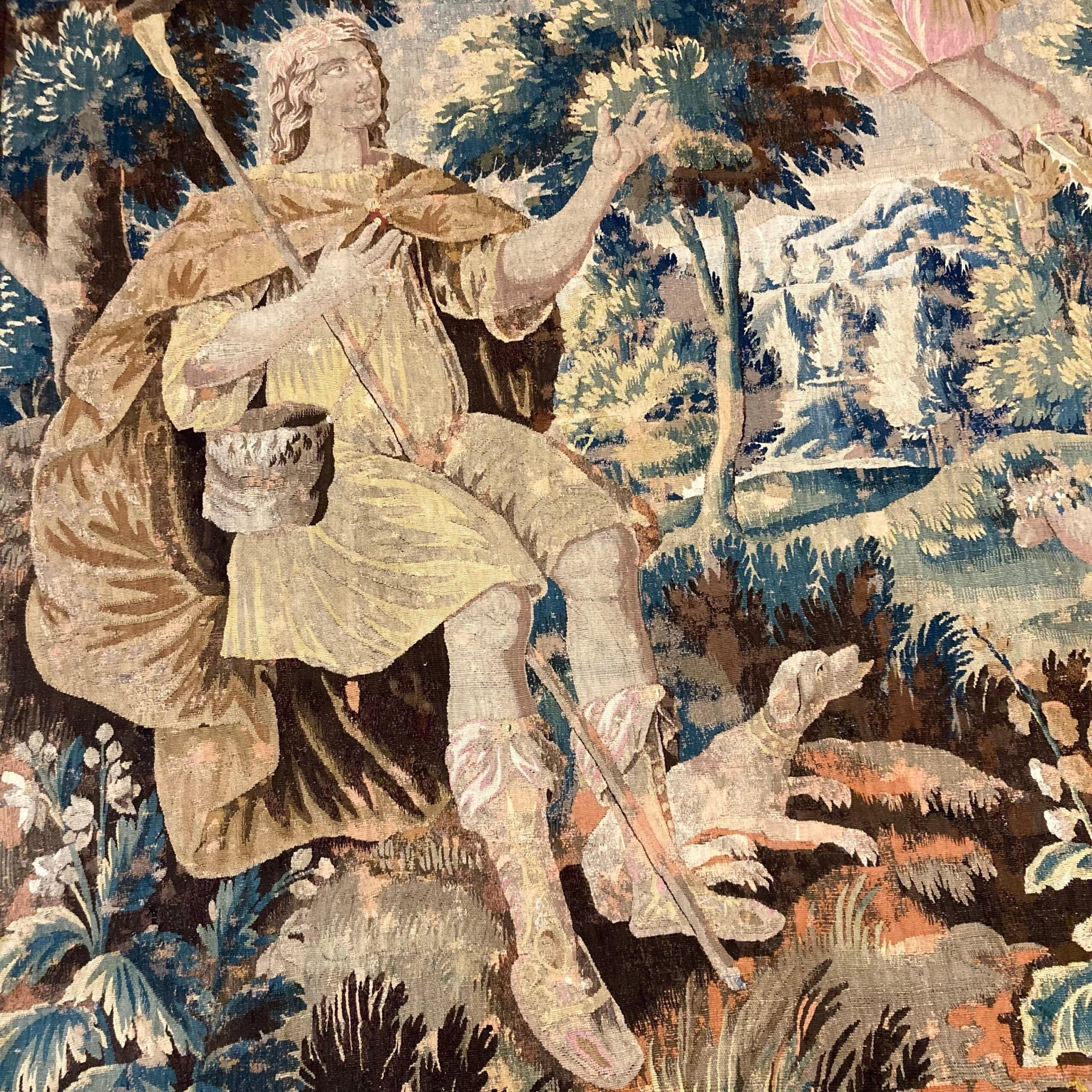 Tapicería francesa del s. XVIII, que representa "La visita de arcángel Rafael a San Roque ". Rafael significa: "Divino curador", "Dios cura" o "Dios ha Llegado".