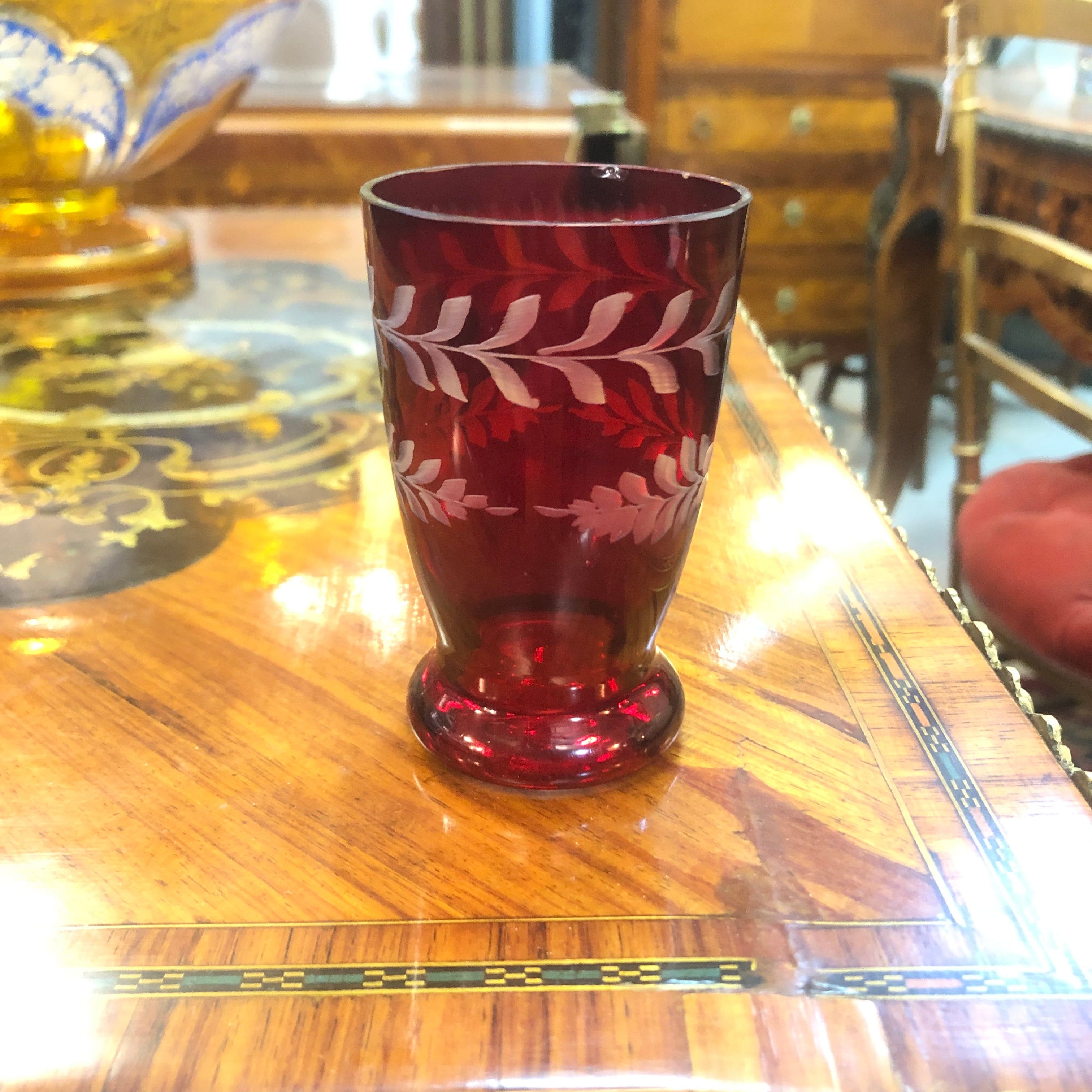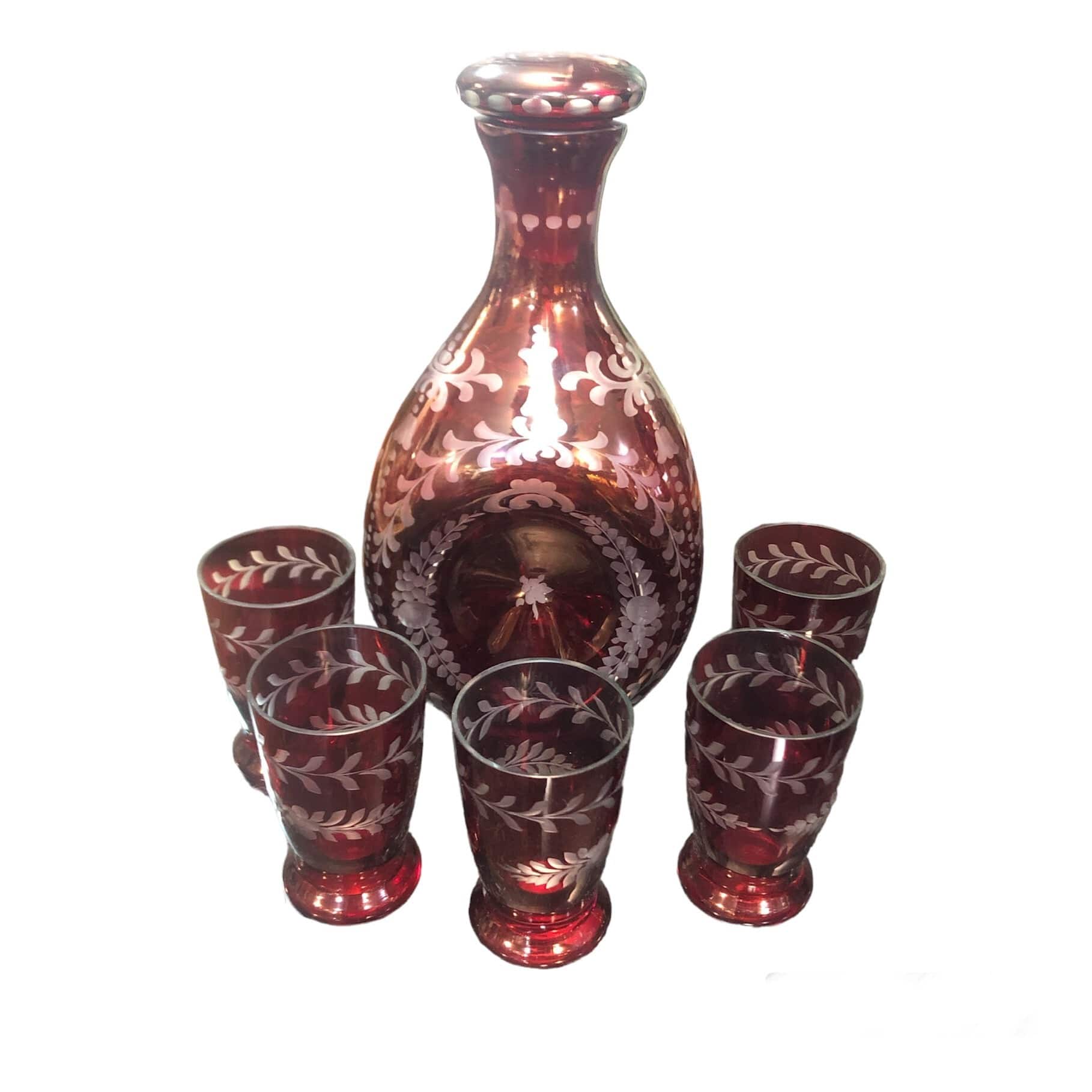 Bello conjunto de copas y botella de vidrio tallado en un precioso rojo, para cuatro personas.