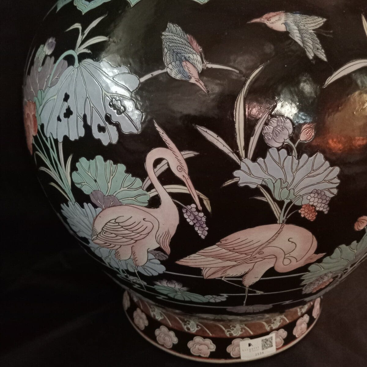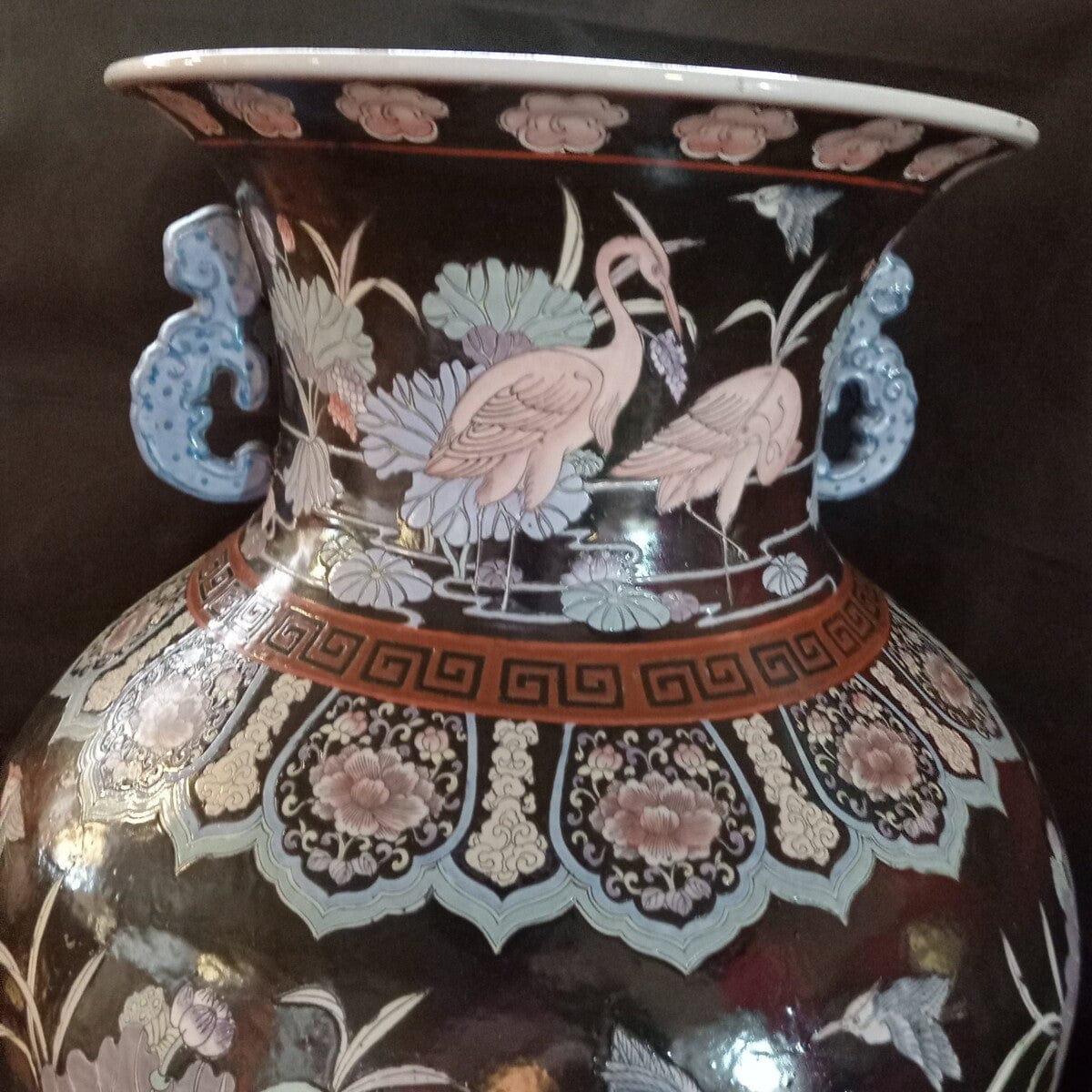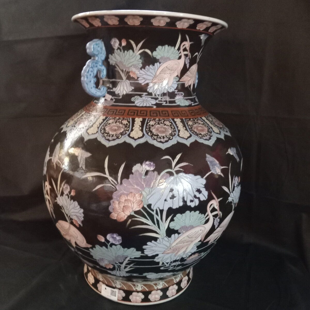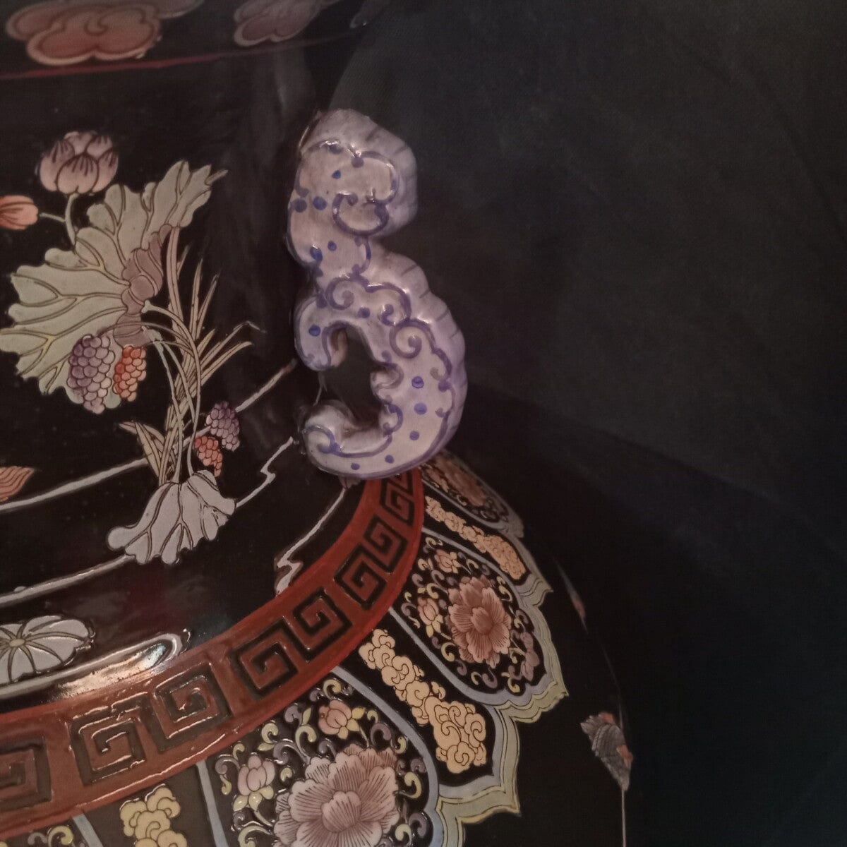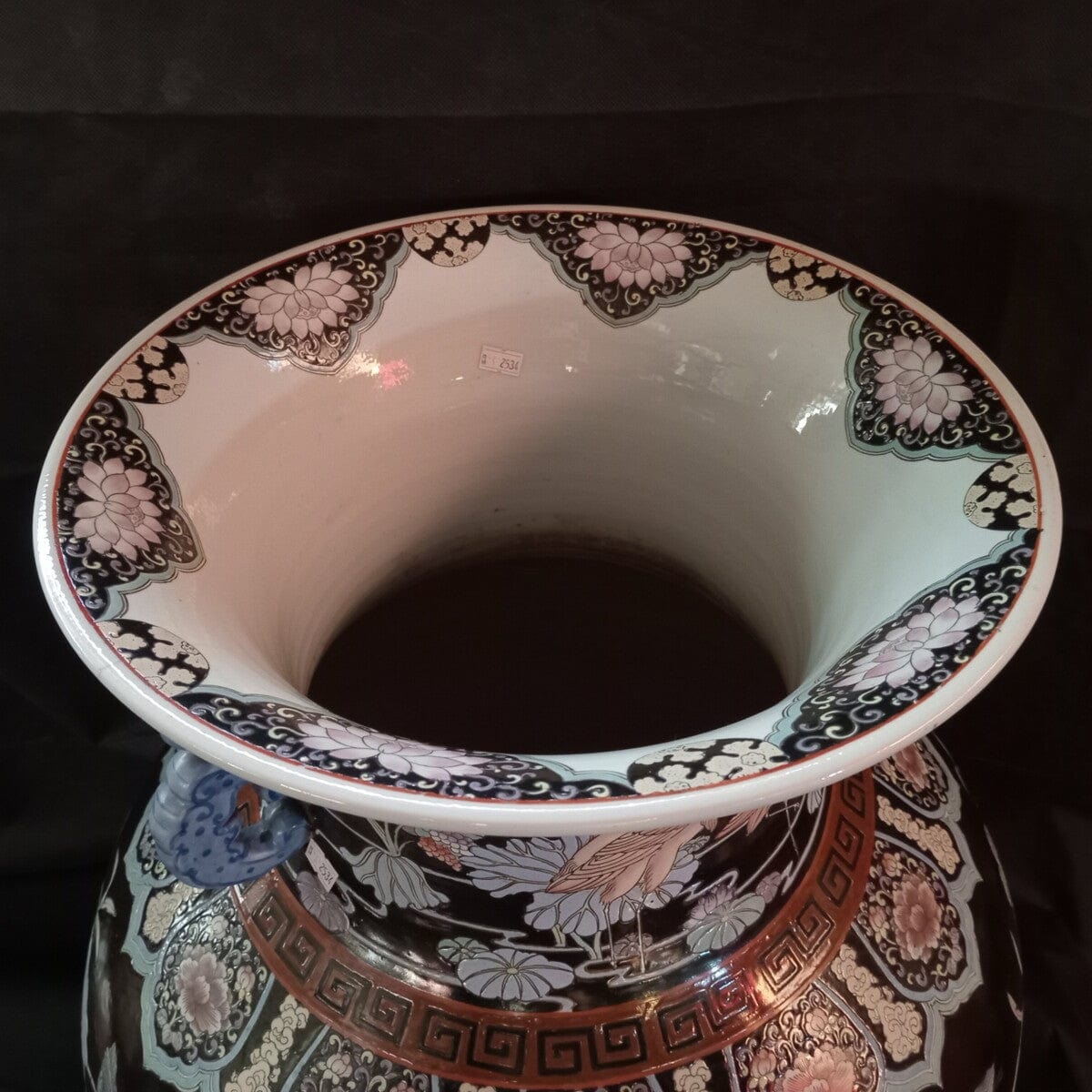 Elegante jarrón de porcelana china de diseño panzu, bellos colores esmaltados en negrro y azul. Sus asas son un de un llamativo color azul.