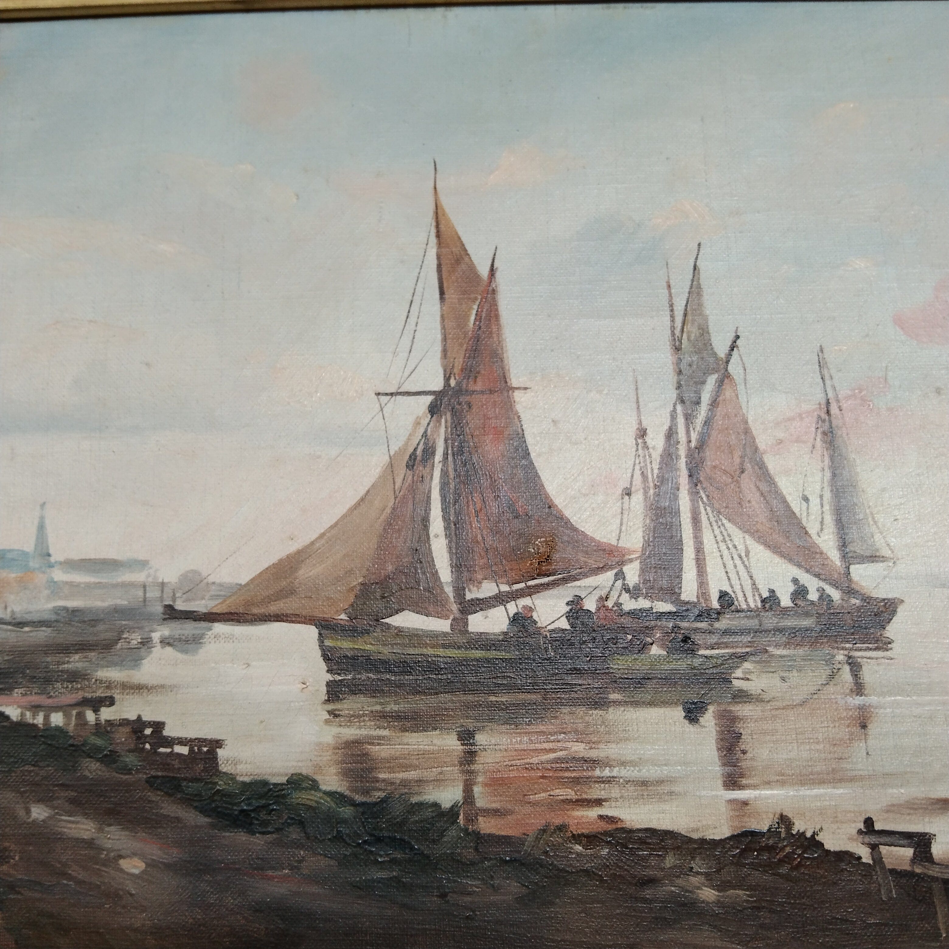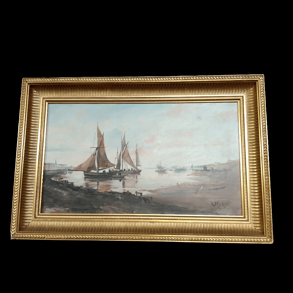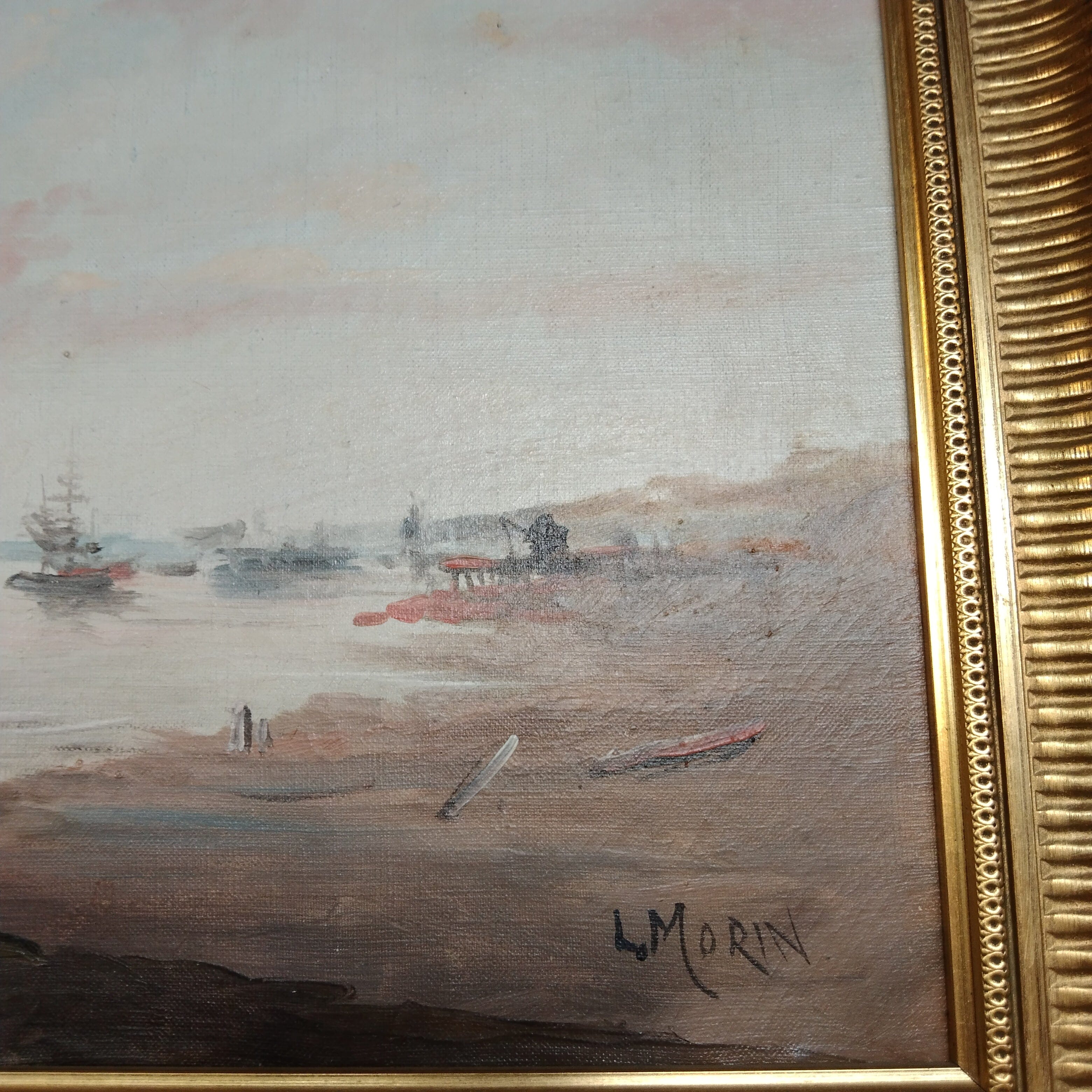 Óleo sobre tela de L. Morin, representando una escena costera, con veleros cerca de una playa y algunos pescadores sobre ellos. La obra está enmarcada en madera tallada y pintada en dorado.