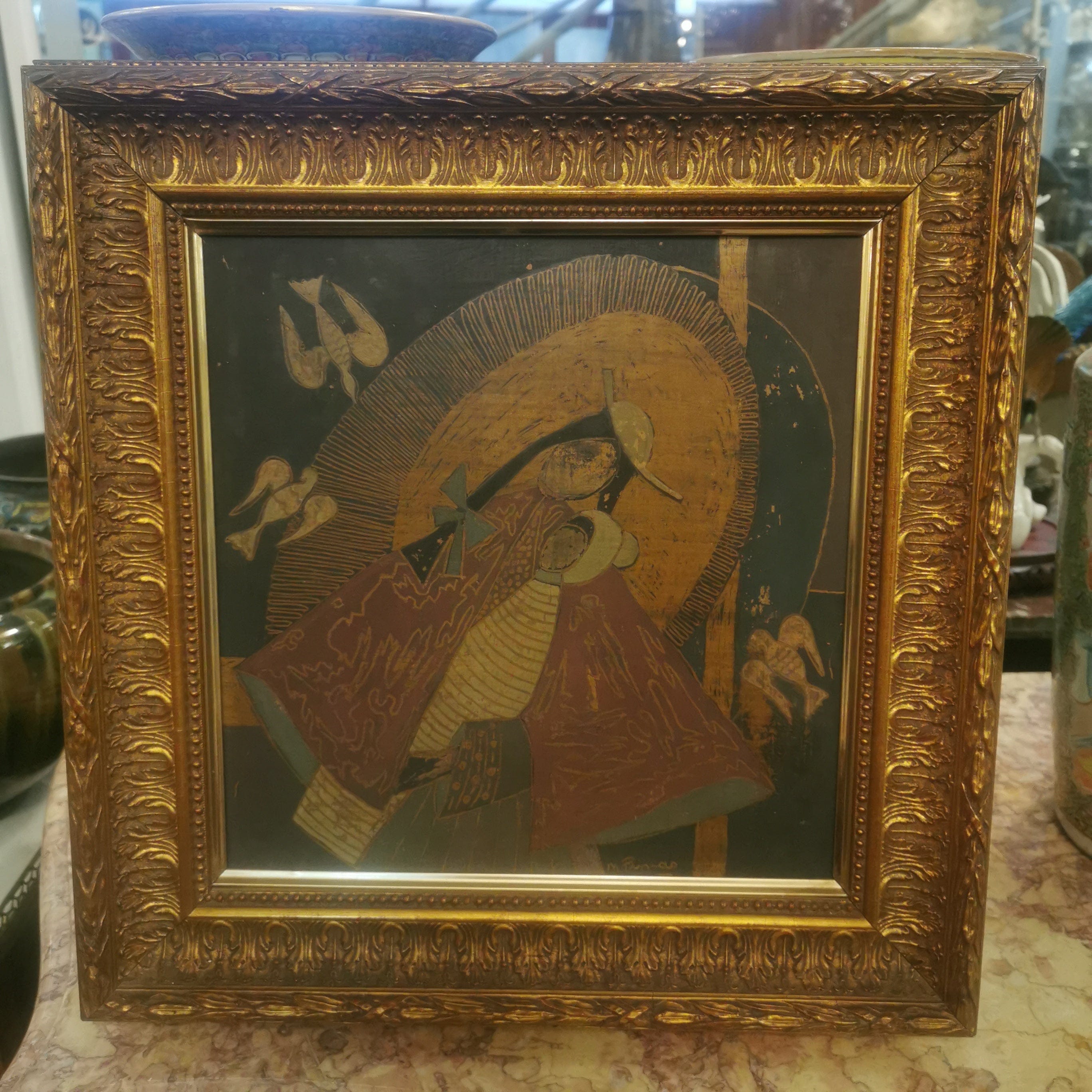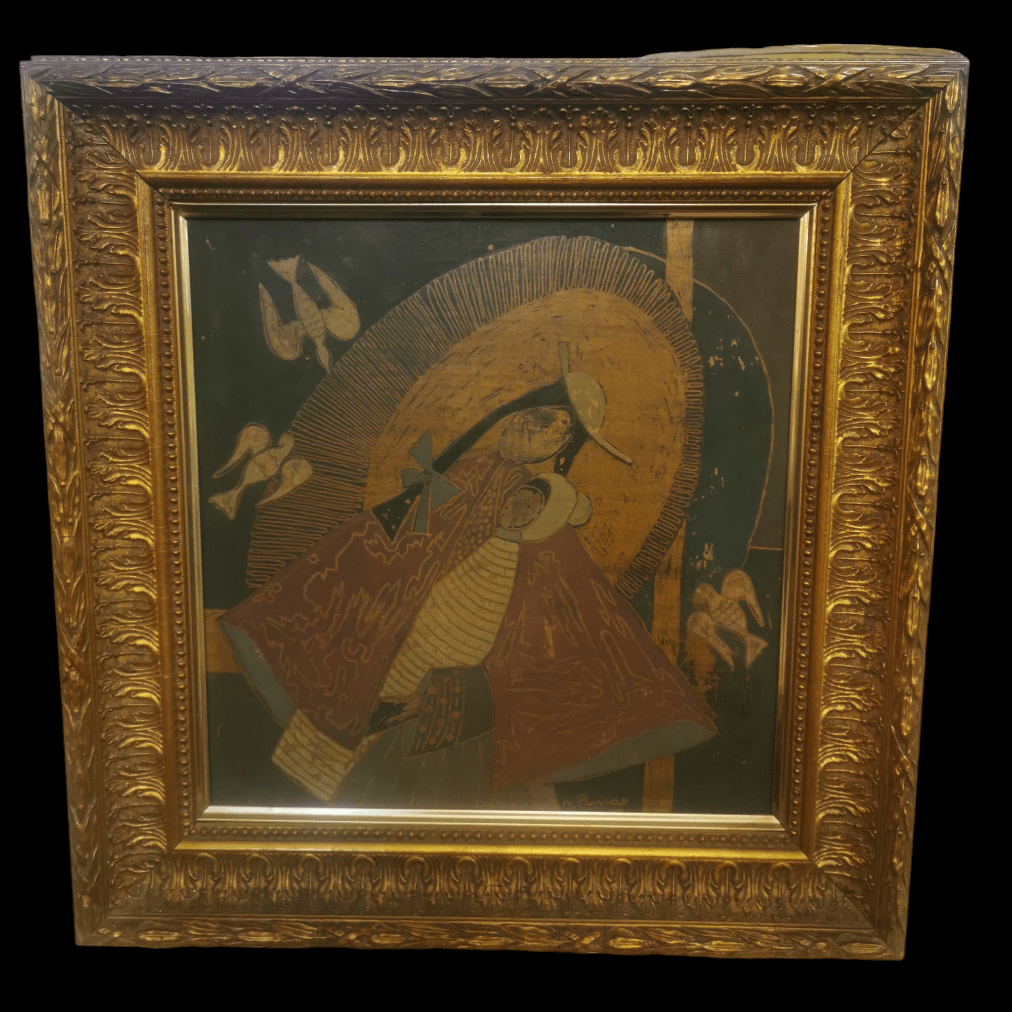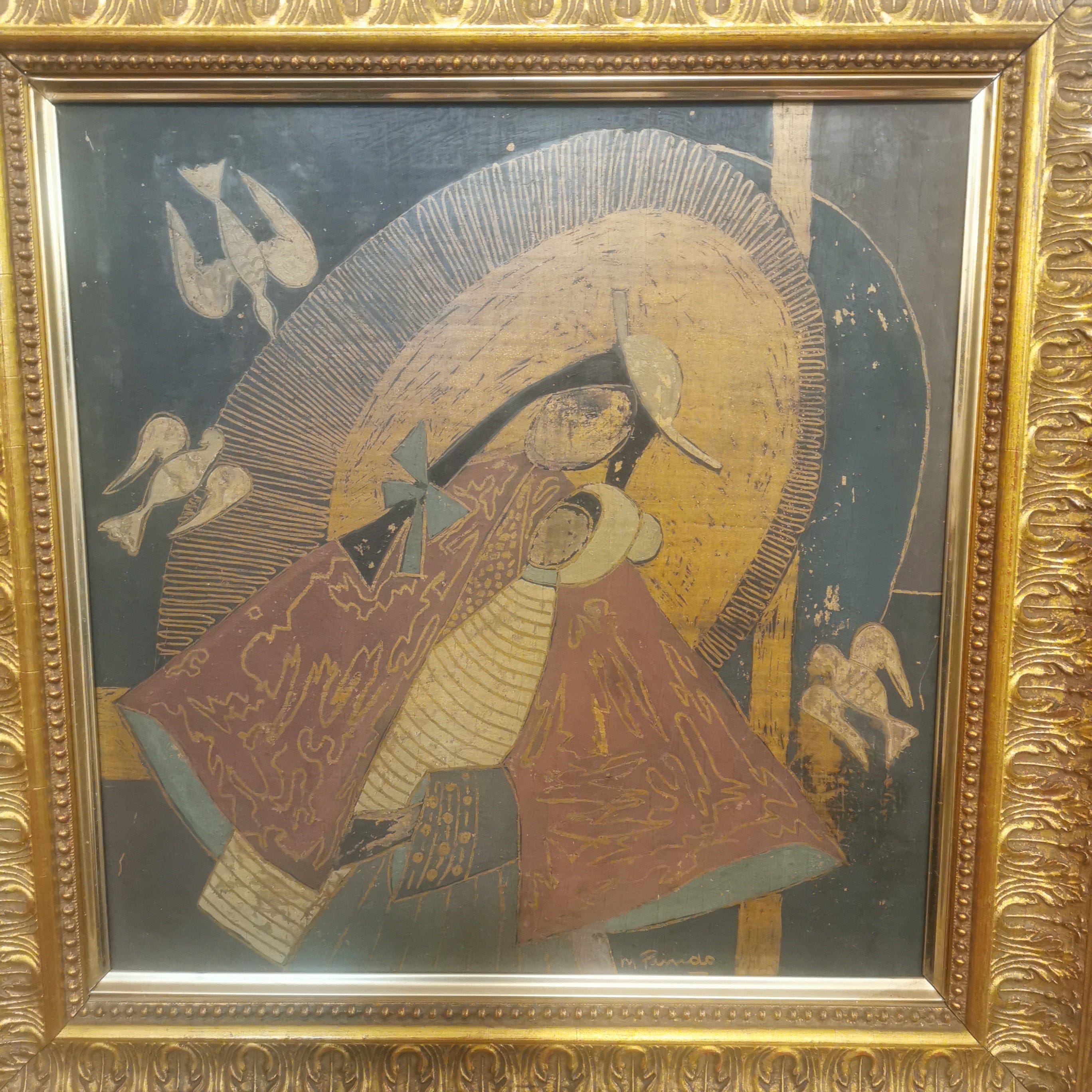 Óleo sobre madera de la artista chilena Maruja Pinedo. En esta obra, podemos contemplar a la madre sosteniendo a su hijo. Tiene un bello marco de madera pintado dorado con diseño y relieve.