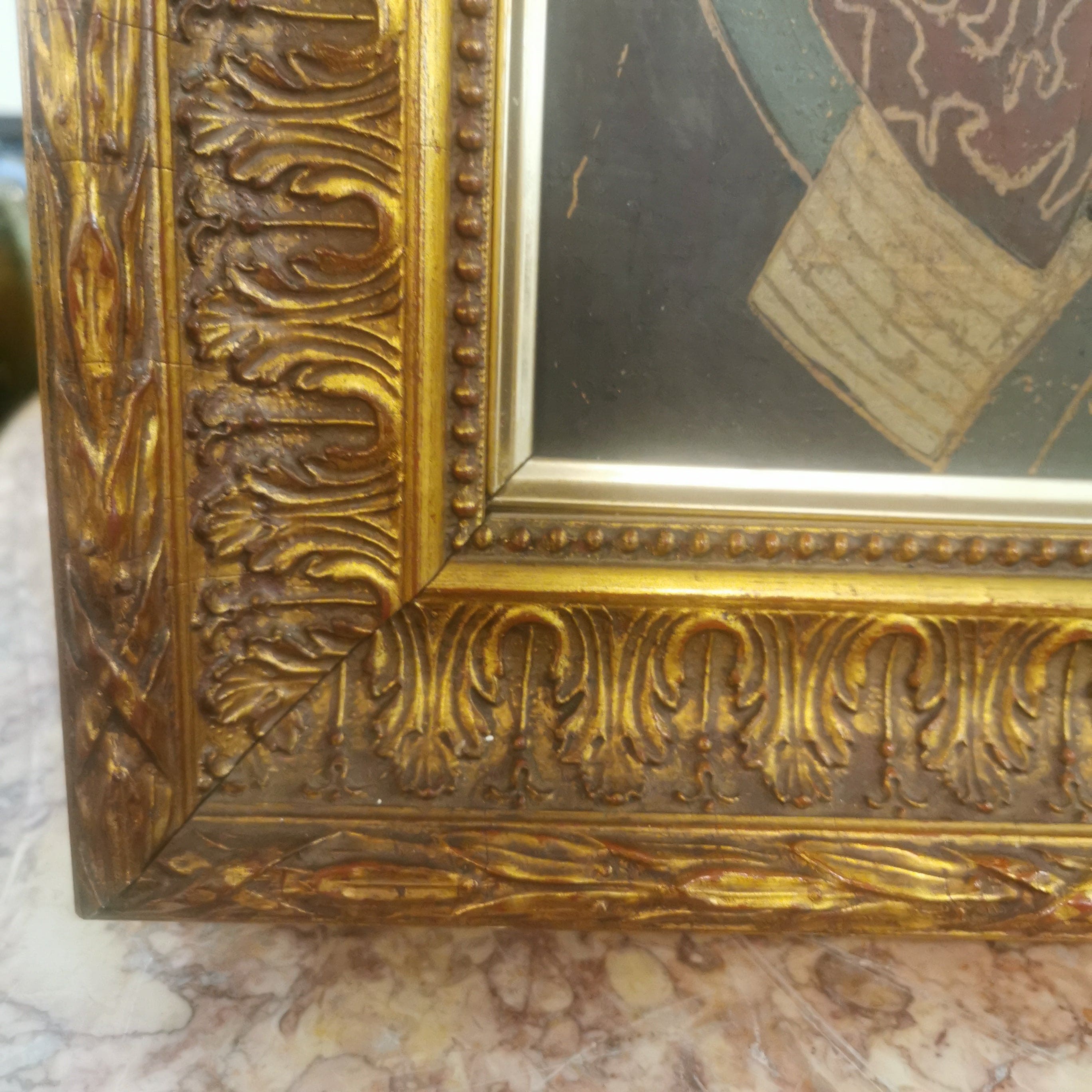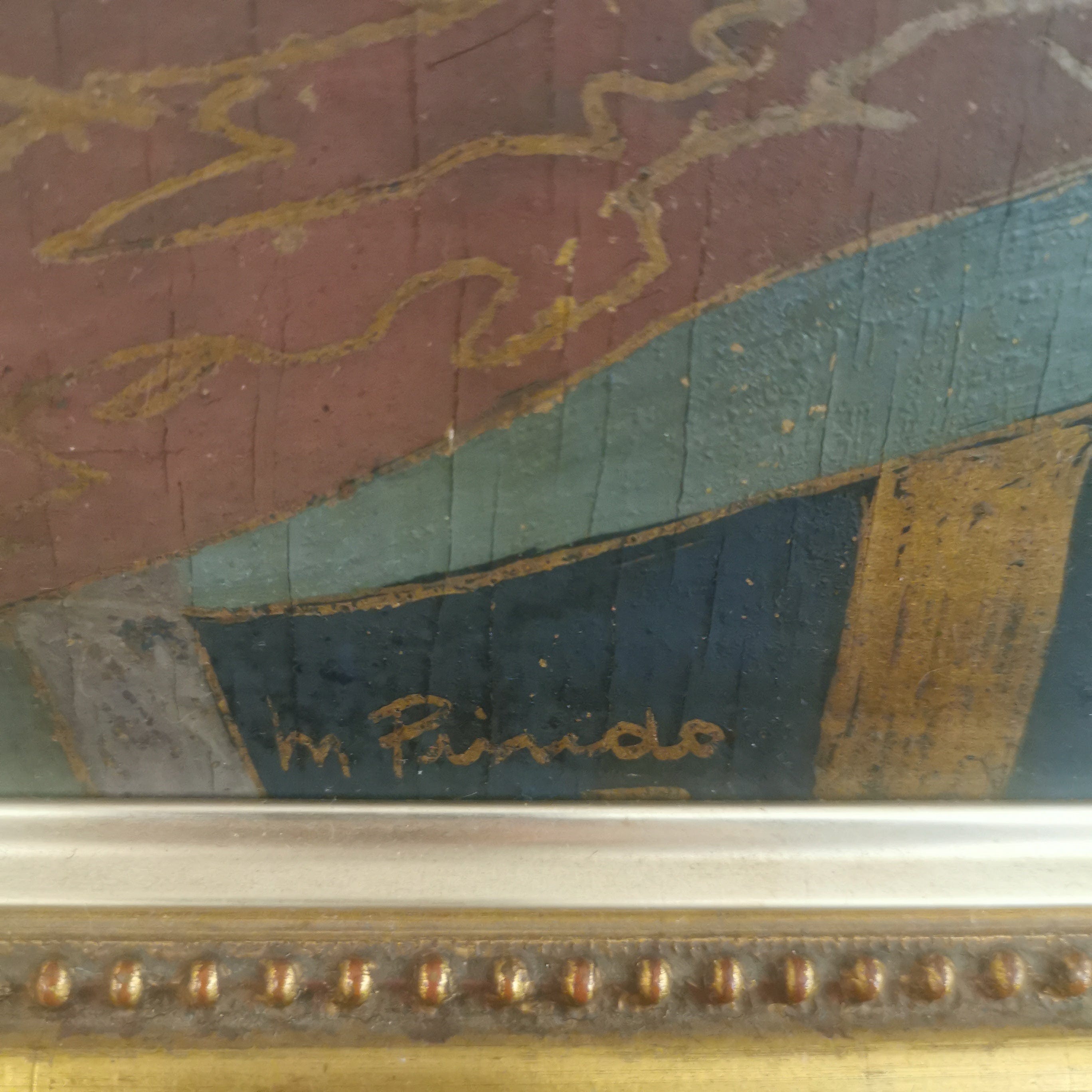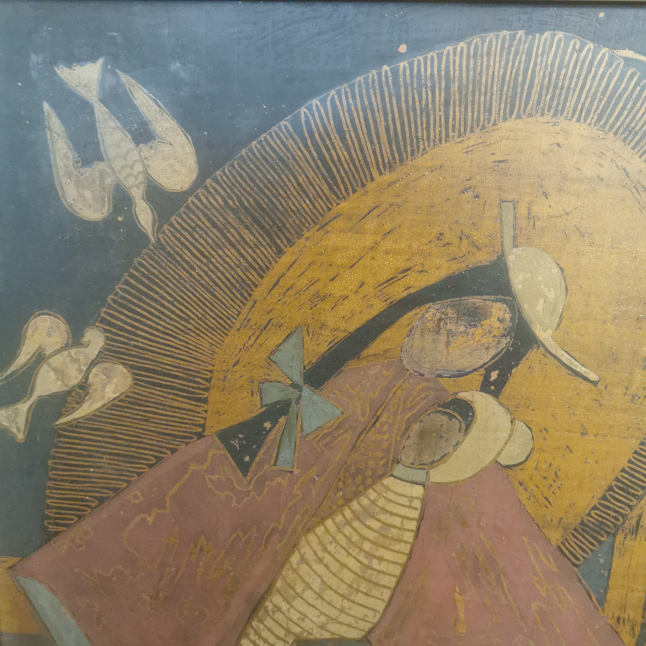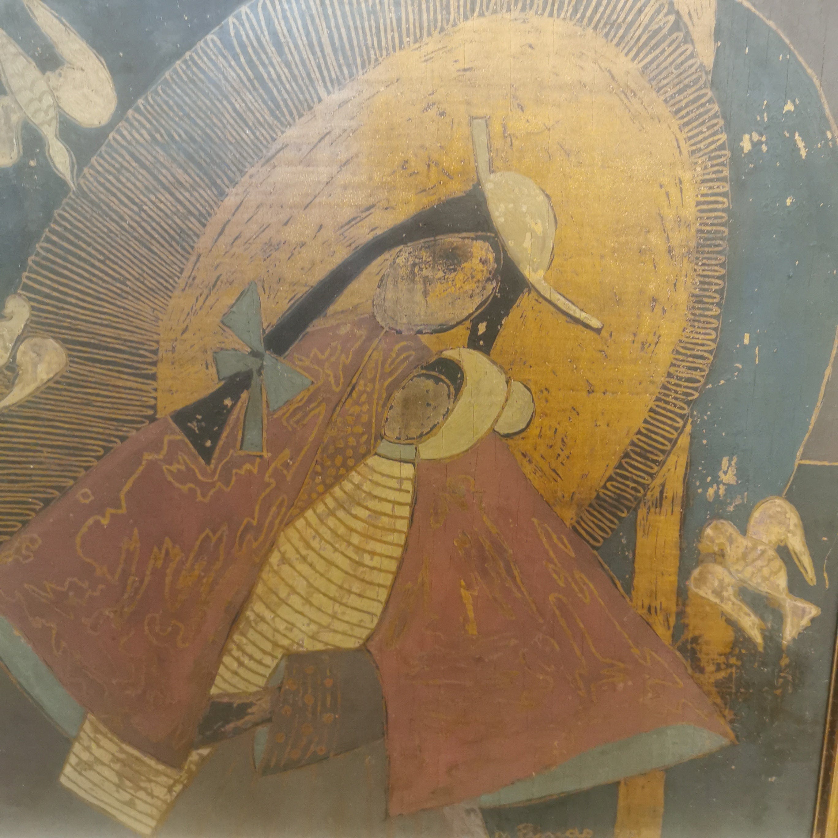 Óleo sobre madera de la artista chilena Maruja Pinedo. En esta obra, podemos contemplar a la madre sosteniendo a su hijo. Tiene un bello marco de madera pintado dorado con diseño y relieve.