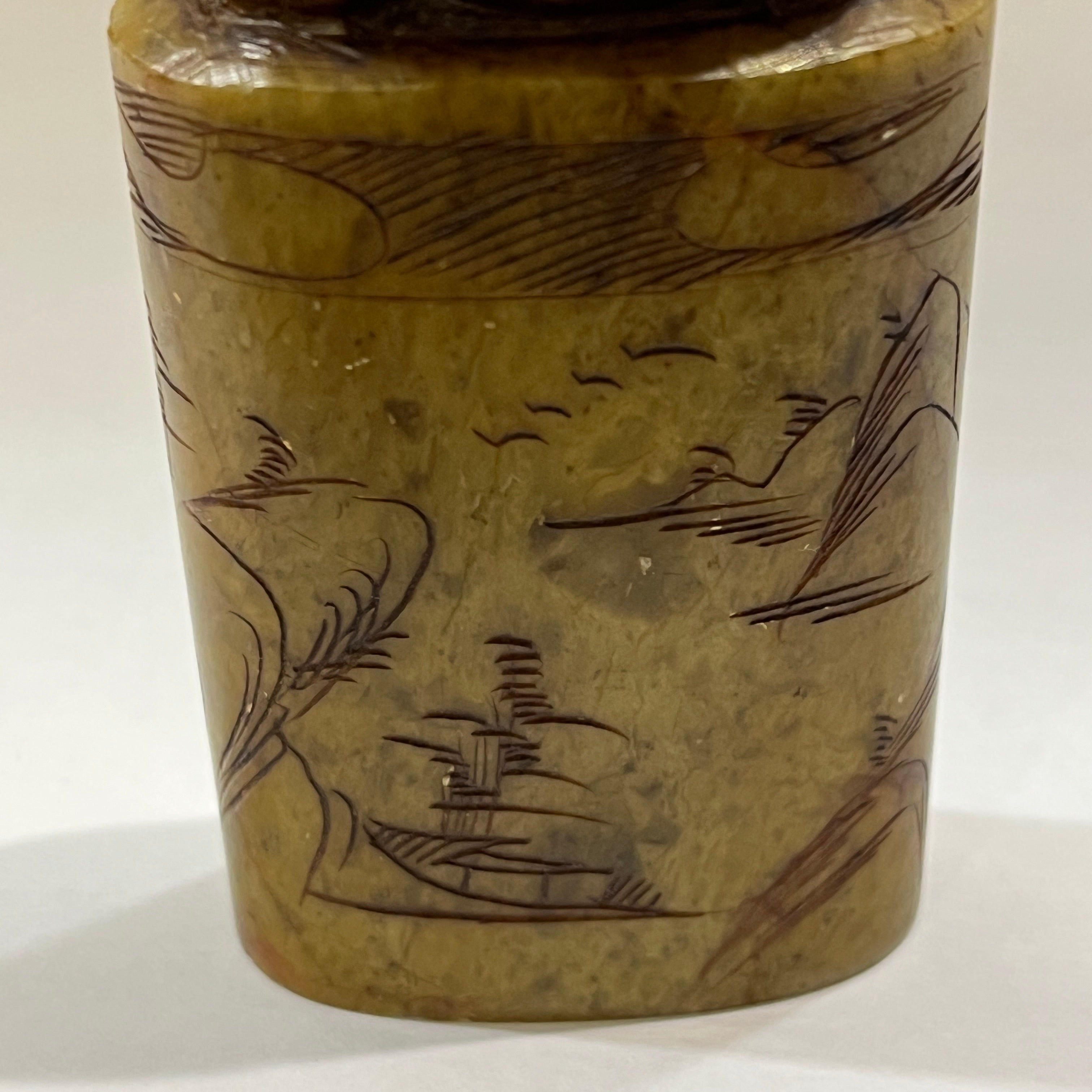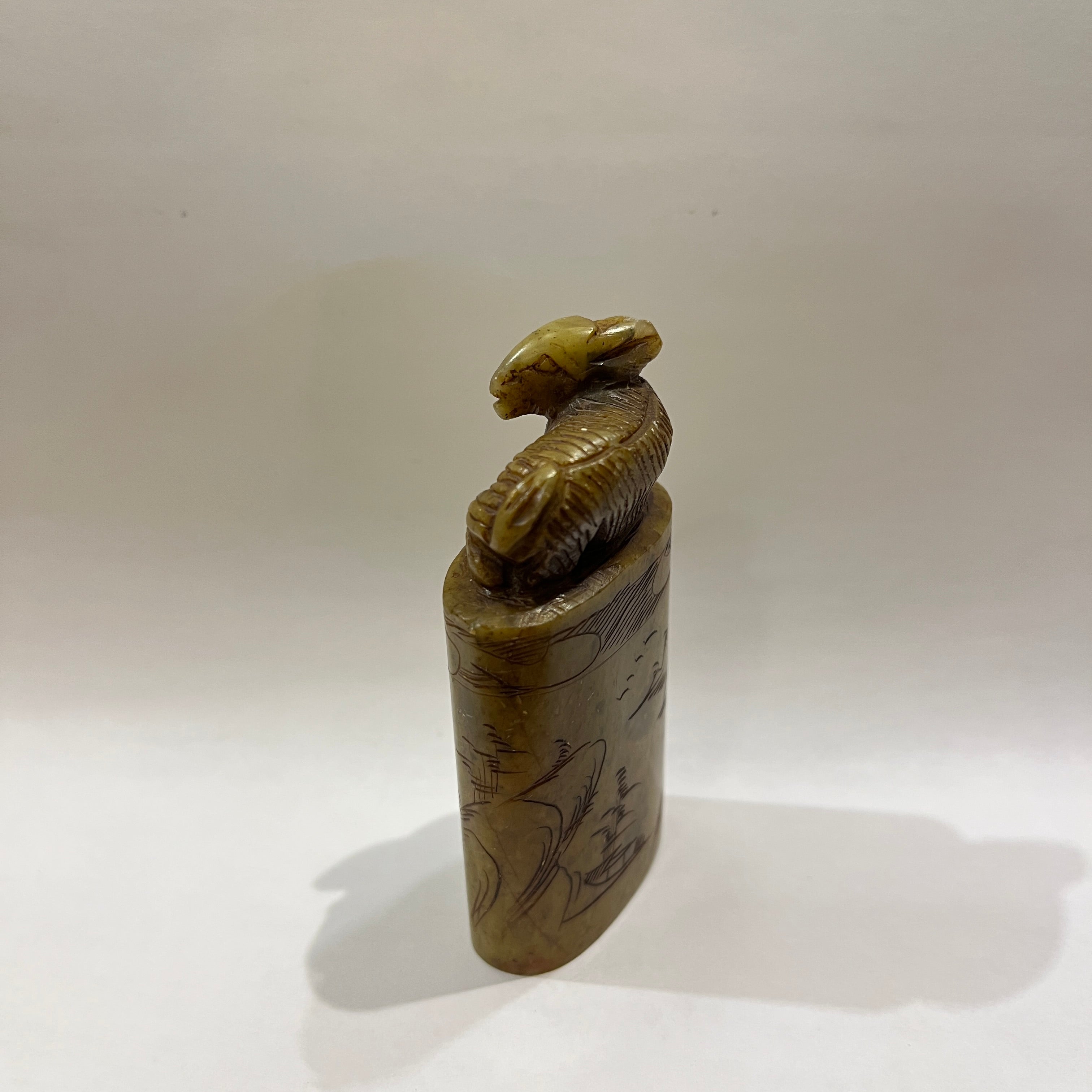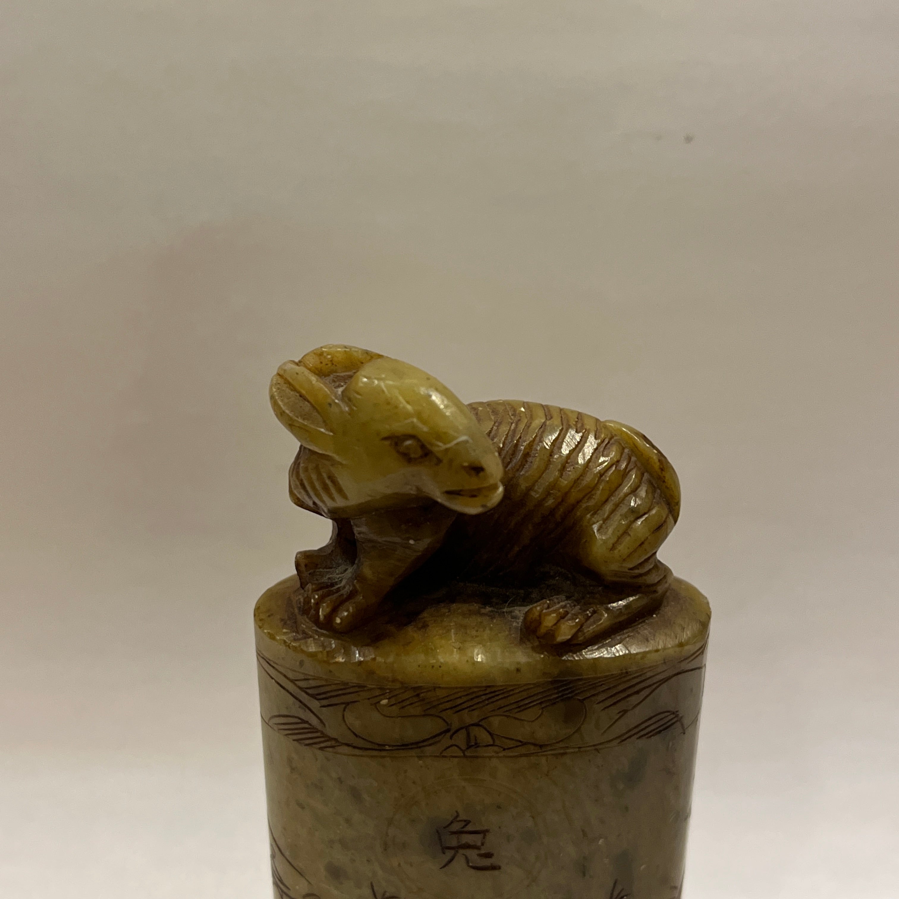 Precioso sello de origen chino, hecho en piedra dura tallada a mano, representando una figura de un conejo con un gesto de alerta, con tallados y relieves decorativos en su superficie.