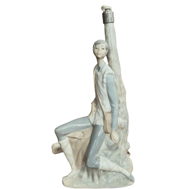 Bella figura de porcelana de la marca española Lladró, que retrata a una niño sentado contra el tronco de un árbol, descansando.