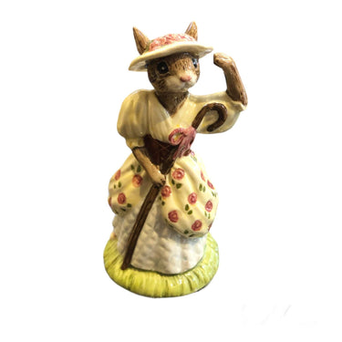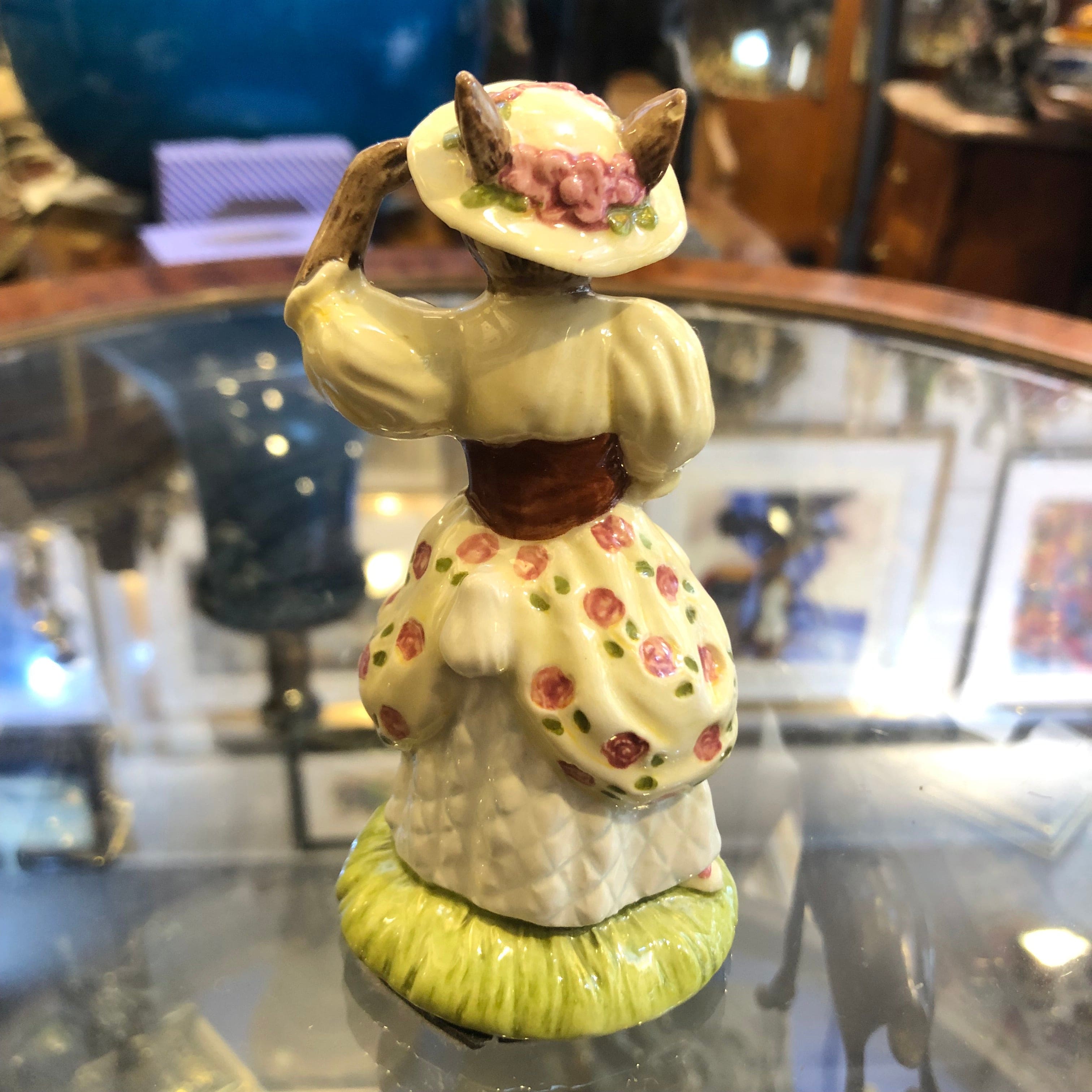Hermosa figura de porcelana De la marca Royal Doulton, con forma de conejo, vestida de dama con vestido floreado, bastón y sombrero.