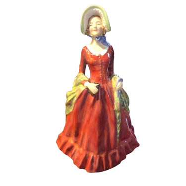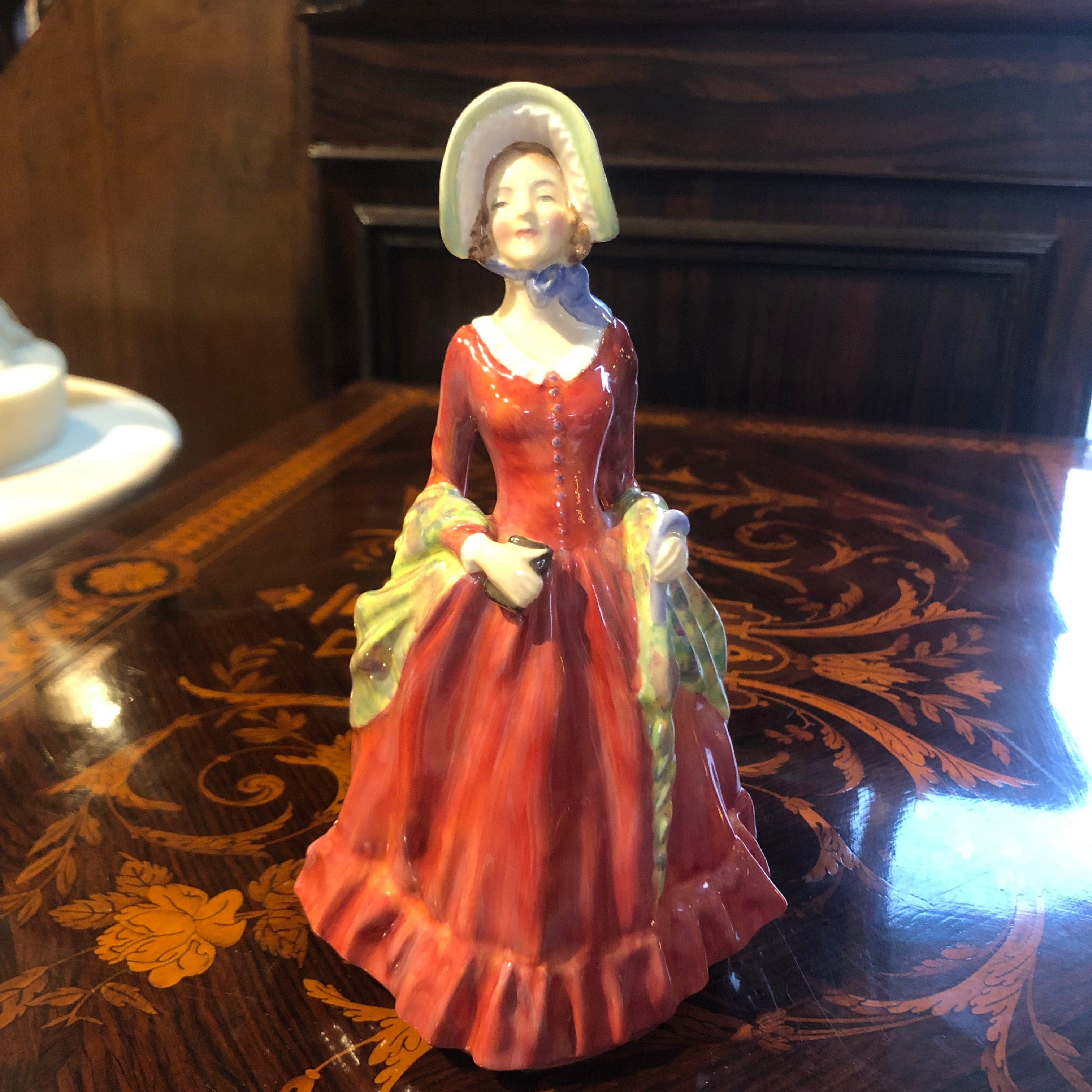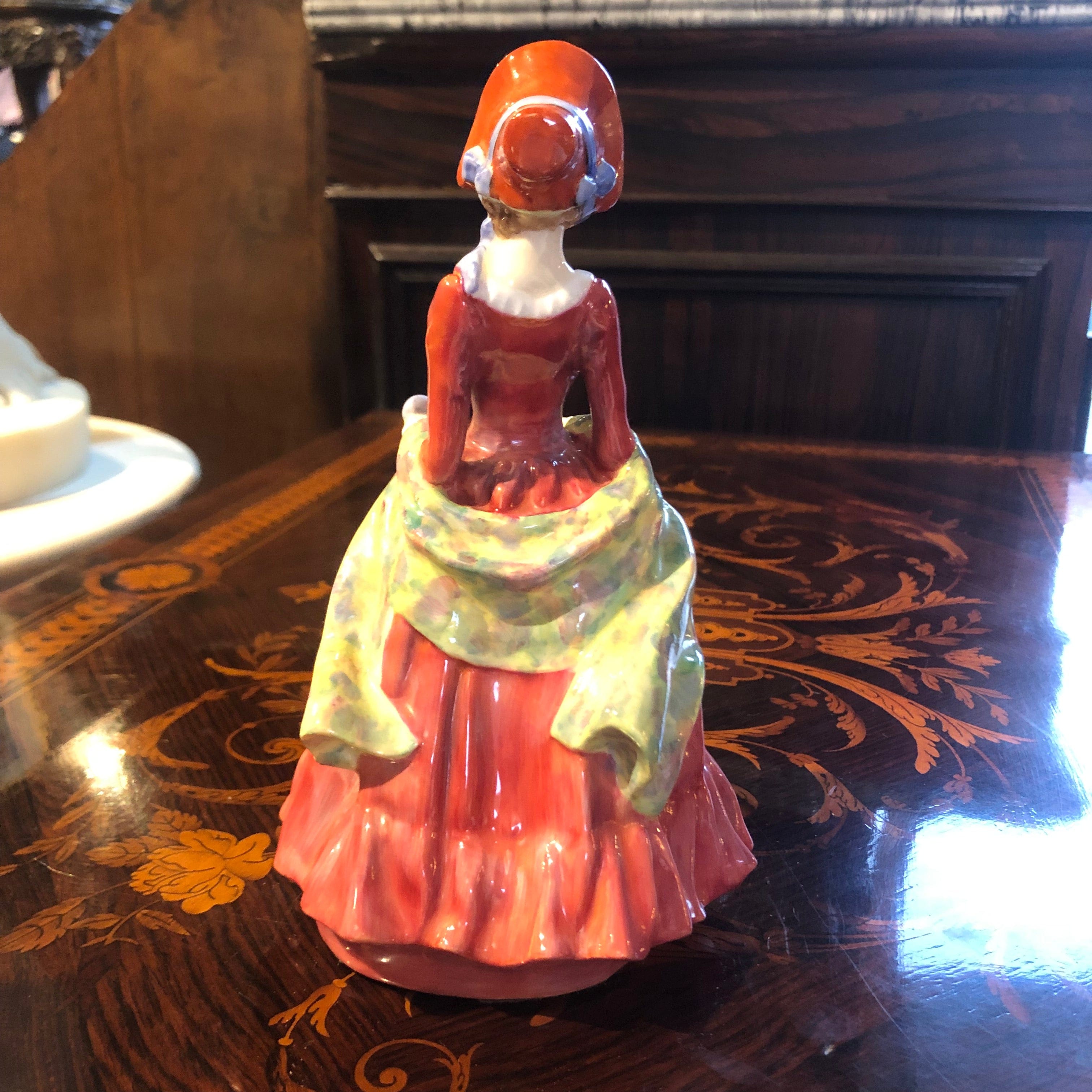 Figura de porcelana de la marca Royal Doulton, seriada y pintada a mano, representando una mujer con bello vestido rojo, sombrero y echarpe floreado con tonos amarillos entre sus brazo.