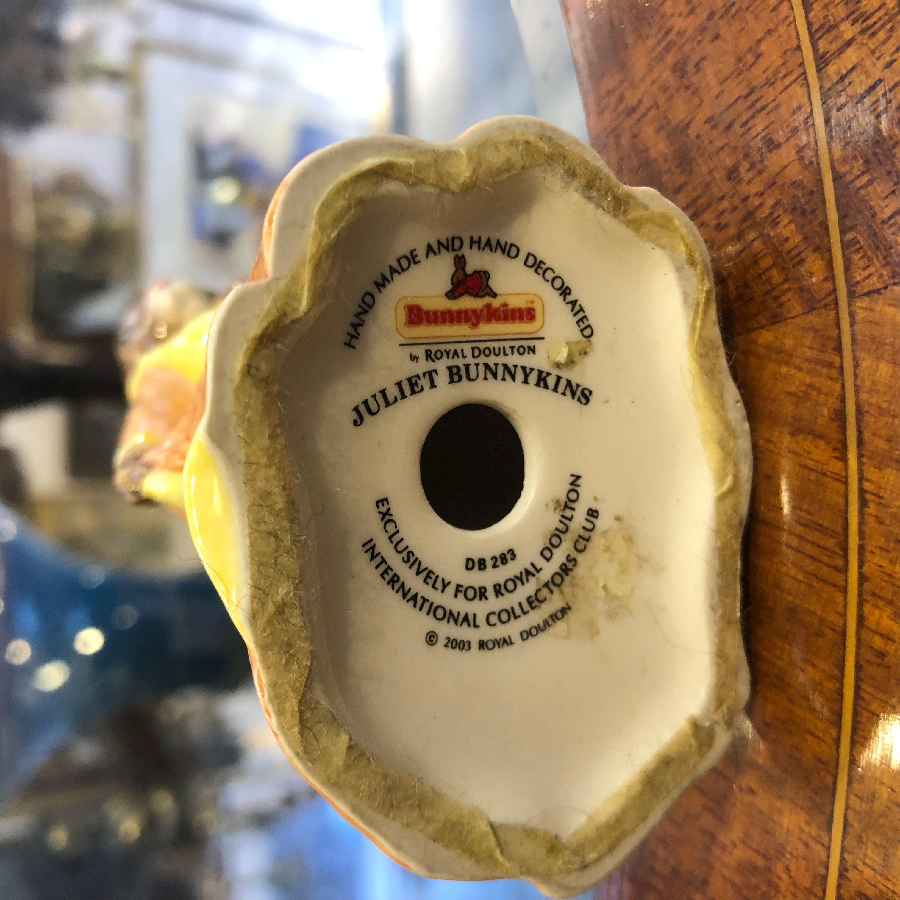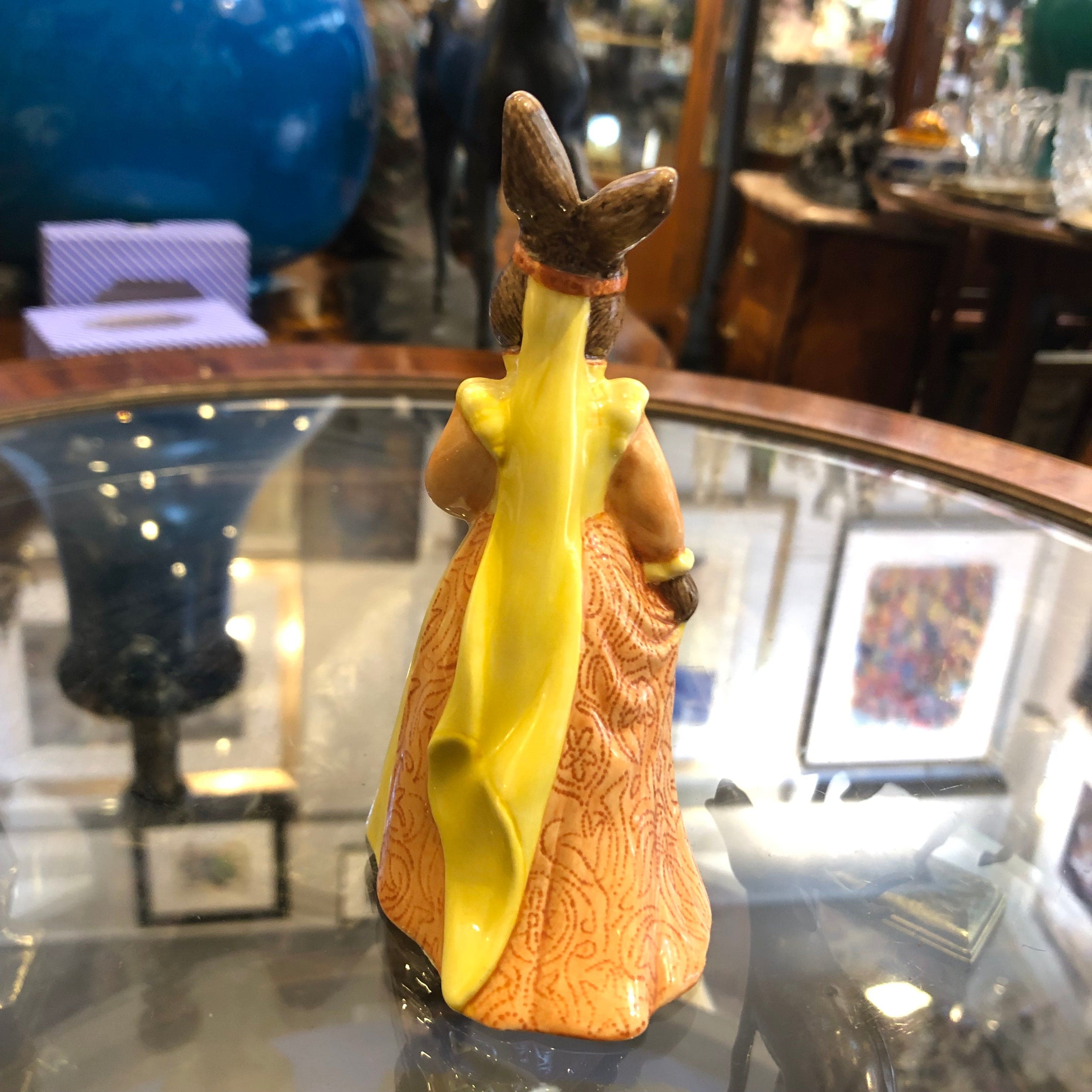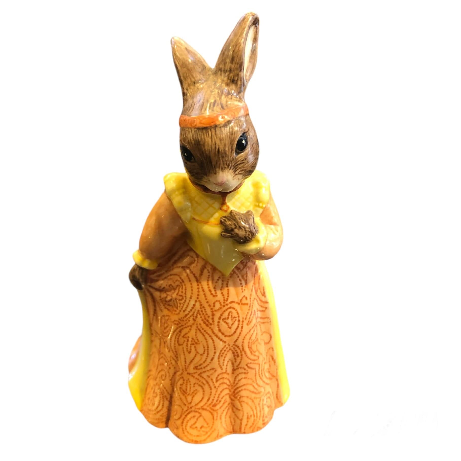 Hermosa figura de porcelana De la marca Royal Doulton, con forma de conejo, vestida de dama con vestido largo y velo sobre la cabeza.
