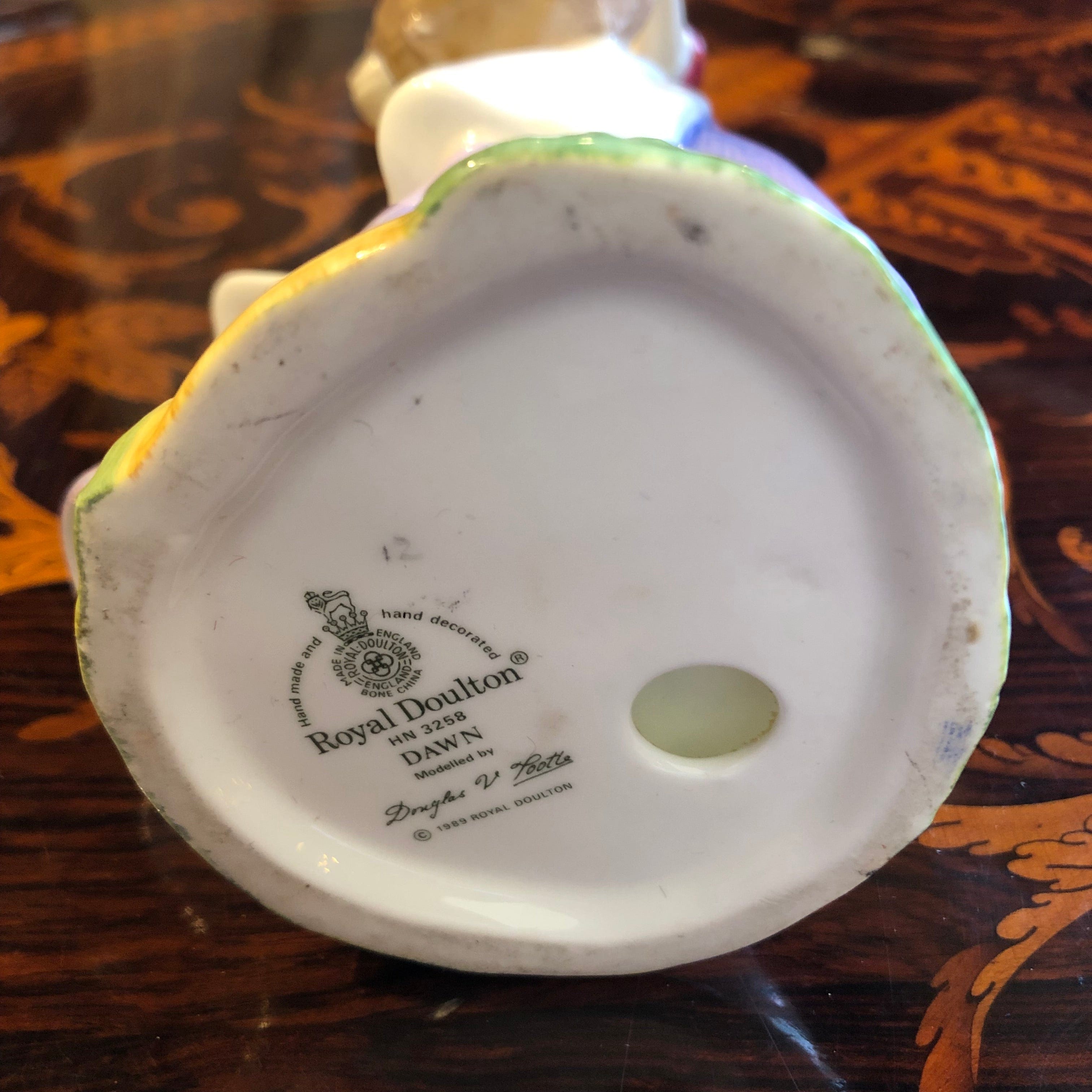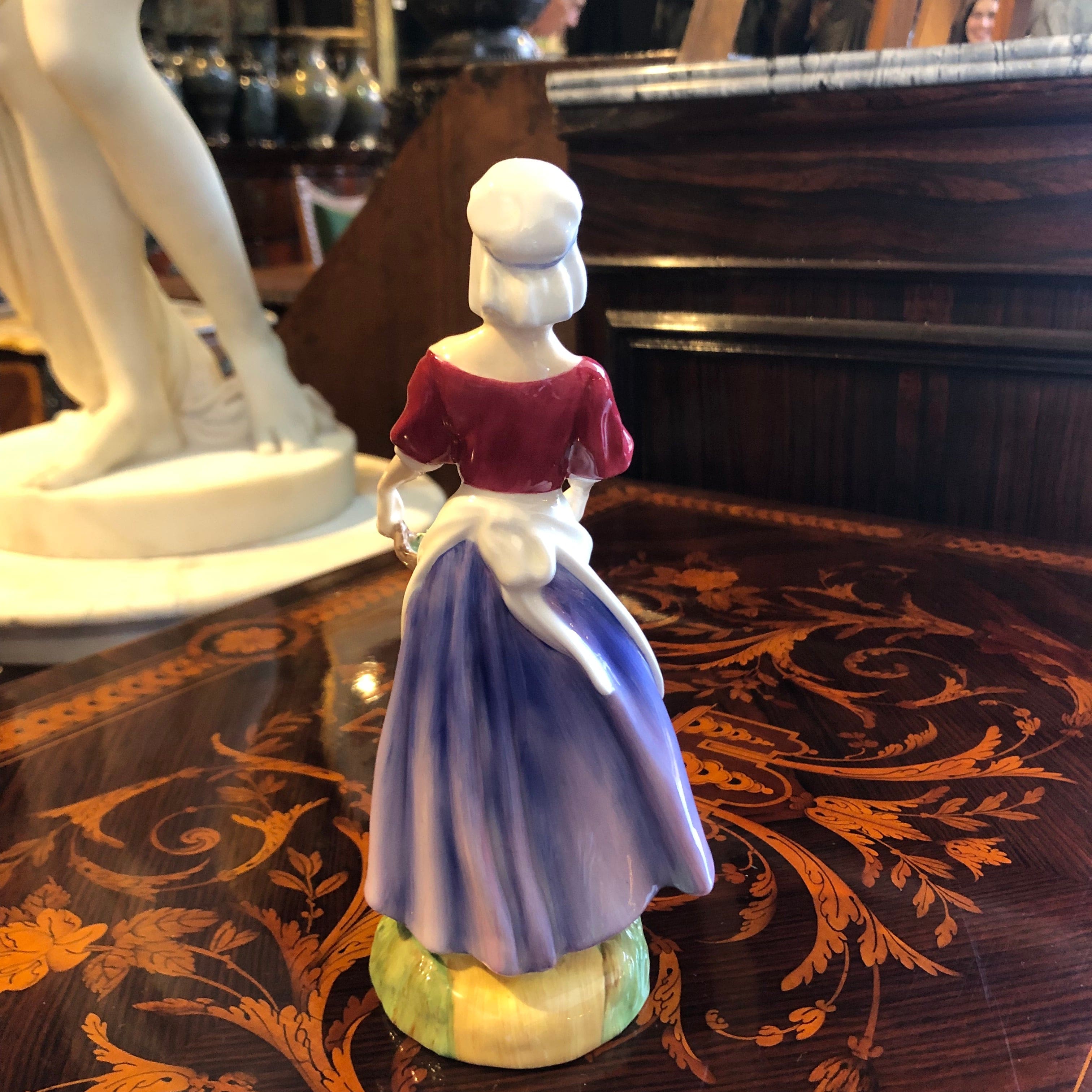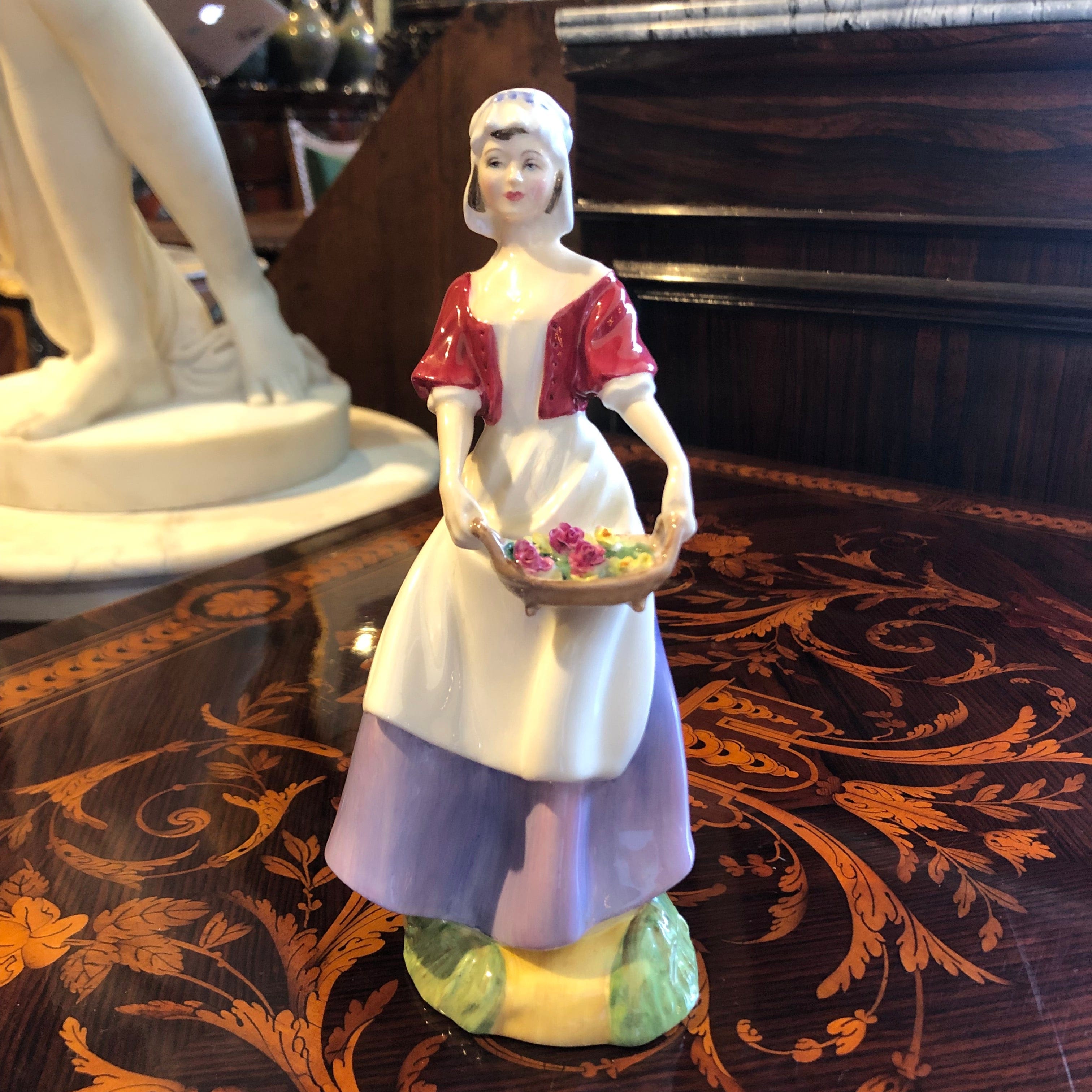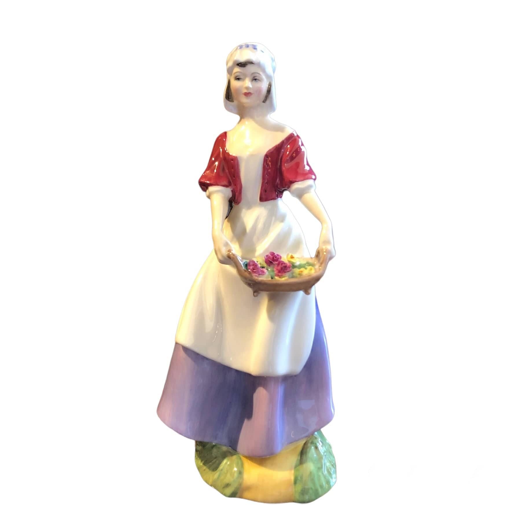 Figura de porcelana de la marca Royal Doulton, seriada y pintada a mano, representando una mujer llevando un plato de flores en sus manos.
