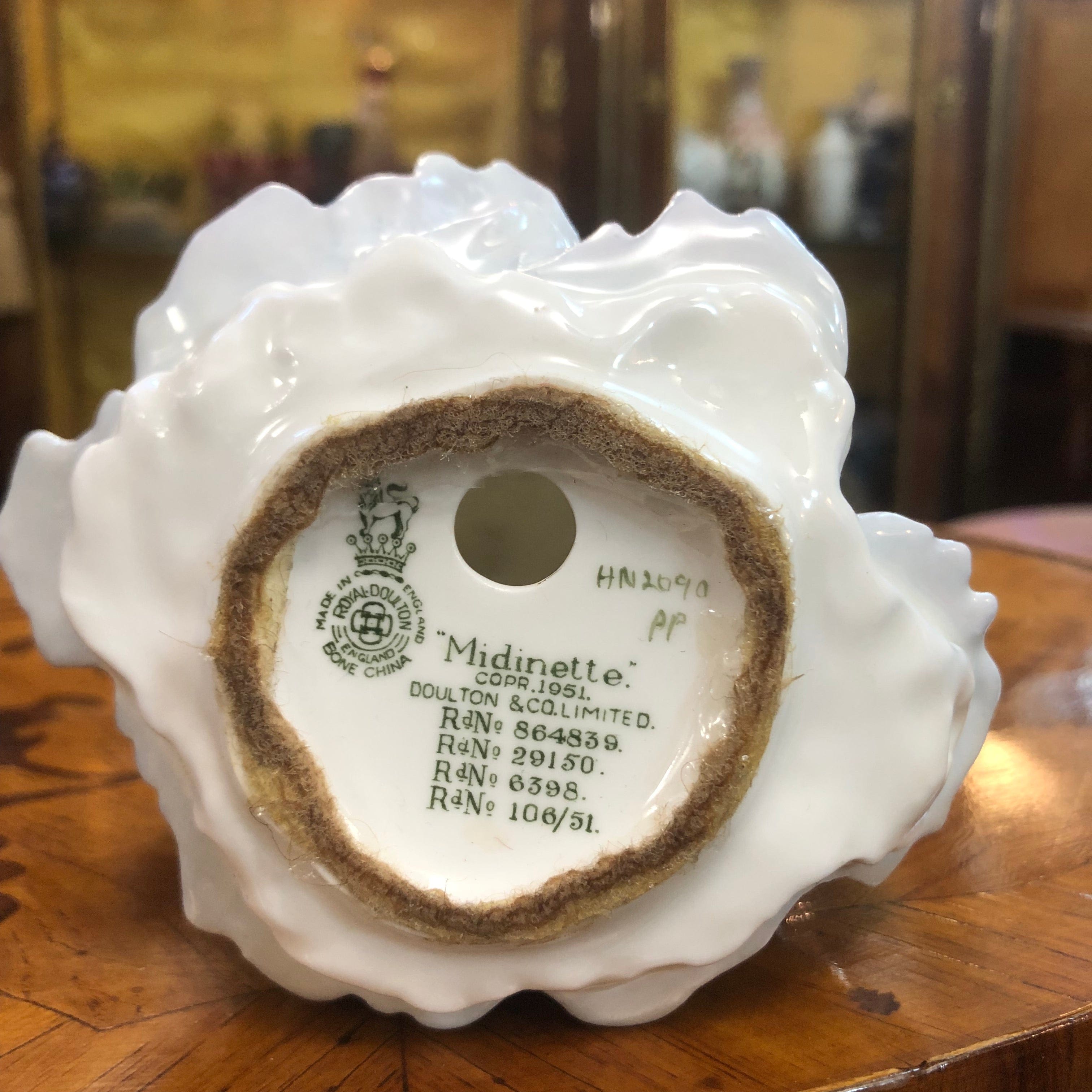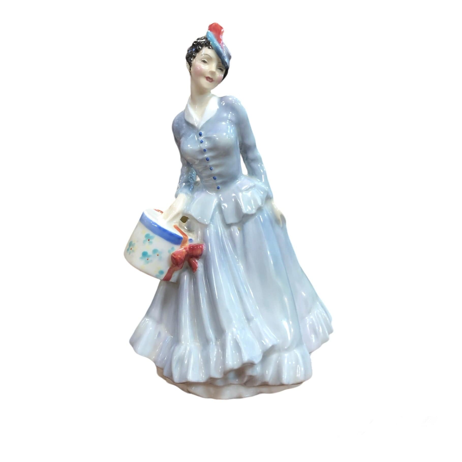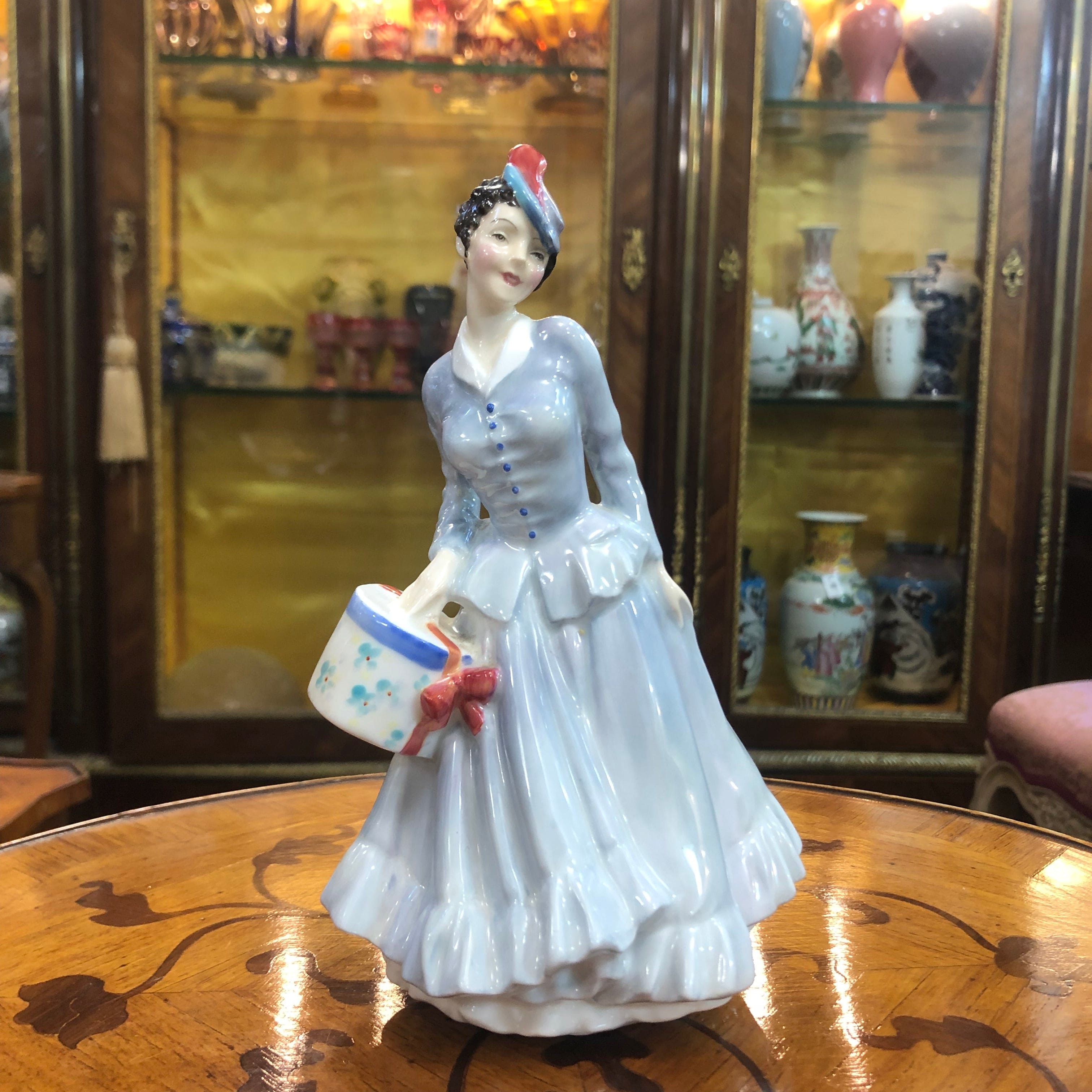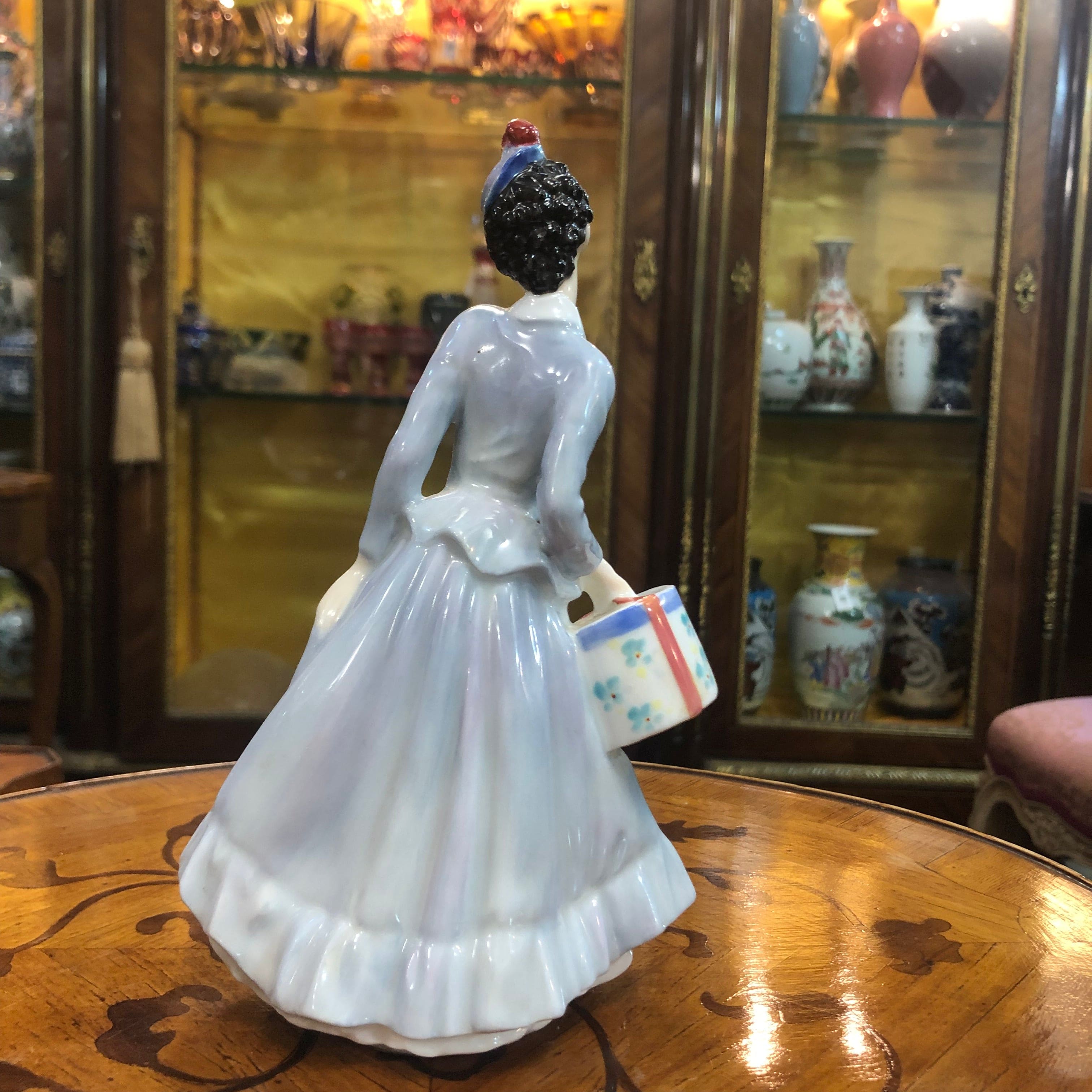 Figura de porcelana de la marca Royal Doulton, seriada y pintada a mano, representando a una mujer con dos fuentes con flores.