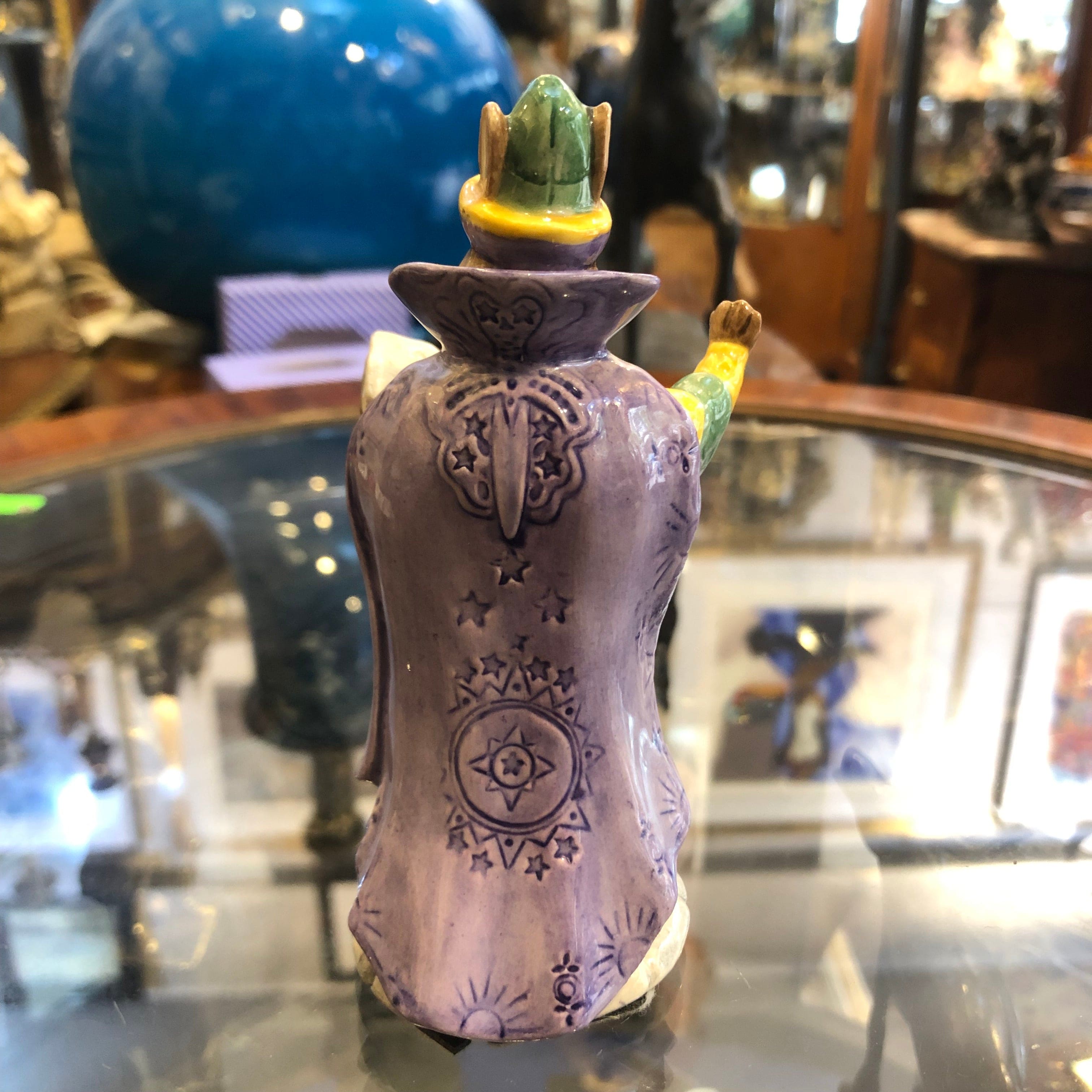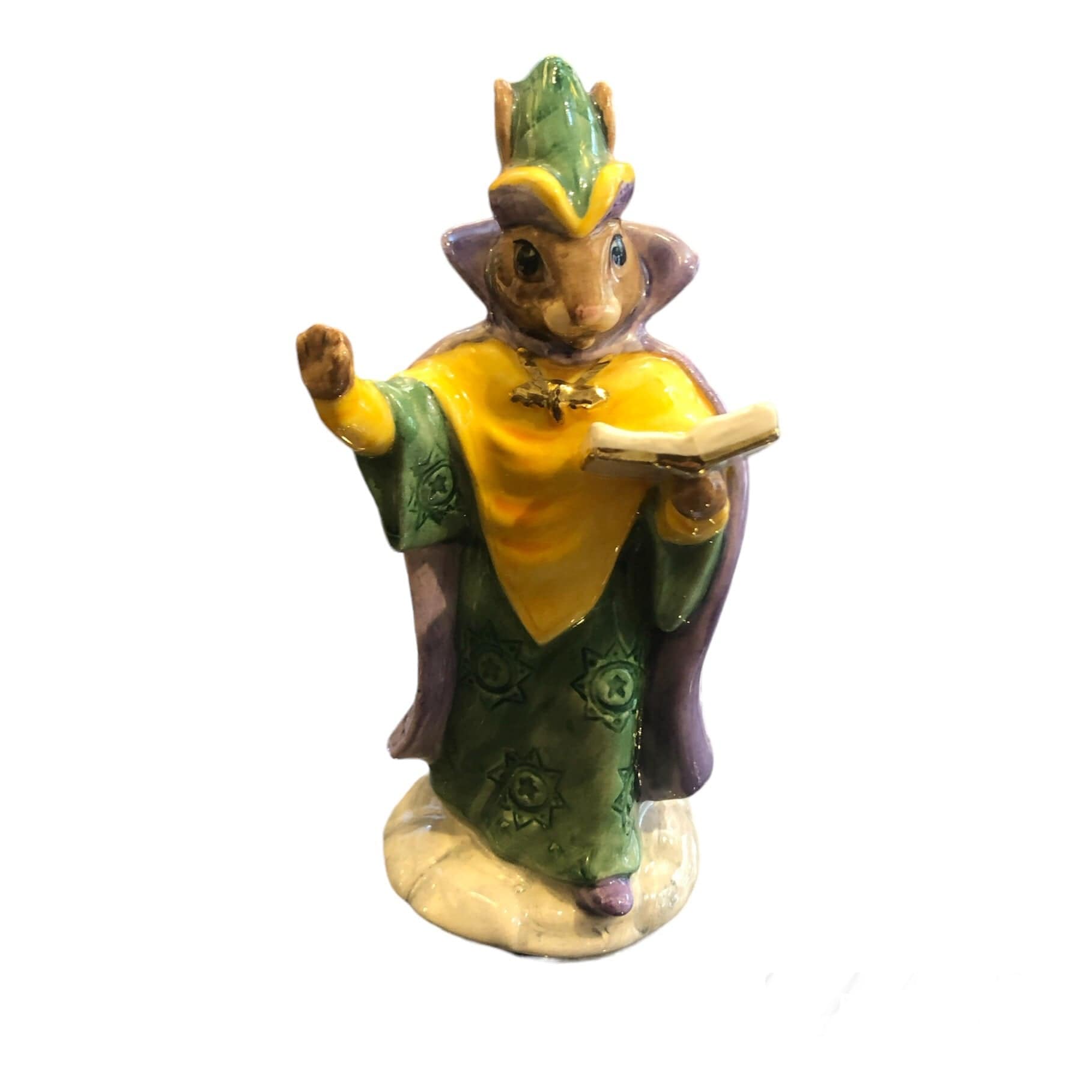 Hermosa figura de porcelana De la marca Royal Doulton, con forma de conejo, representando a un místico leyendo un libro, vestido con capa morada con delicado diseño.