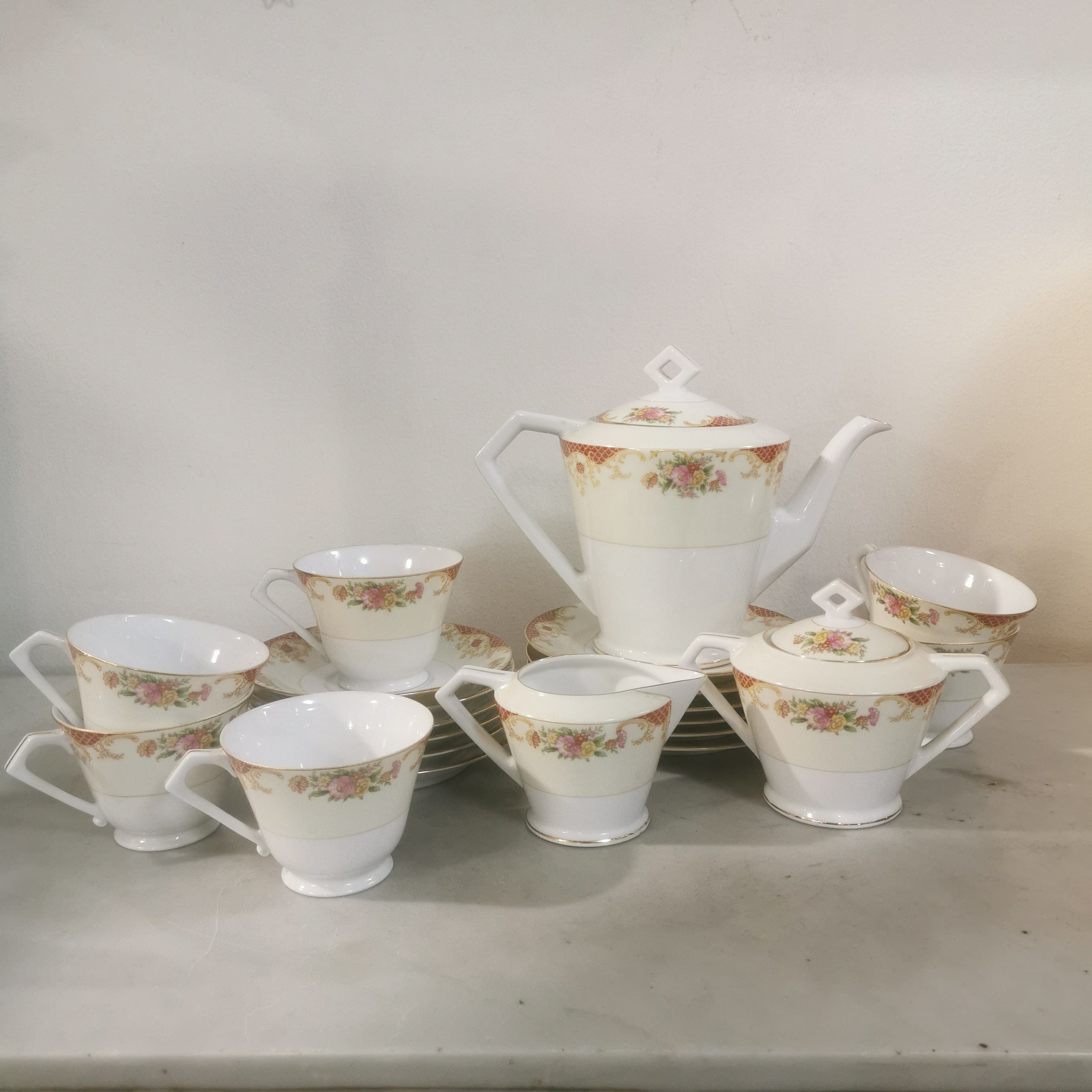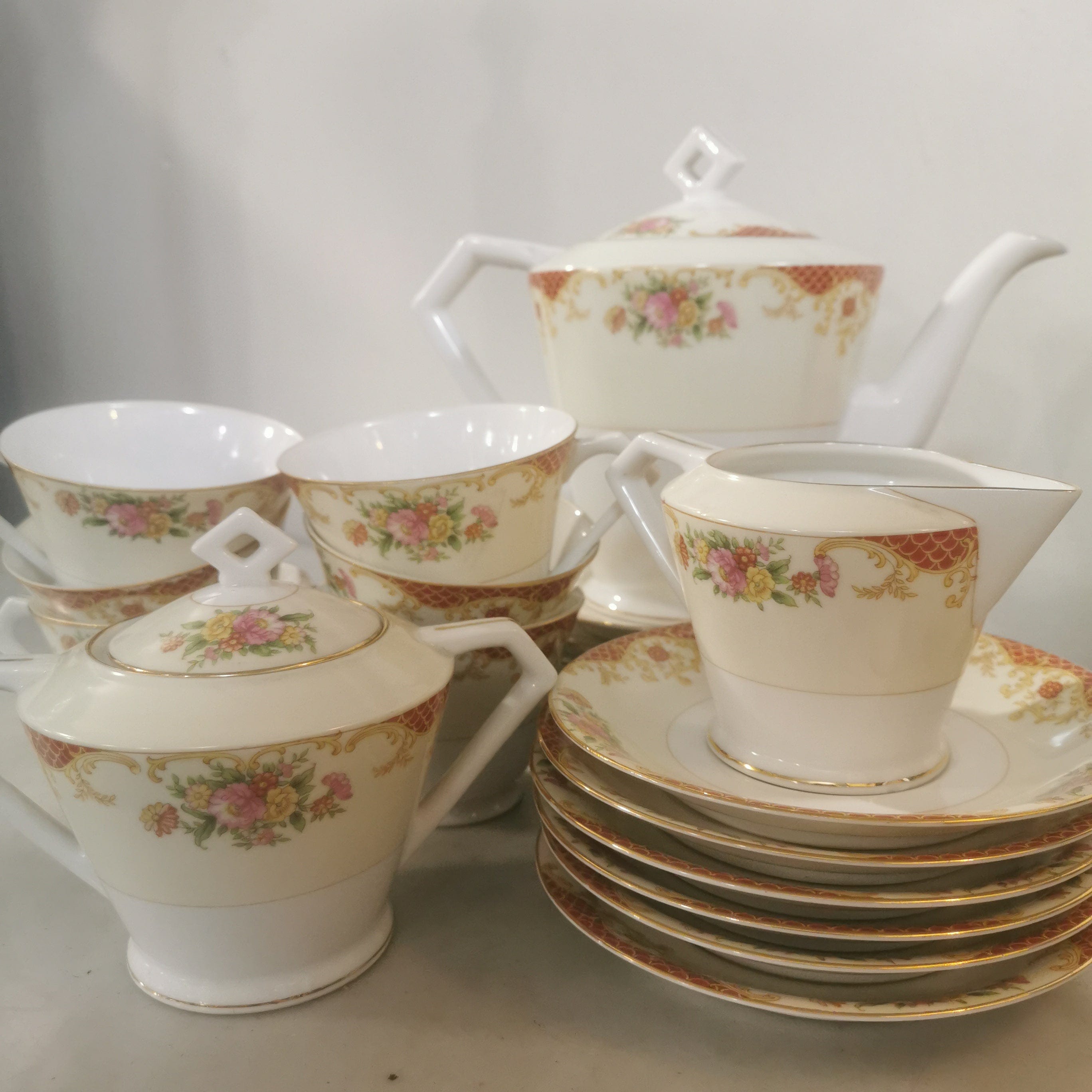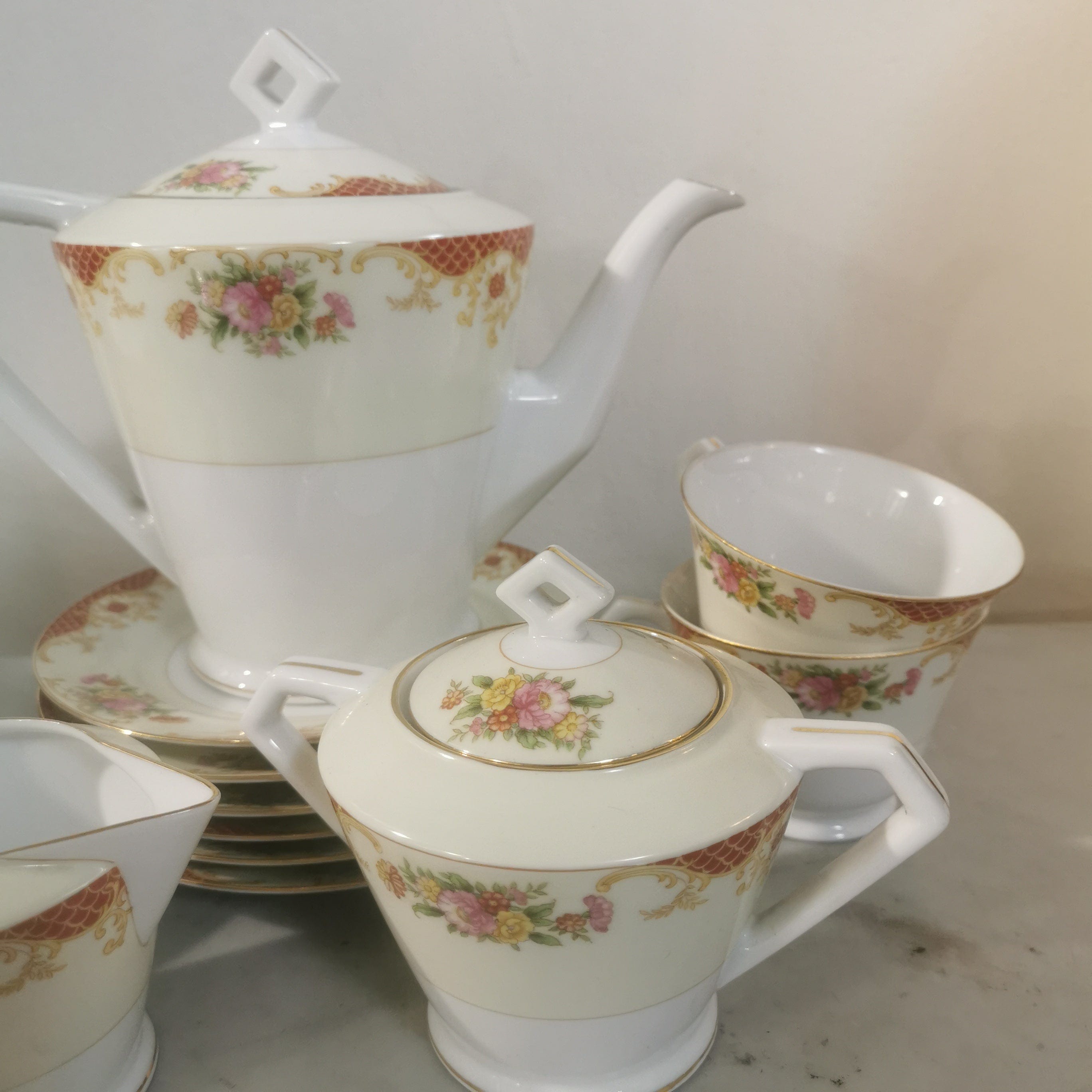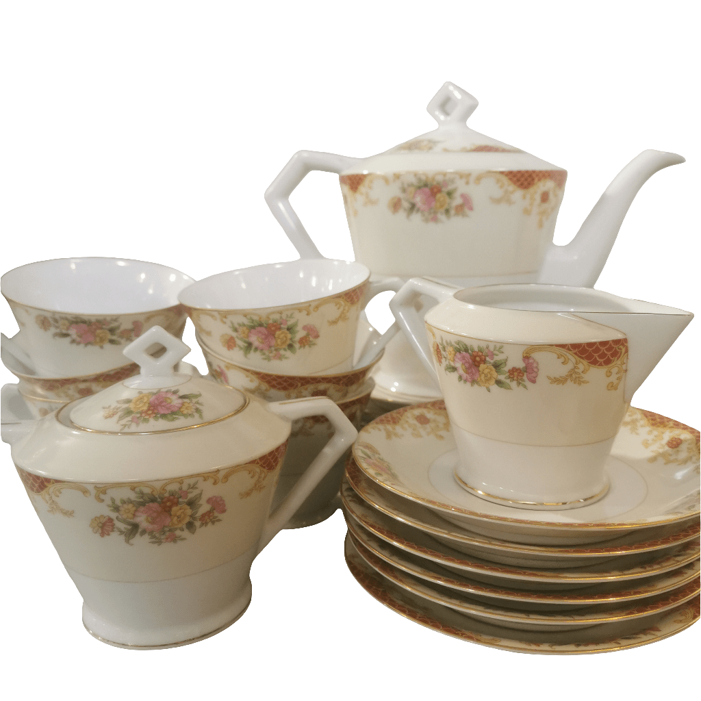Precioso conjunto de té de porcelana Noritake para seis personas . El conjunto tiene bellos motivos florales y finas líneas doradas.
