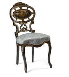 Silla de respaldo calado en madera moldurada y pintada negra con decoración burgauté; piernas curvadas; accidentes y faltas. Época Napoleón III.