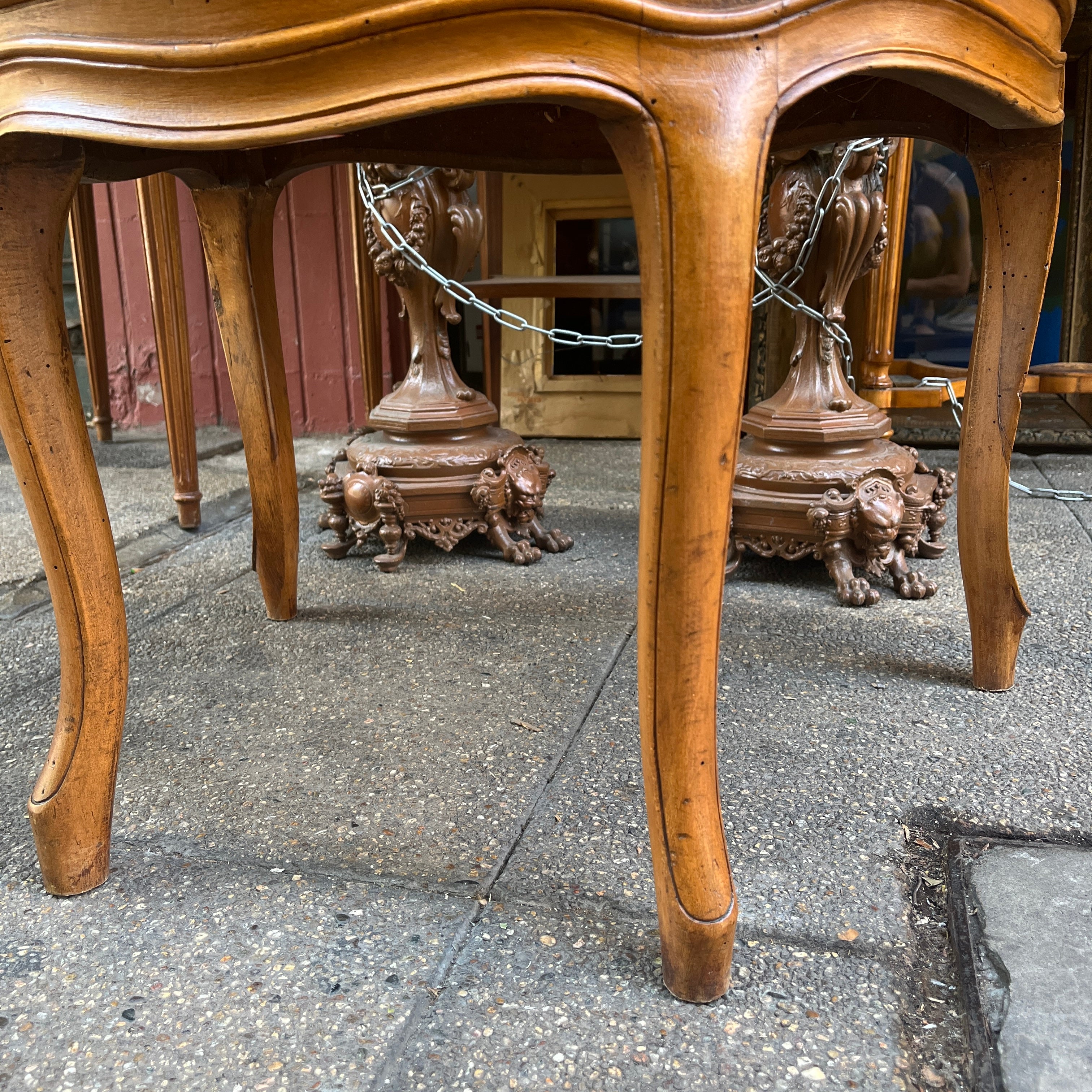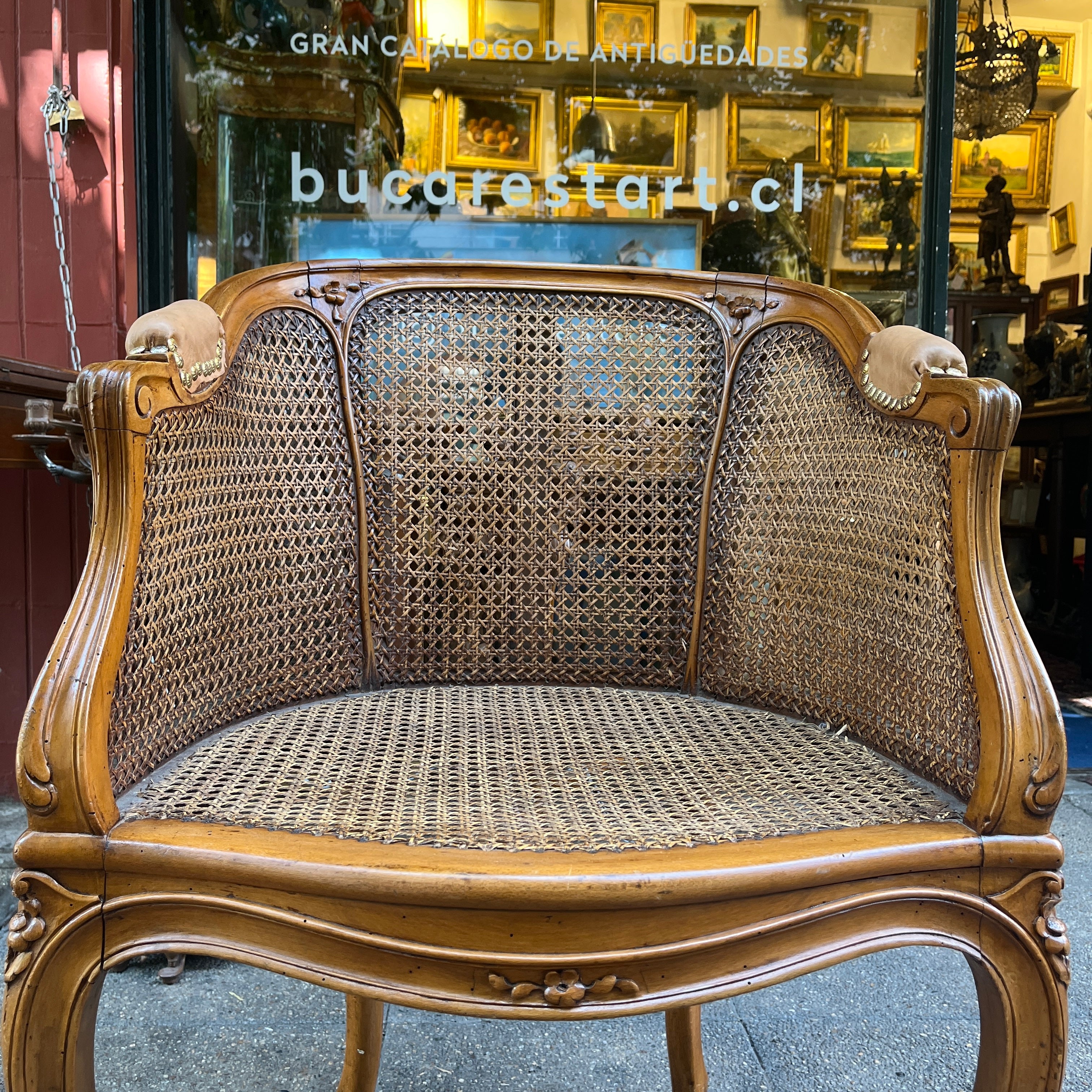 Bellísimo sitial francés estilo Luís XV de madera de haya rosa. Tiene un doble enjuncado original, el cual le entrega una particular firmeza. Los ensambles son con tarugos y en sus laterales tiene dos pequeñas almohadillas de cuero en tono rosa coronadas con clavetones de bronce, también originales y en perfectas condiciones. Es un sitial presumiblemente de las primeras décadas del siglo XX.