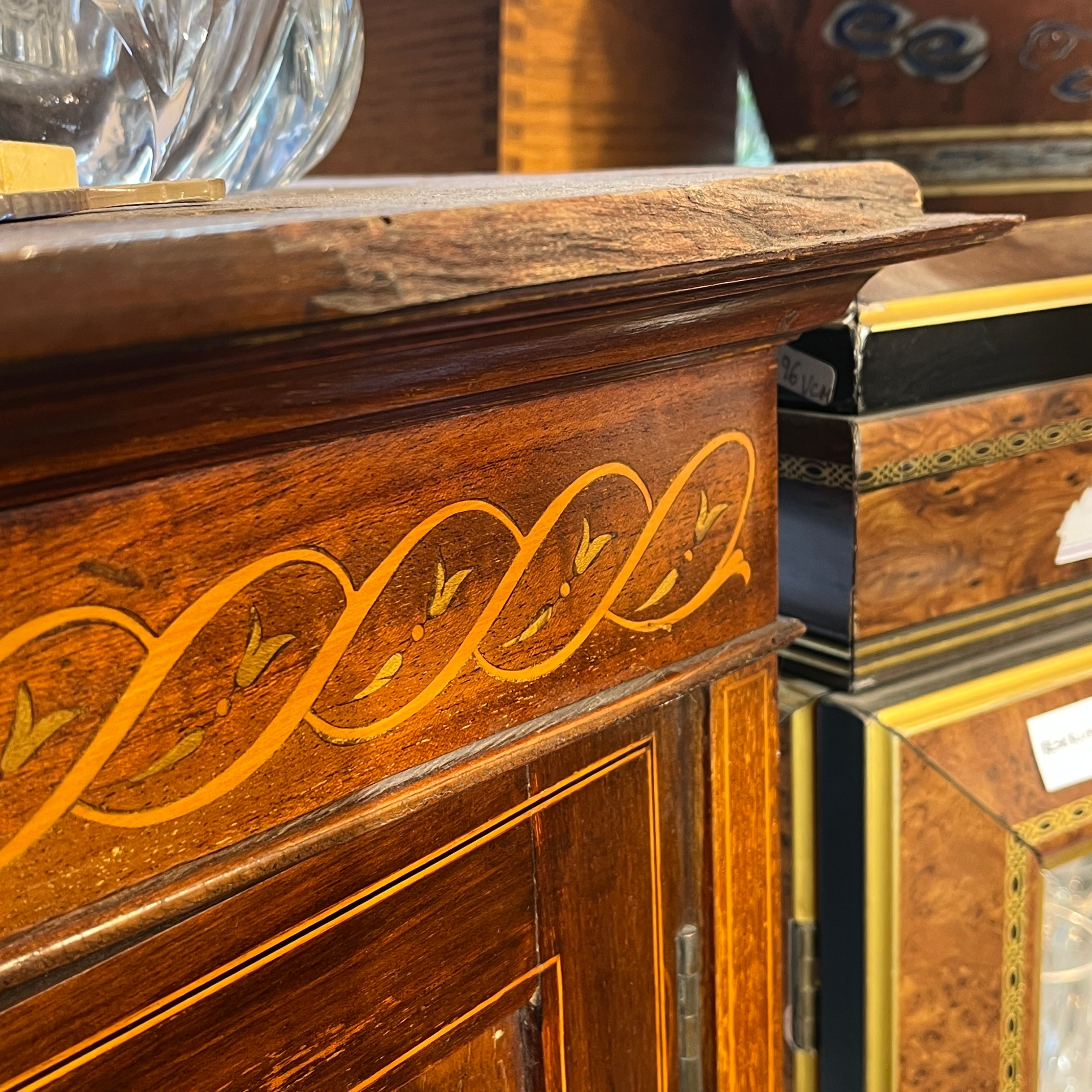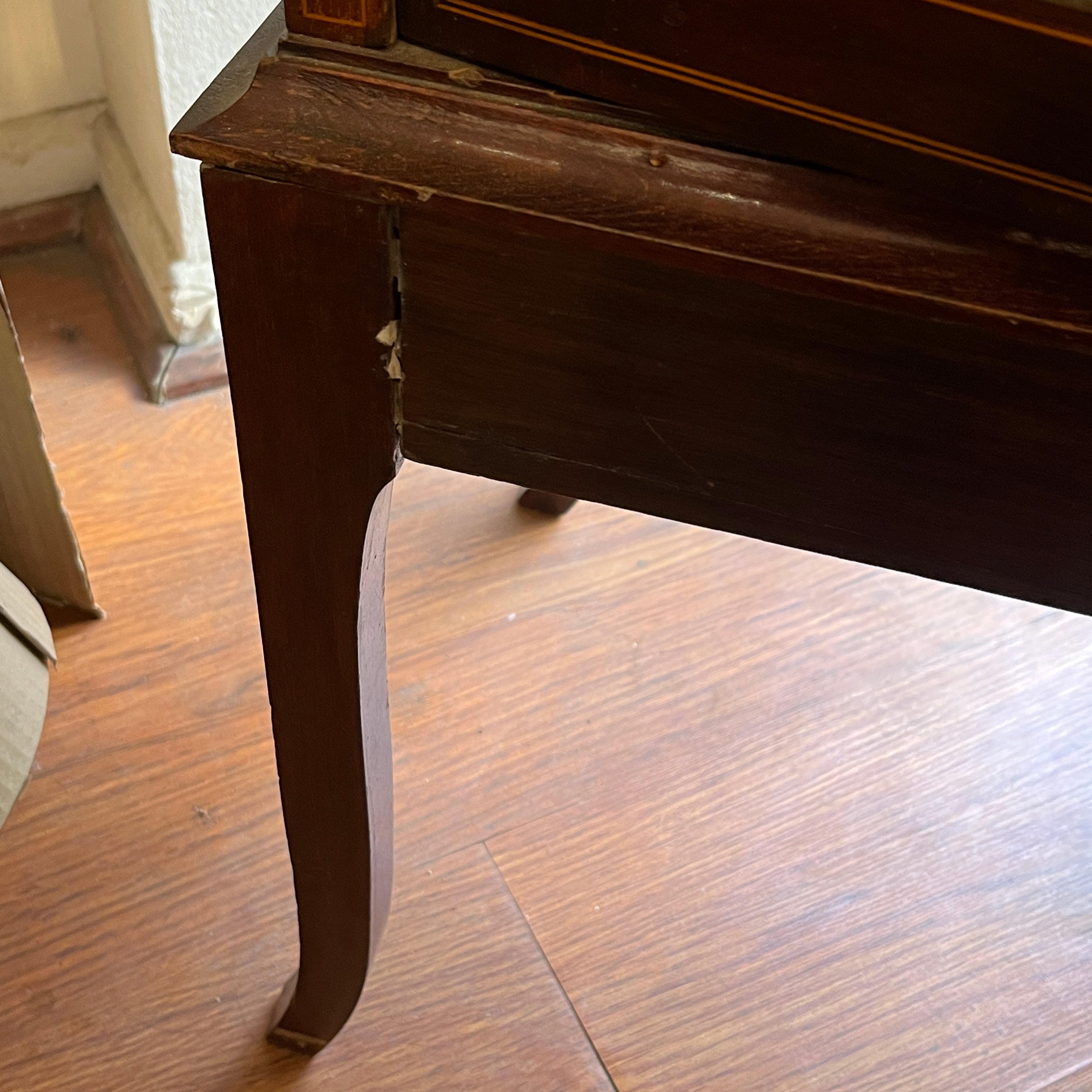 Vitrina inglesa estilo edwardian caoba marquetería e incrustaciones de madera sobre vidrio