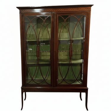 Hermosa vitrina de origen inglés estilo Edwardian, hecha de madera caoba y fina marquetería en madera frutal en su parte superior,  con diseño de guirnalda. Además, la pieza tiene un diseño típico del estilo Edwardian en su vidrio, con incrustaciones de madera curvas pintadas a mano. La pieza tiene un interior tapizado de una llamativa tela verde con textura bicolor, que combina muy bien con el color de la madera, y dos repisas para exhibir.