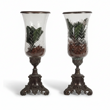 Par de candelabros franceses de bronce y tulipa de vidrio tallado fotóforos circa 1850