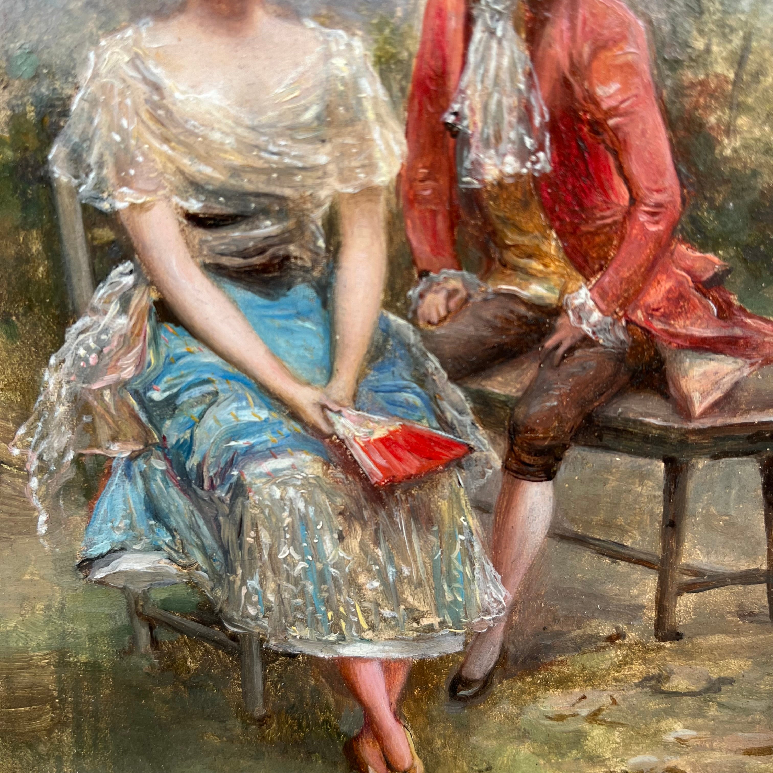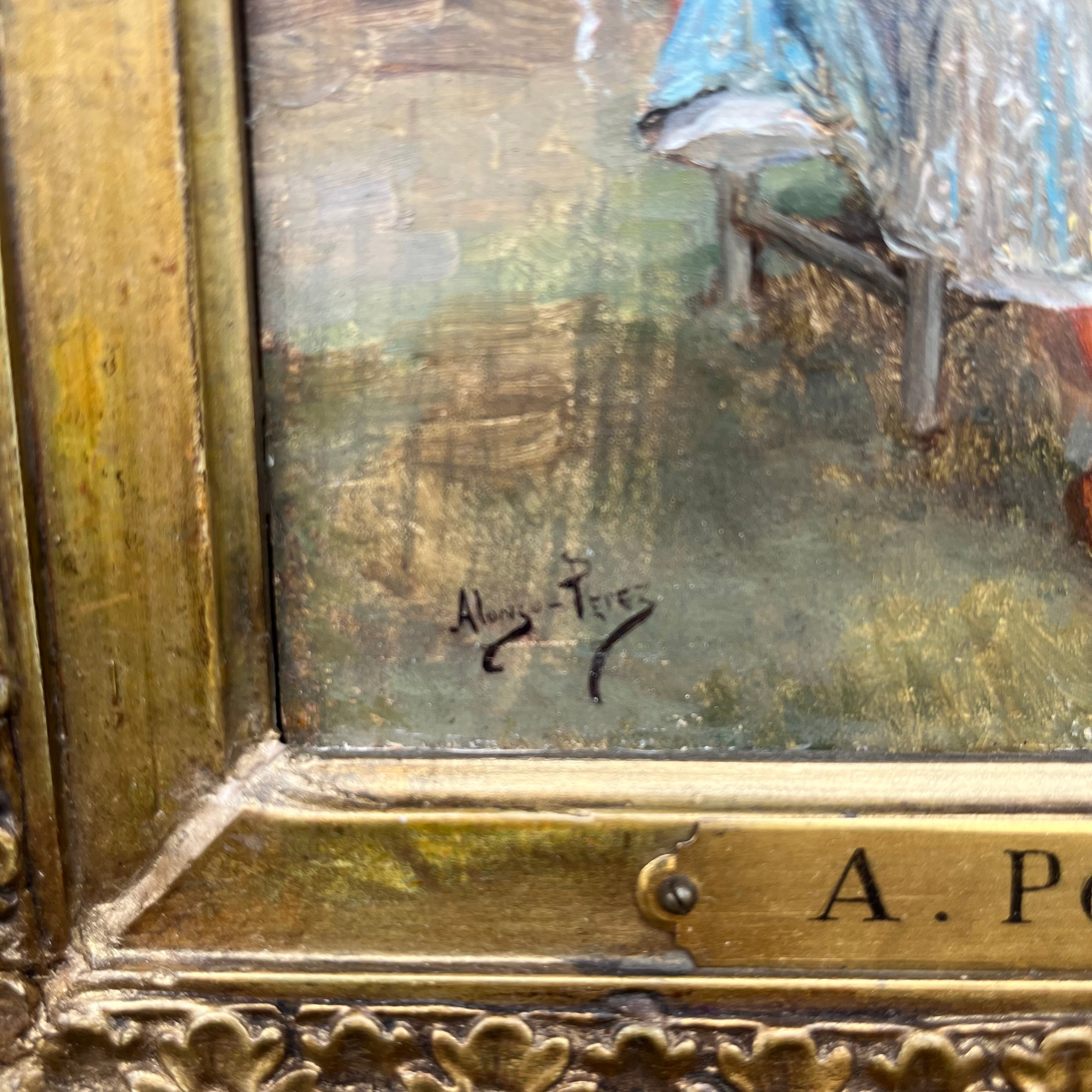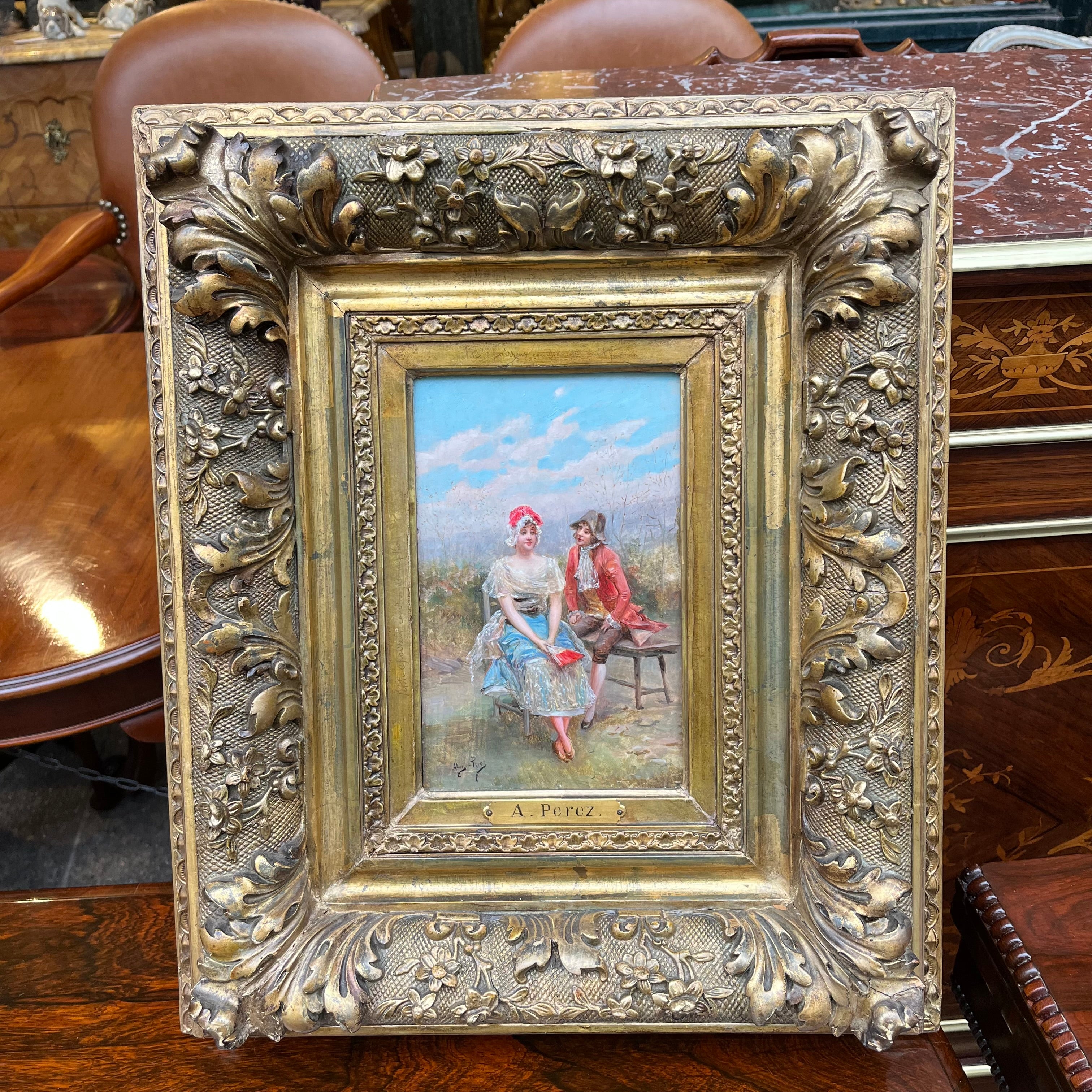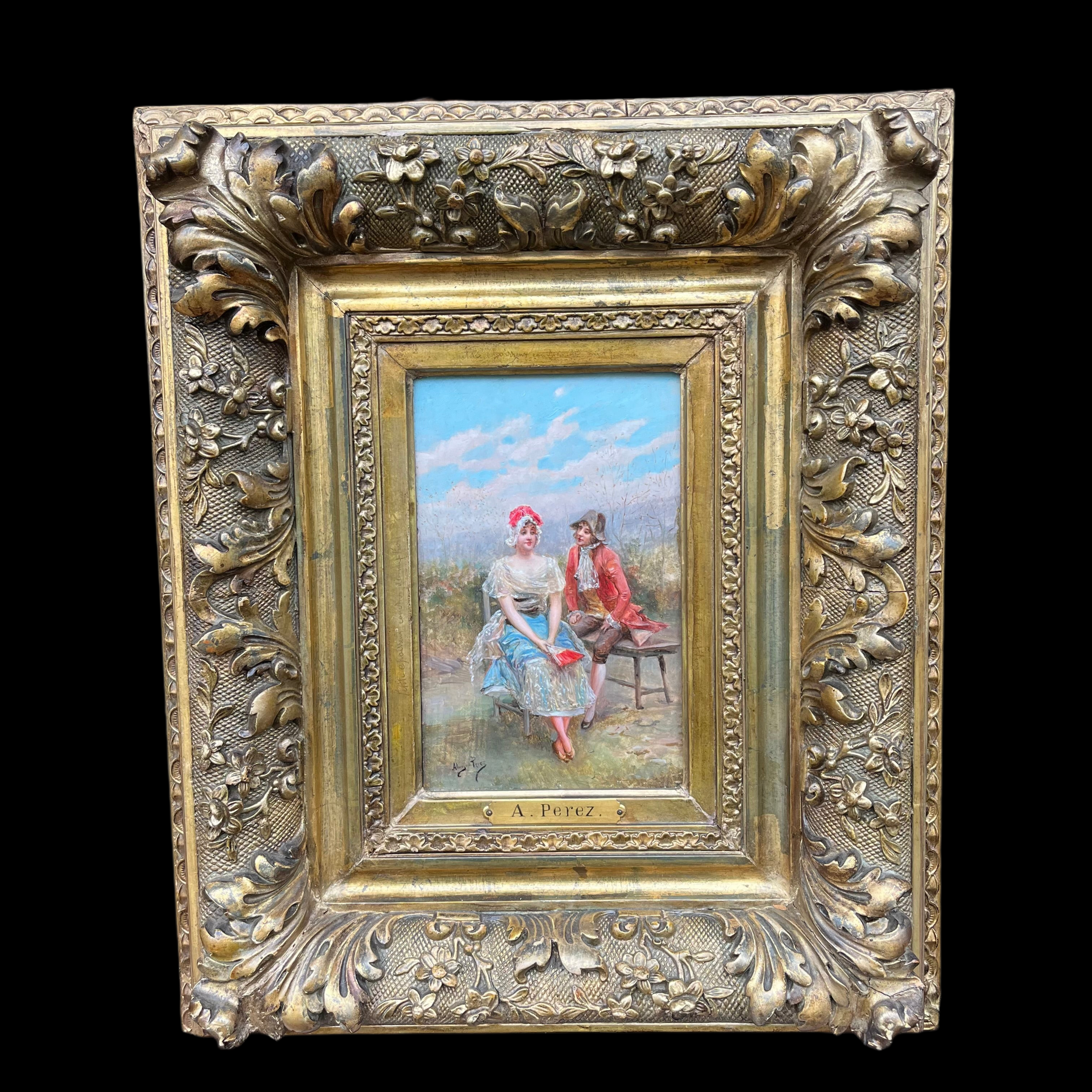 Óleo sobre madera del artista español Alonso Pérez (1881 - 1914), representando a una dama sentada en un jardín, mirando hacia el frente, junto a un caballero. El parece estar diciéndole algo, pero ella no lo mira, sino que mantiene su pose. La escena está detalladamente pintada, capturando con delicadeza no solo las texturas de los encajes y vuelos de su vestido, los dobleces de las telas y los gestos de los personajes, sino que las texturas del paisaje y el cielo. La obra tiene un grandioso marco de madera tallada en relieves, terminada en una elegante pintura dorada.